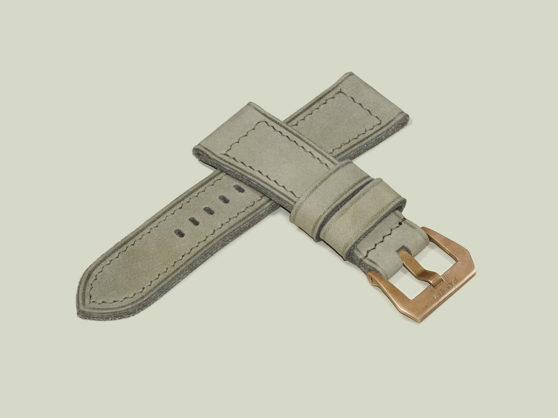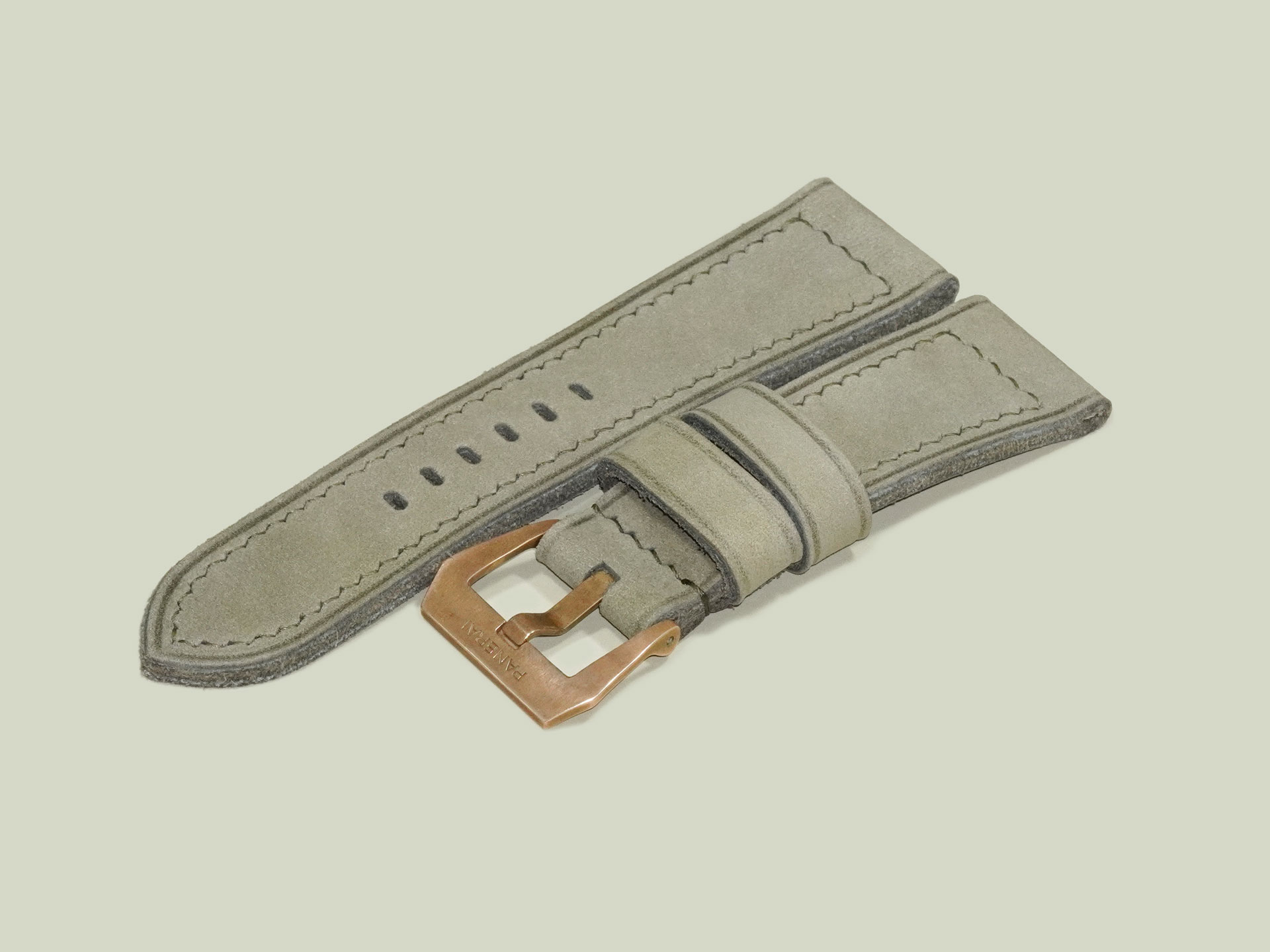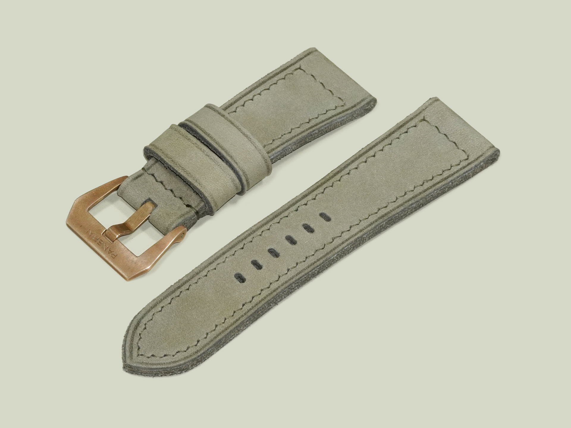 I completed the stitching in a boxed pattern using olive green thread. The buckle in the photos is the OEM bronze buckle from the PAM00968, but it’s not included with the strap. You can use your own OEM buckle or choose a different option from the dropdown menu. This lets you pair the strap with other Panerai models as well.