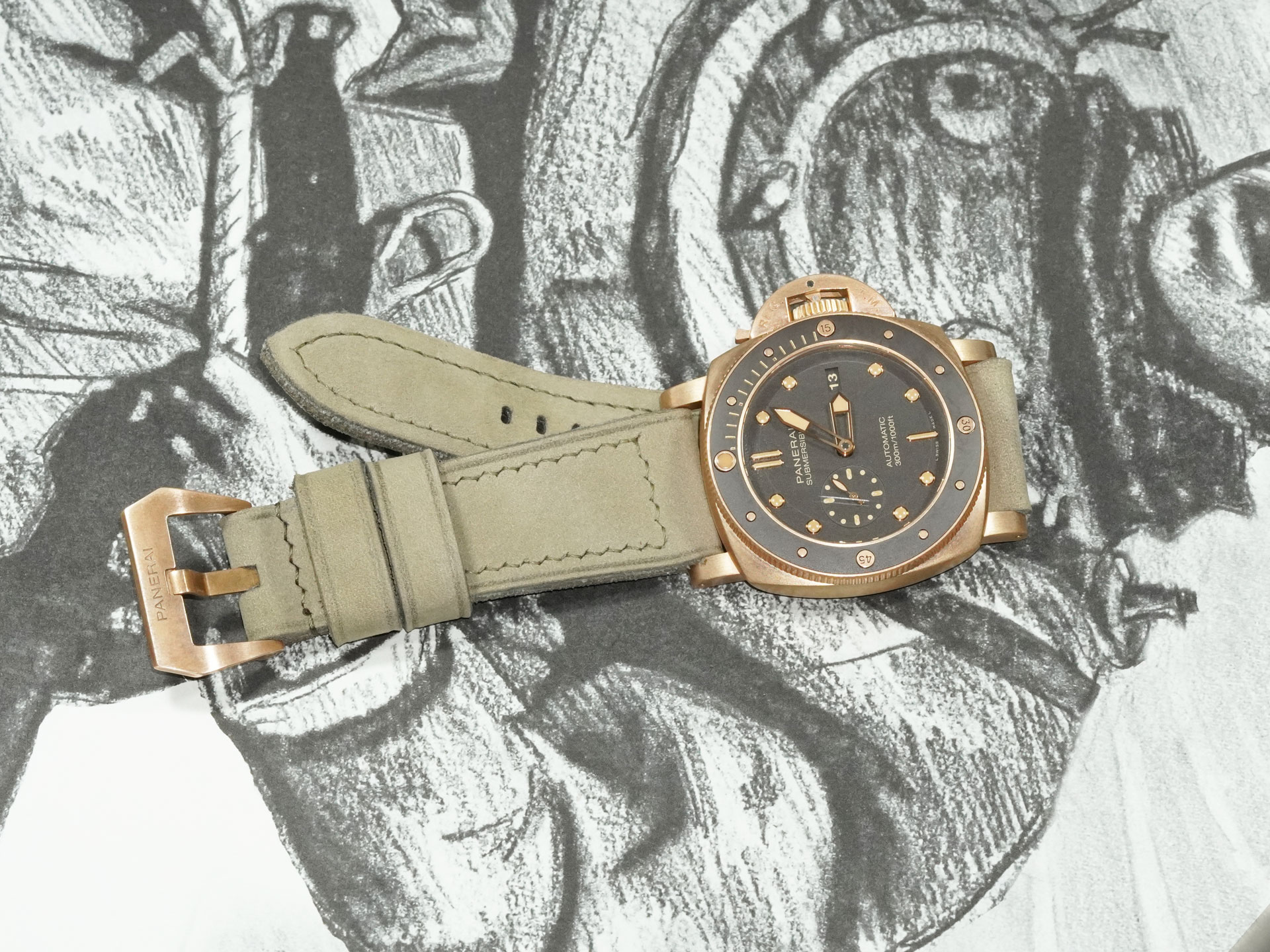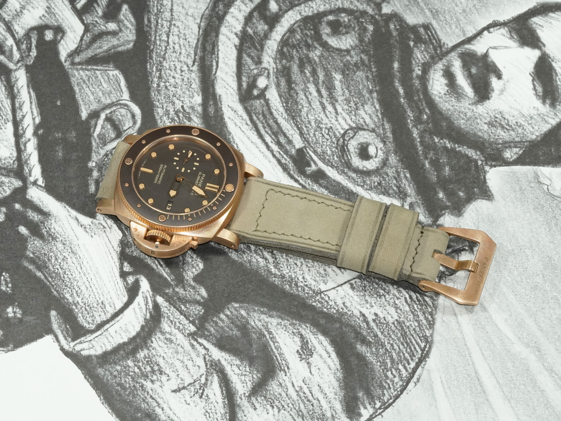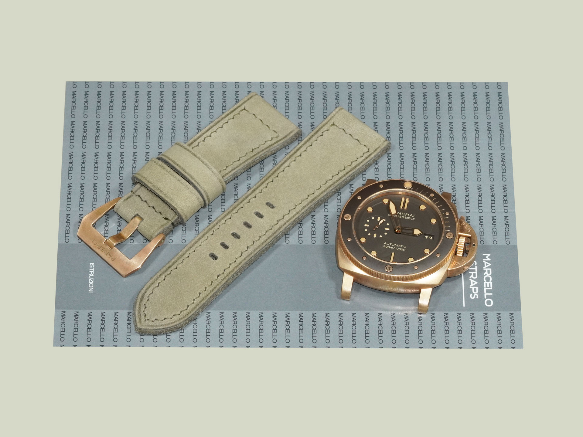 I’ve shown the strap here on the PAM00968. The matte green tone contrasts beautifully with the oxidized bronze case and pairs well with dials in beige, tobacco, or even black. This strap adds a sophisticated, earthy edge to the Bronzo’s rugged design.