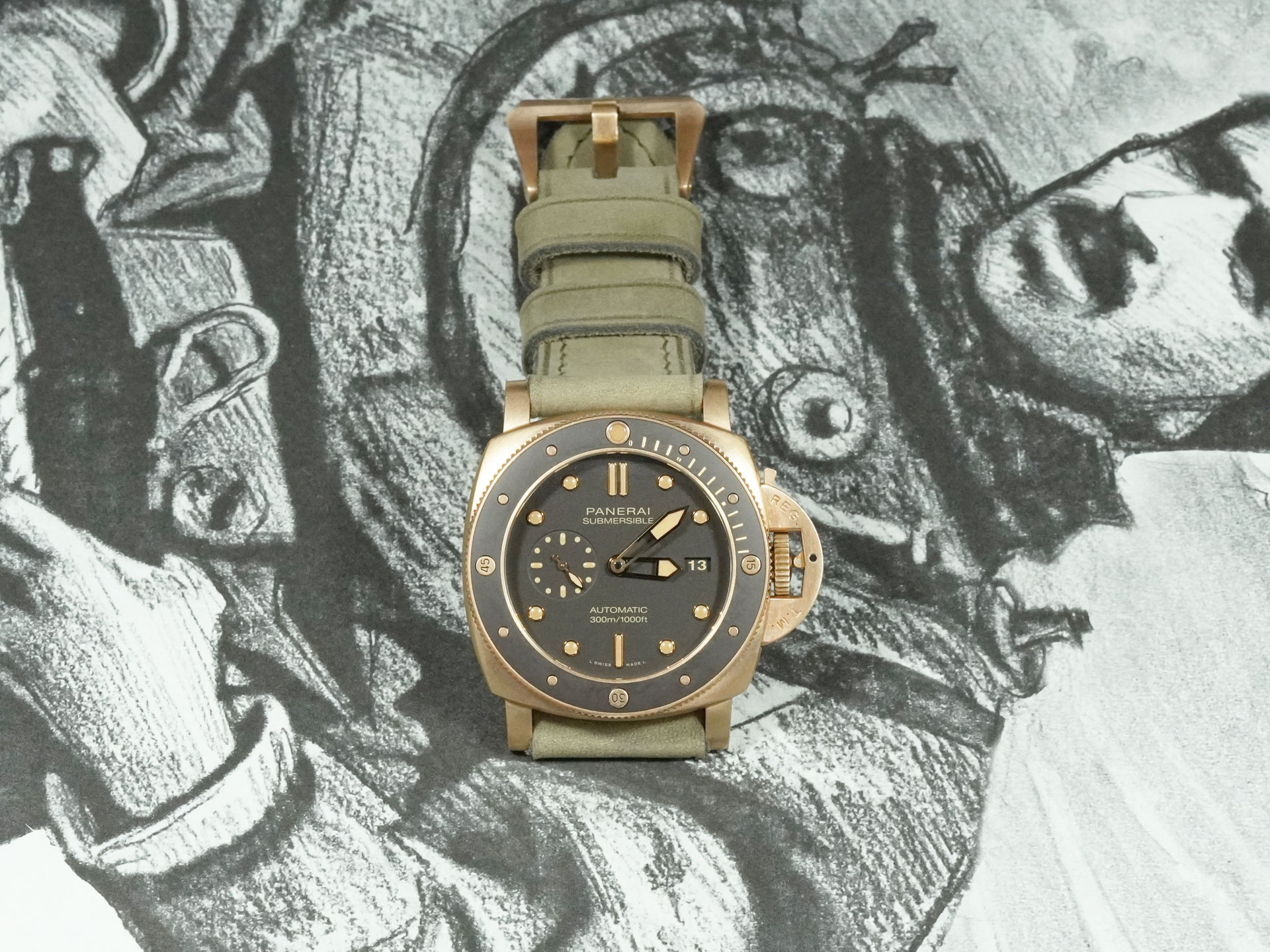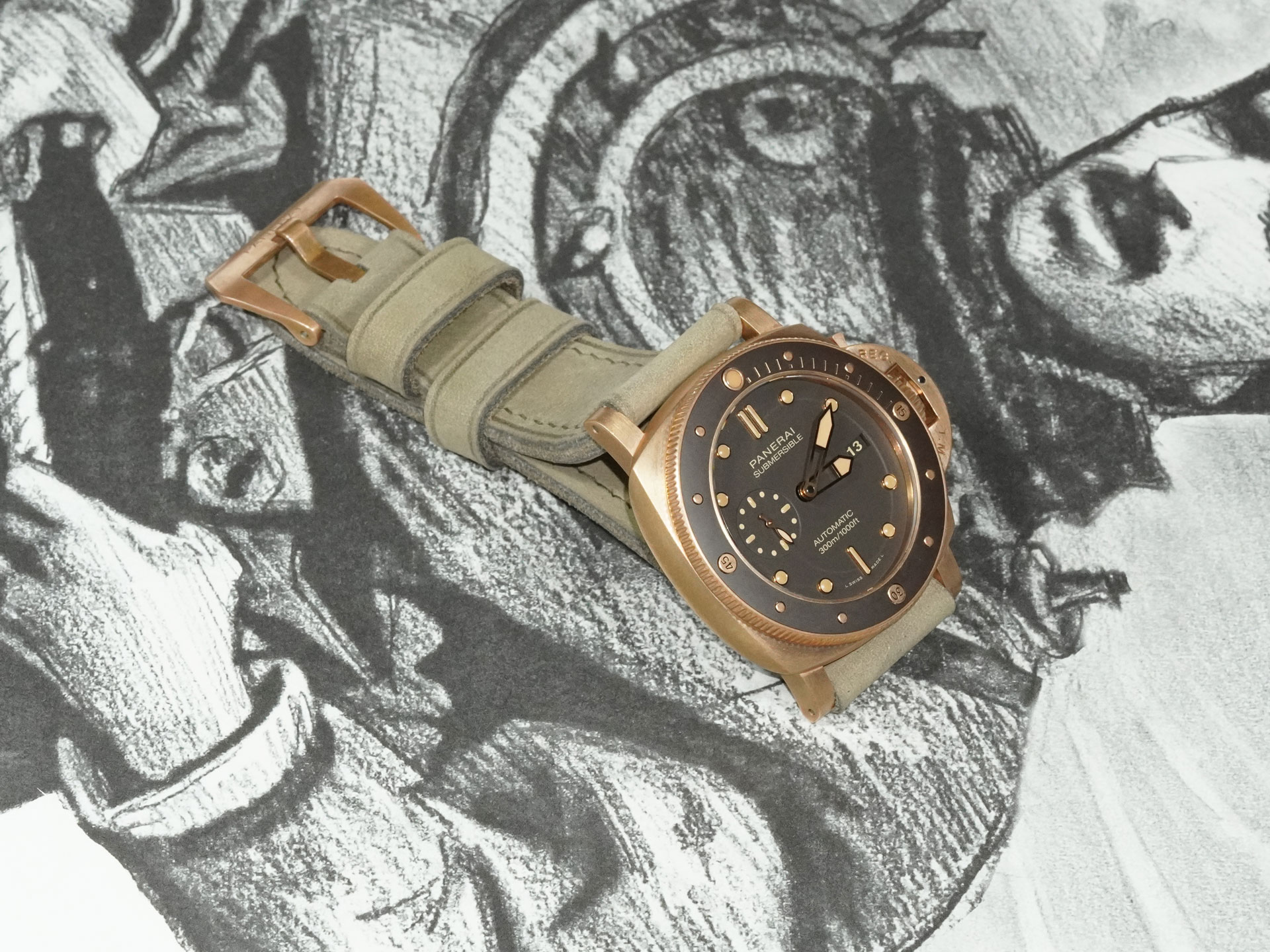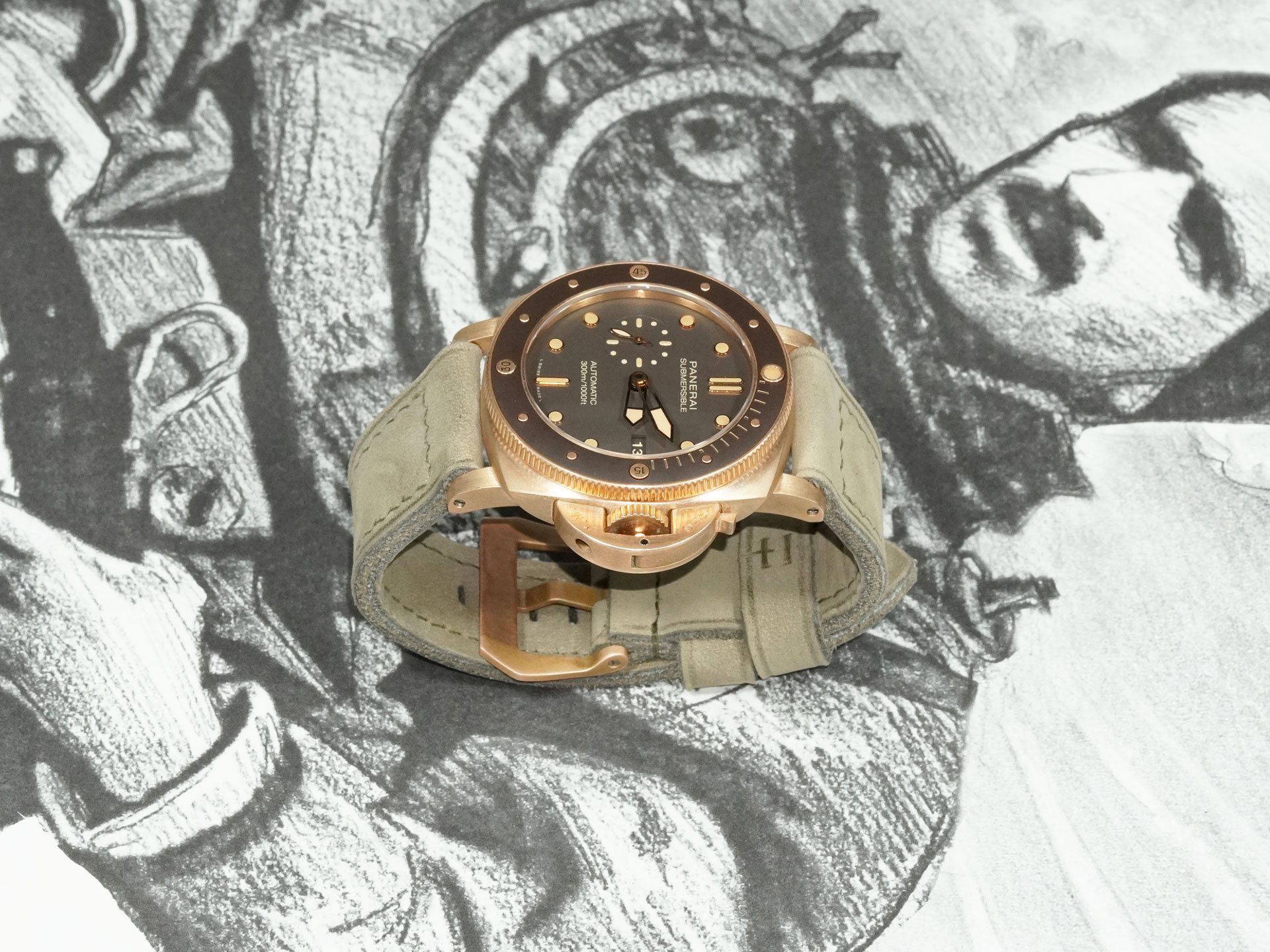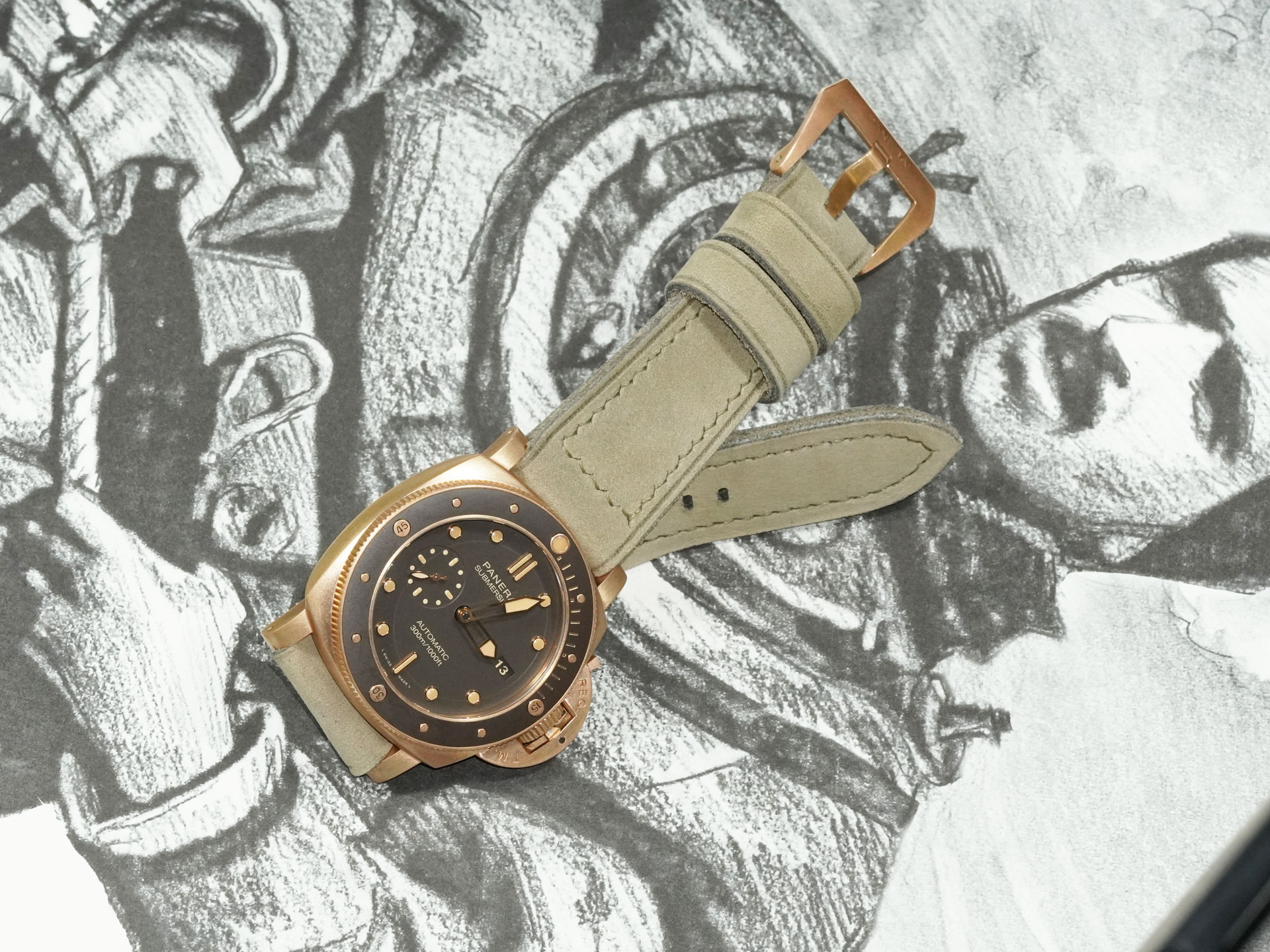 I’ve shown the strap here on the PAM00968. The matte green tone contrasts beautifully with the oxidized bronze case and pairs well with dials in beige, tobacco, or even black. This strap adds a sophisticated, earthy edge to the Bronzo’s rugged design.