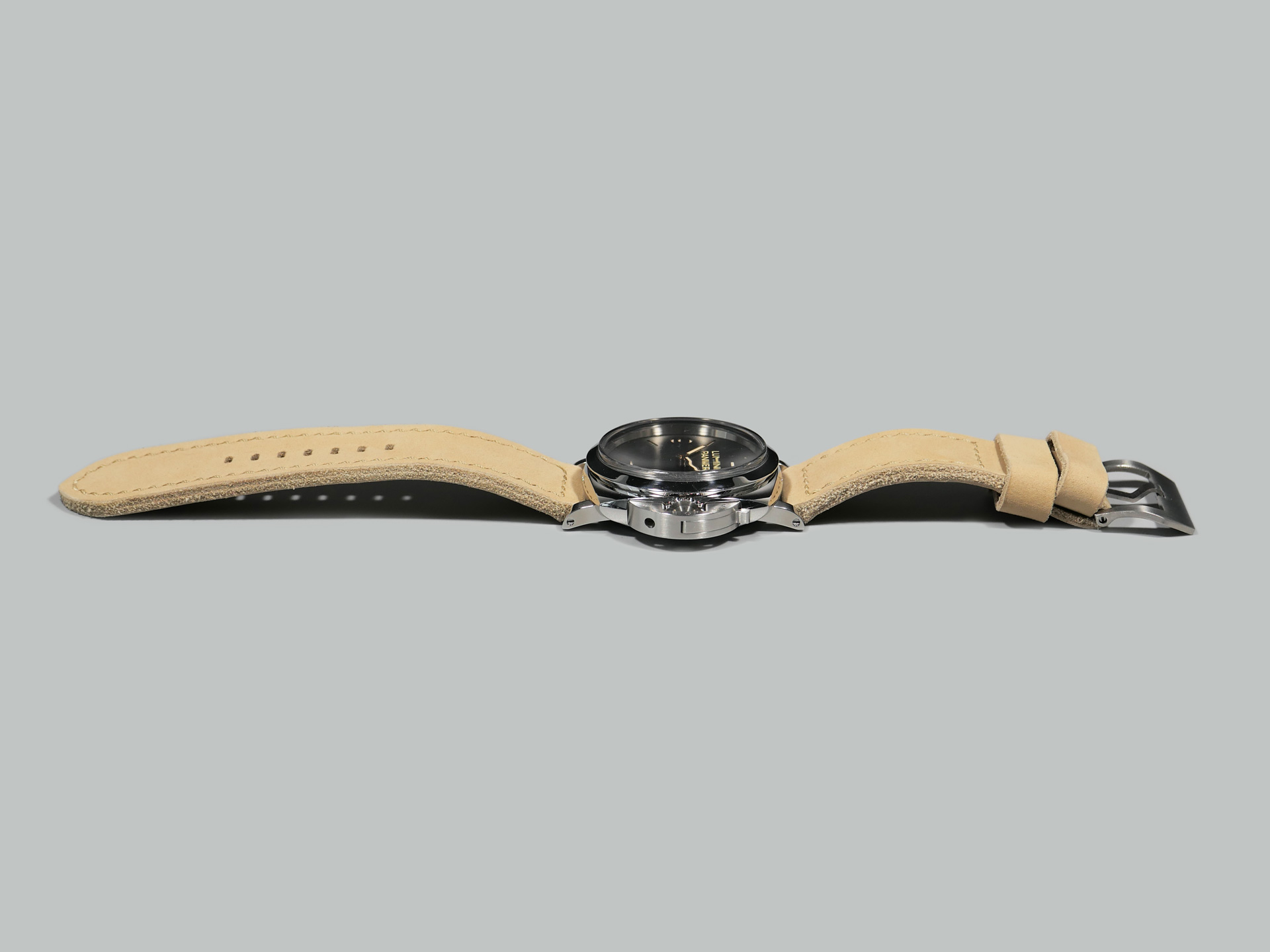 Pictured above, you may see this unique strap on the Panerai Luminor PAM00372 with an optional brushed trapezoidal buckle. *Advisory: This strap is vulnerable to stains due to it’s light color and it’s suede-like finish.