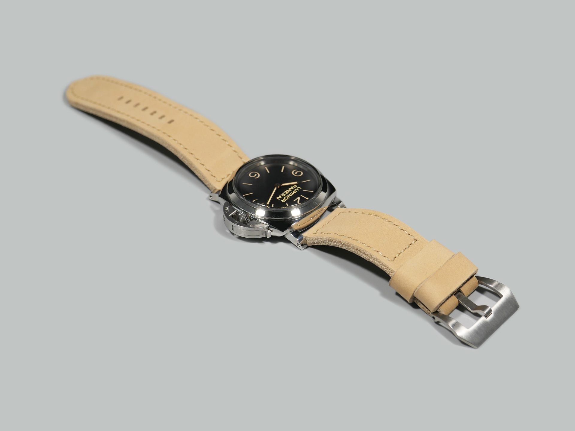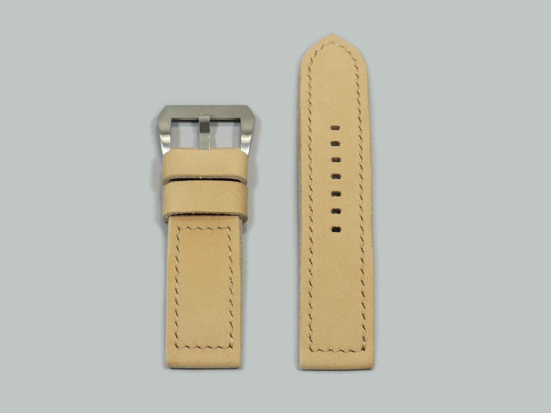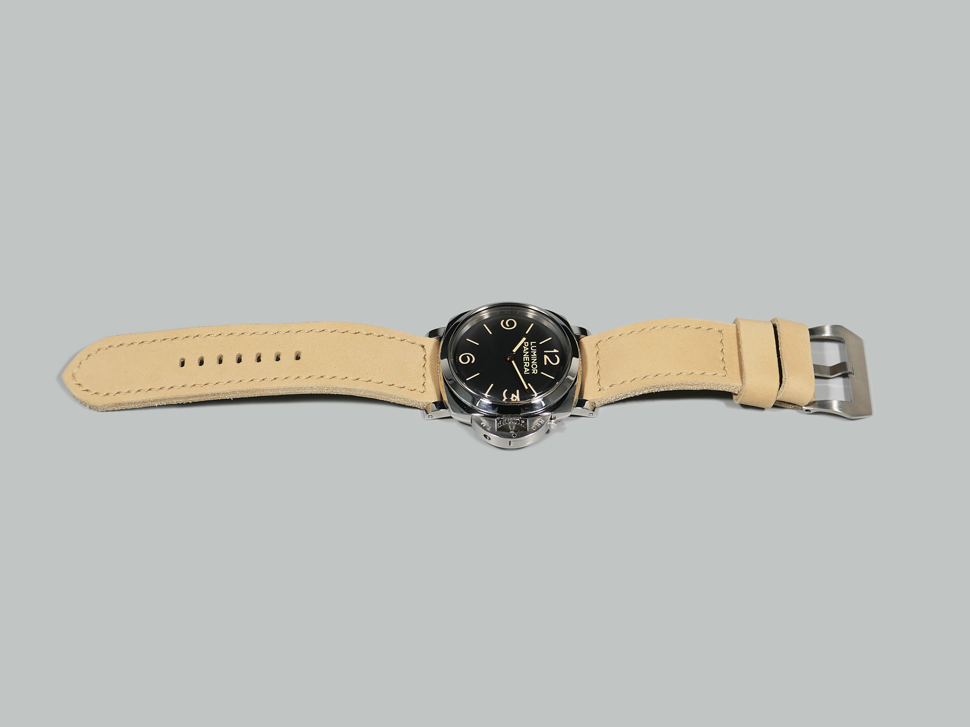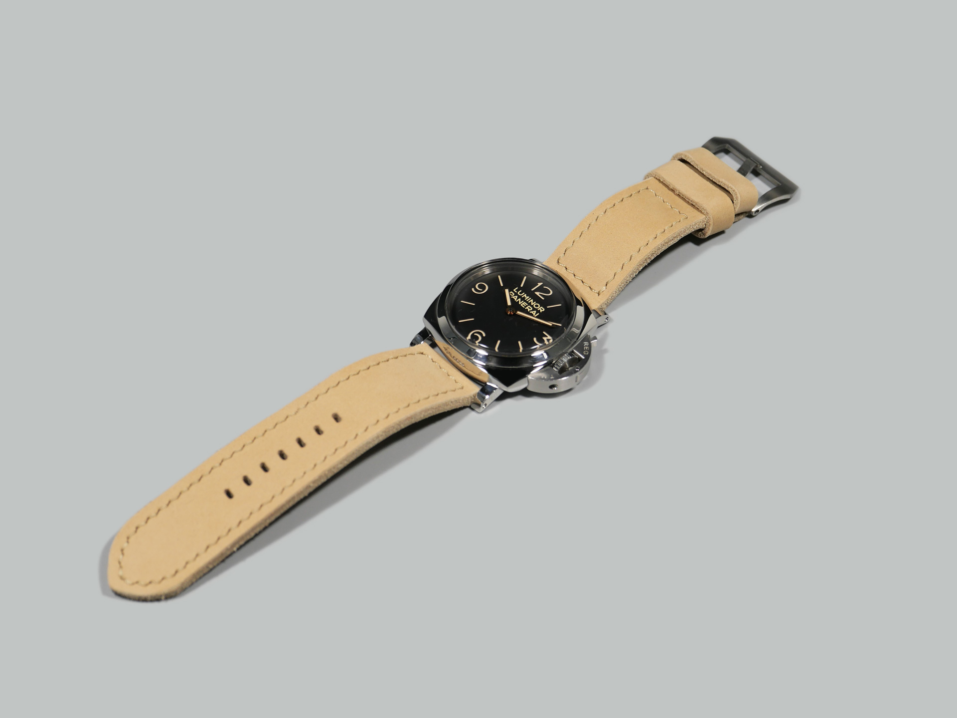 About the Leather:Â This uncommon suede cream Panerai 47mm strap is the softest, most luxurious strap ever produced for the 47mm Luminor. This is an ultra soft chrome tanned leather with a matte cream finish. The leather is smooth and soft on the surface. The temper of this leather is very soft, so it will wear comfortably on your wrist. This cream white Panerai 47mm strap features beige stitching that nicely blends with the cream surface color of the leather. I have tested this strap on several models. It looks brilliant on models with traditional green indications, as well as contemporary models with beige indications.