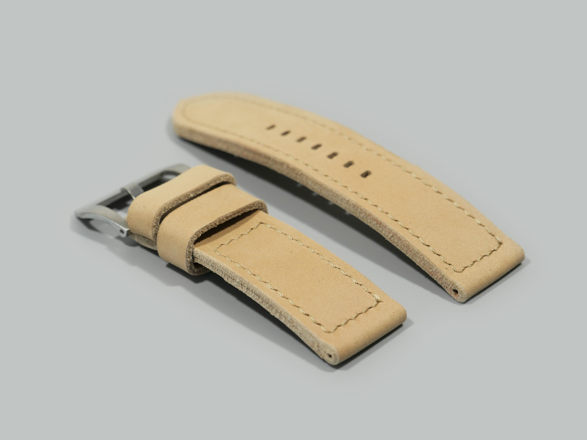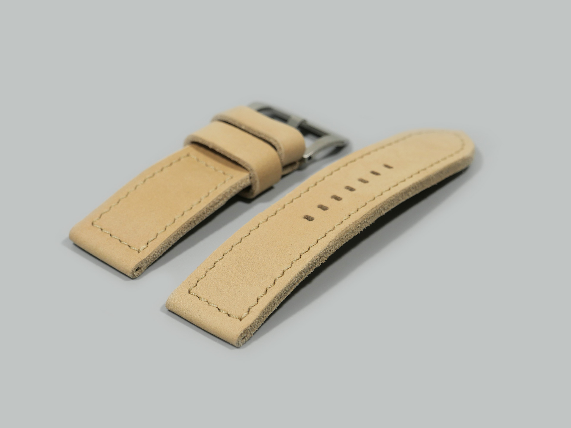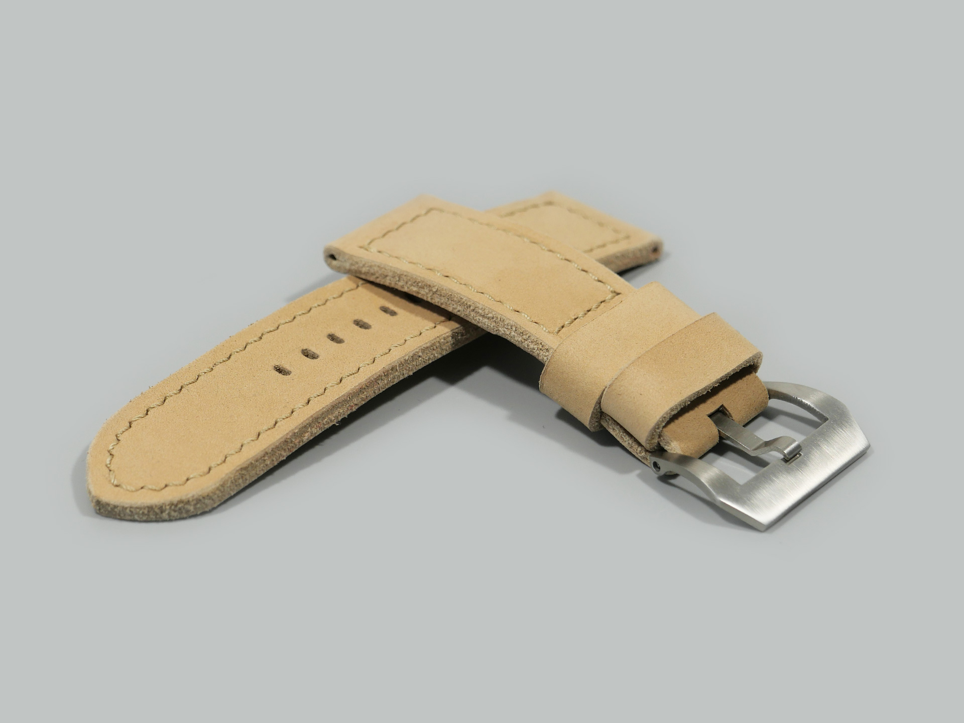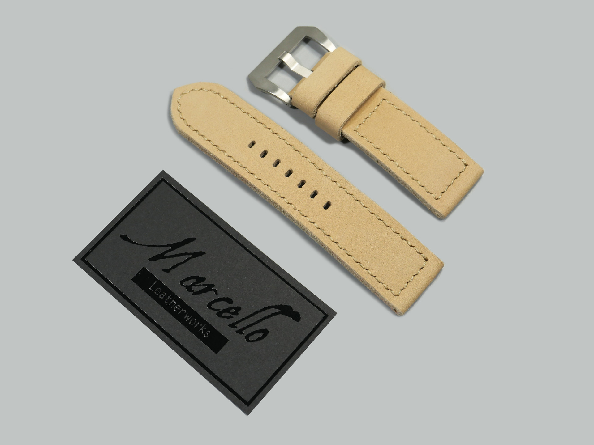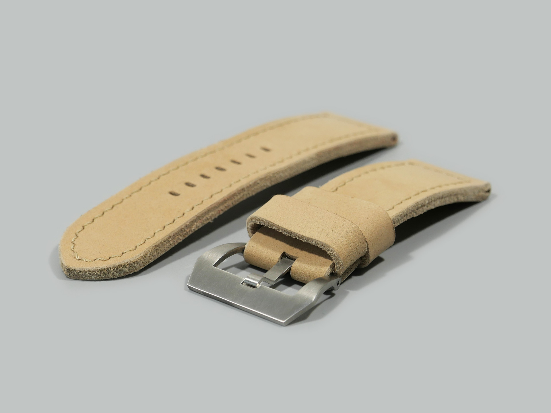 About the Leather:Â This uncommon suede cream Panerai 47mm strap is the softest, most luxurious strap ever produced for the 47mm Luminor. This is an ultra soft chrome tanned leather with a matte cream finish. The leather is smooth and soft on the surface. The temper of this leather is very soft, so it will wear comfortably on your wrist. This cream white Panerai 47mm strap features beige stitching that nicely blends with the cream surface color of the leather. I have tested this strap on several models. It looks brilliant on models with traditional green indications, as well as contemporary models with beige indications.