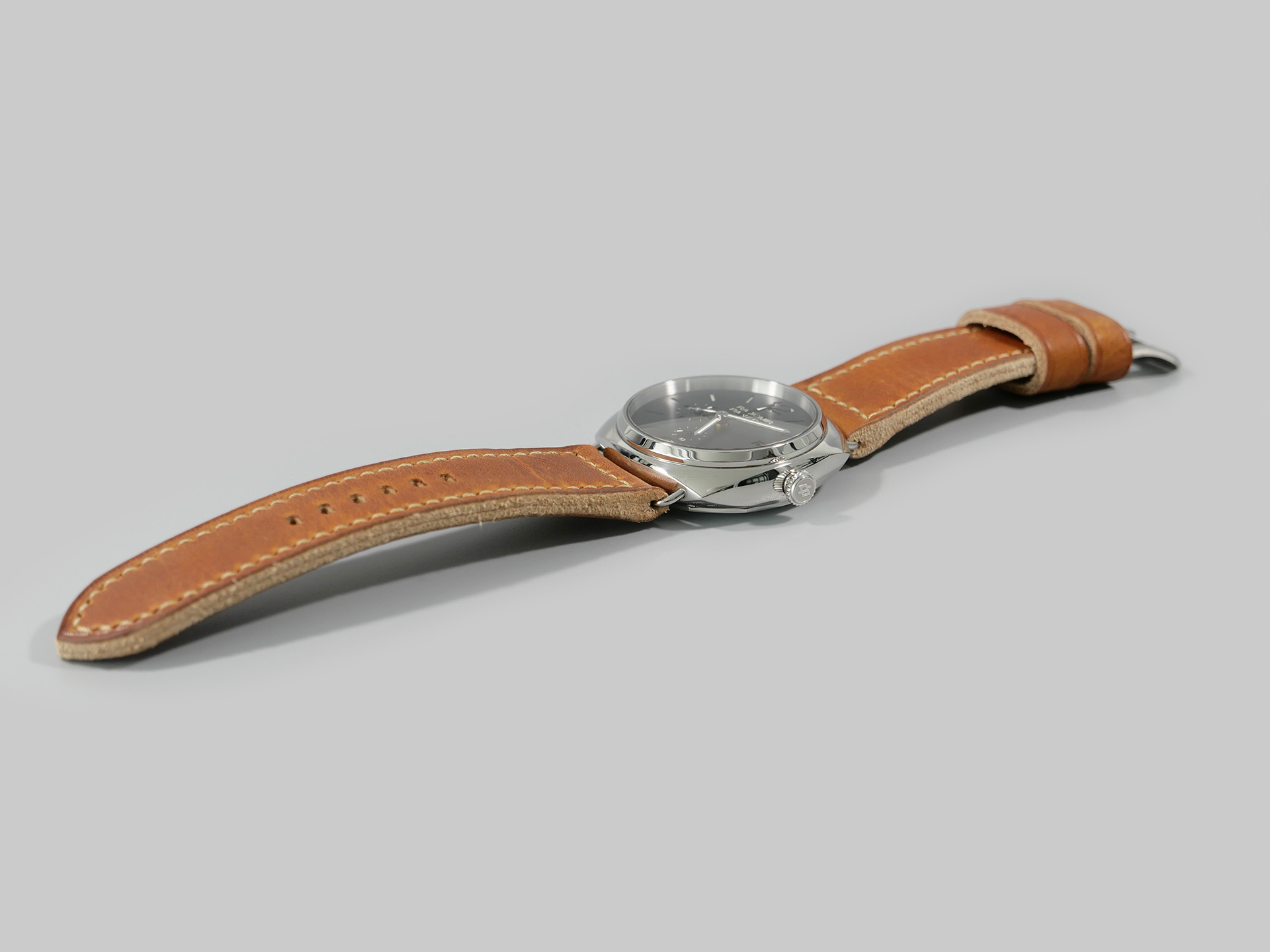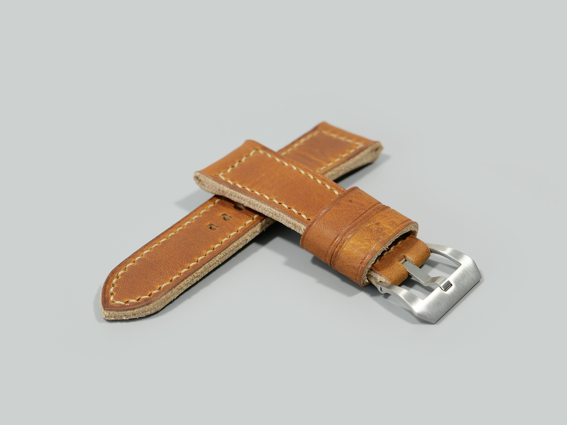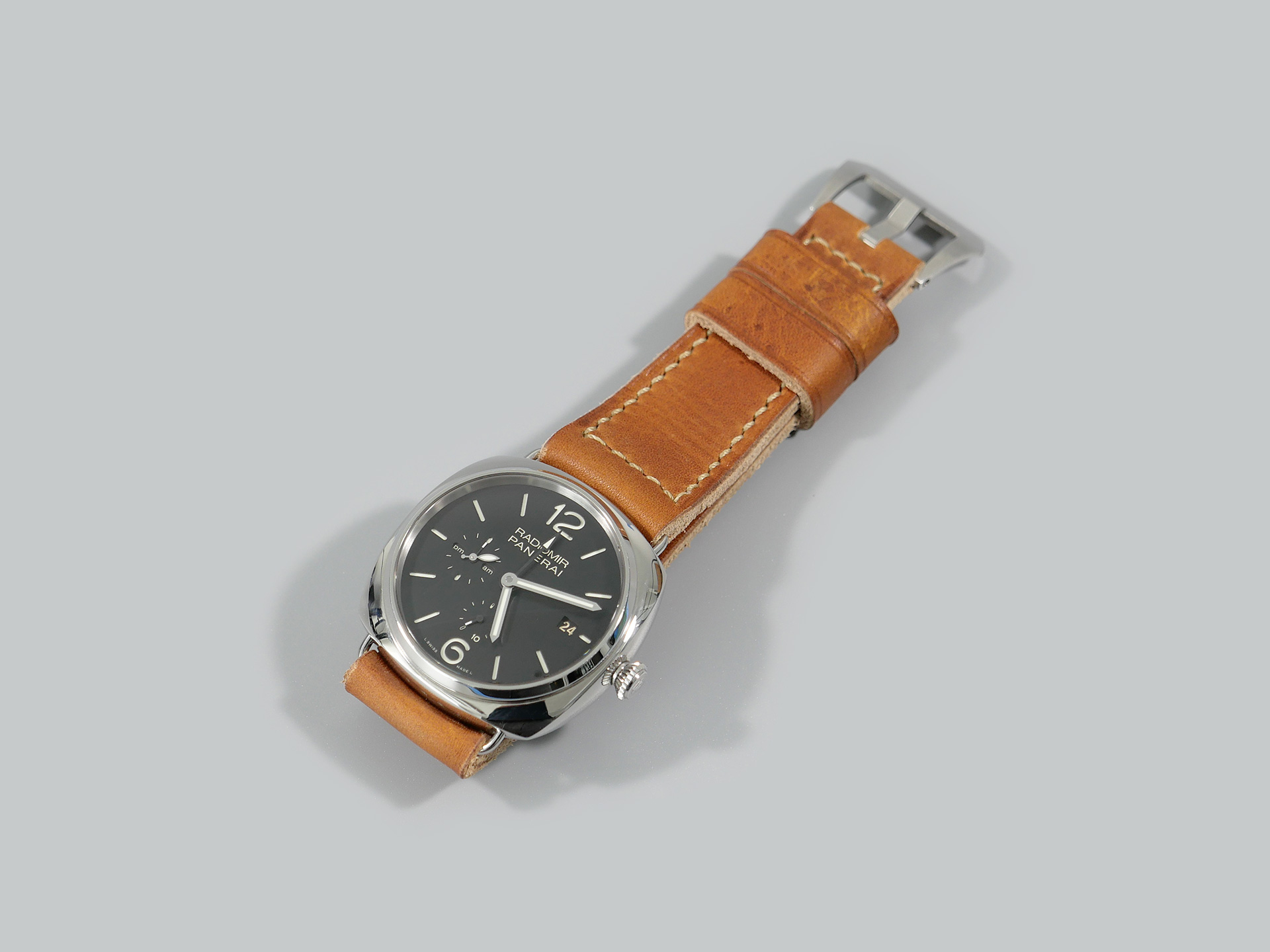 Due to the wire lugs of the typical Panerai Radiomir case, I tend to lean towards leathers of a slightly softer and more pliable temper. From a design perspective, I tend to utilize a taper of 27-22 or 26-22 depending on the leather. If you have a larger 47mm Radiomir case, like a PAM323, I highly recommend going with straps of 4.5mm thickness or above. I have even designed some custom Radiomir straps specifically for the 47mm Radiomir cases that have a bolstered taper where the strap meets the case.