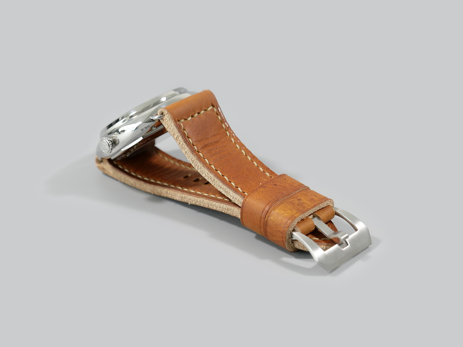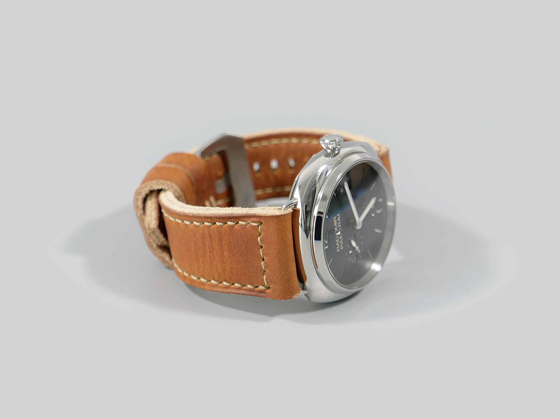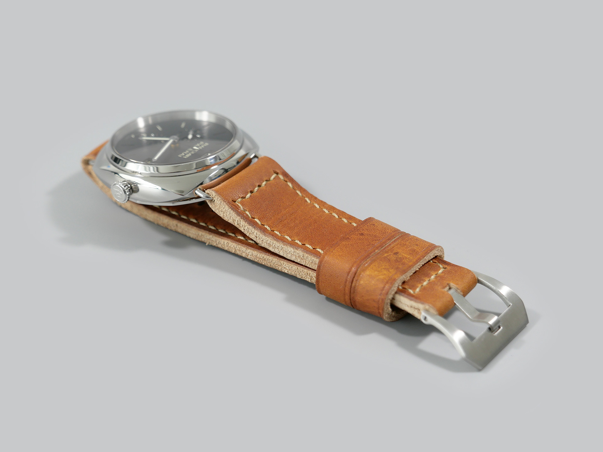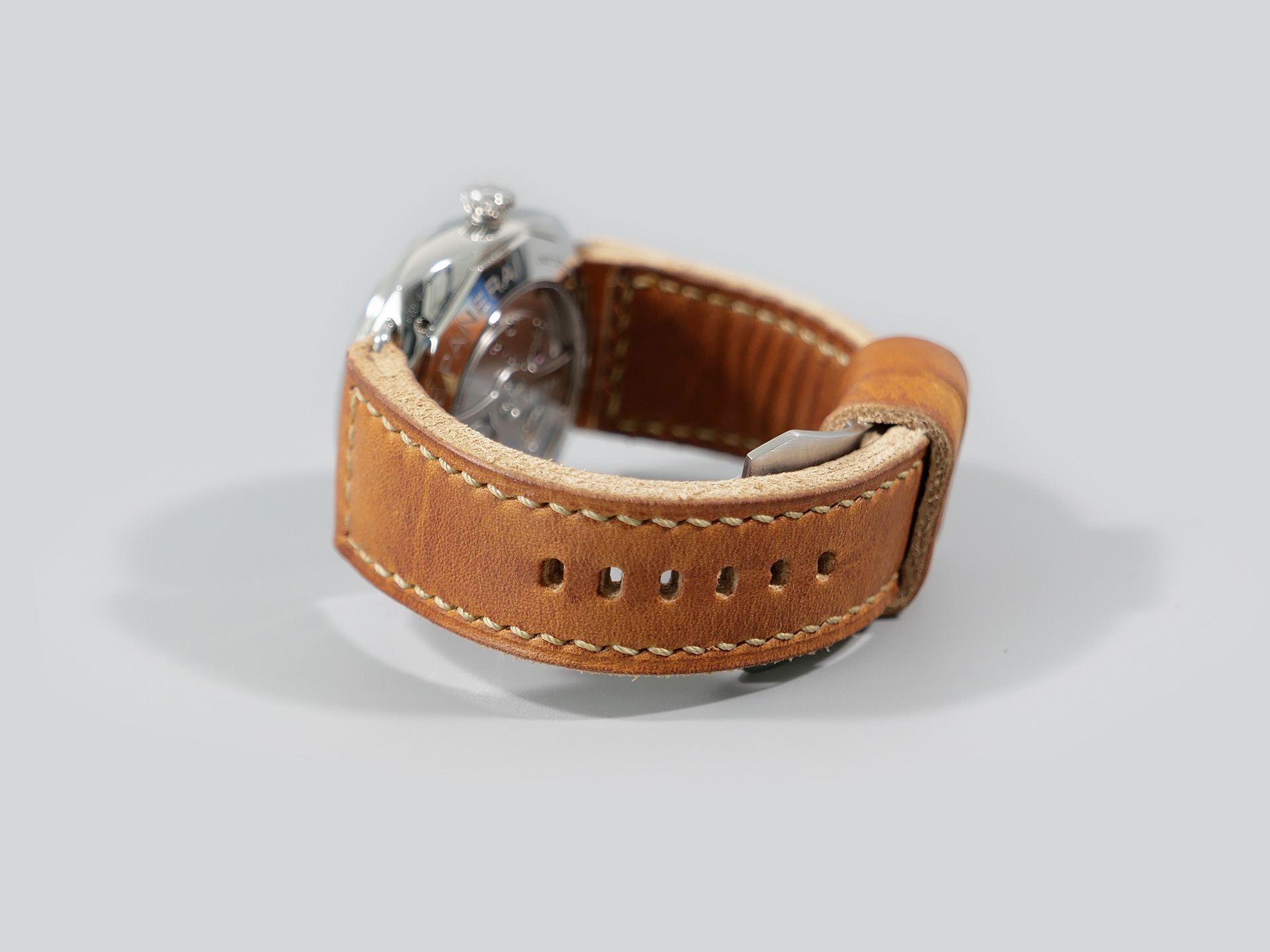 In consideration of the up-sized 47mm Radiomir cases, I have also bulked up the thread size and keeper size. The strap features a nice reddish clay tan outer with visible fat lines and other distress marks. The inner is a lighter shade of tan. I selected this leather because of it’s unique and pronounced pull-up characteristic, which will lend a well-worn aesthetic to the strap with time. The thread is a medium beige color tone. This gorgeous brown Radiomir strap features two floating keepers, allowing you to remove one if you like.
