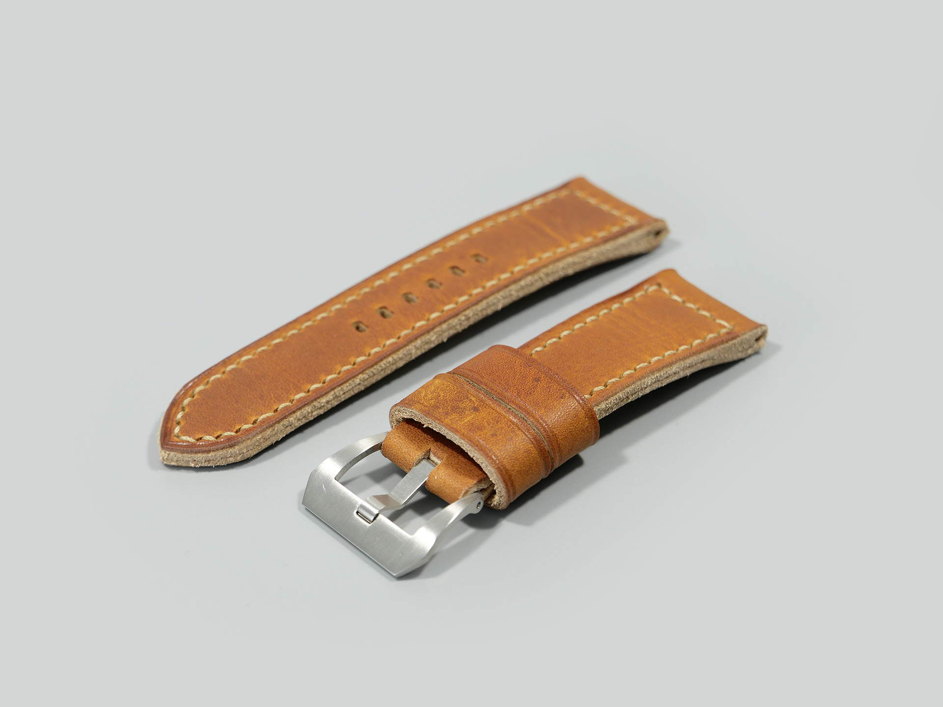 About the Leather: 100% hand made, and hand stitched as with all of my straps. I made this brown Radiomir strap specifically in consideration of the larger 47mm Radiomir with pillow case design, namely the PAM323 and others that have a thicker case design than the standard 45mm cases while retaining the same wire lug width. To compensate for the fatter case, I constructed this strap with tapering thickness that starts at 7mm near the lugs and reduces to 5mm near the center and tips of the strap. This increased thickness near the case eliminates the frequent feeling of “this strap is too thin for this watch”.