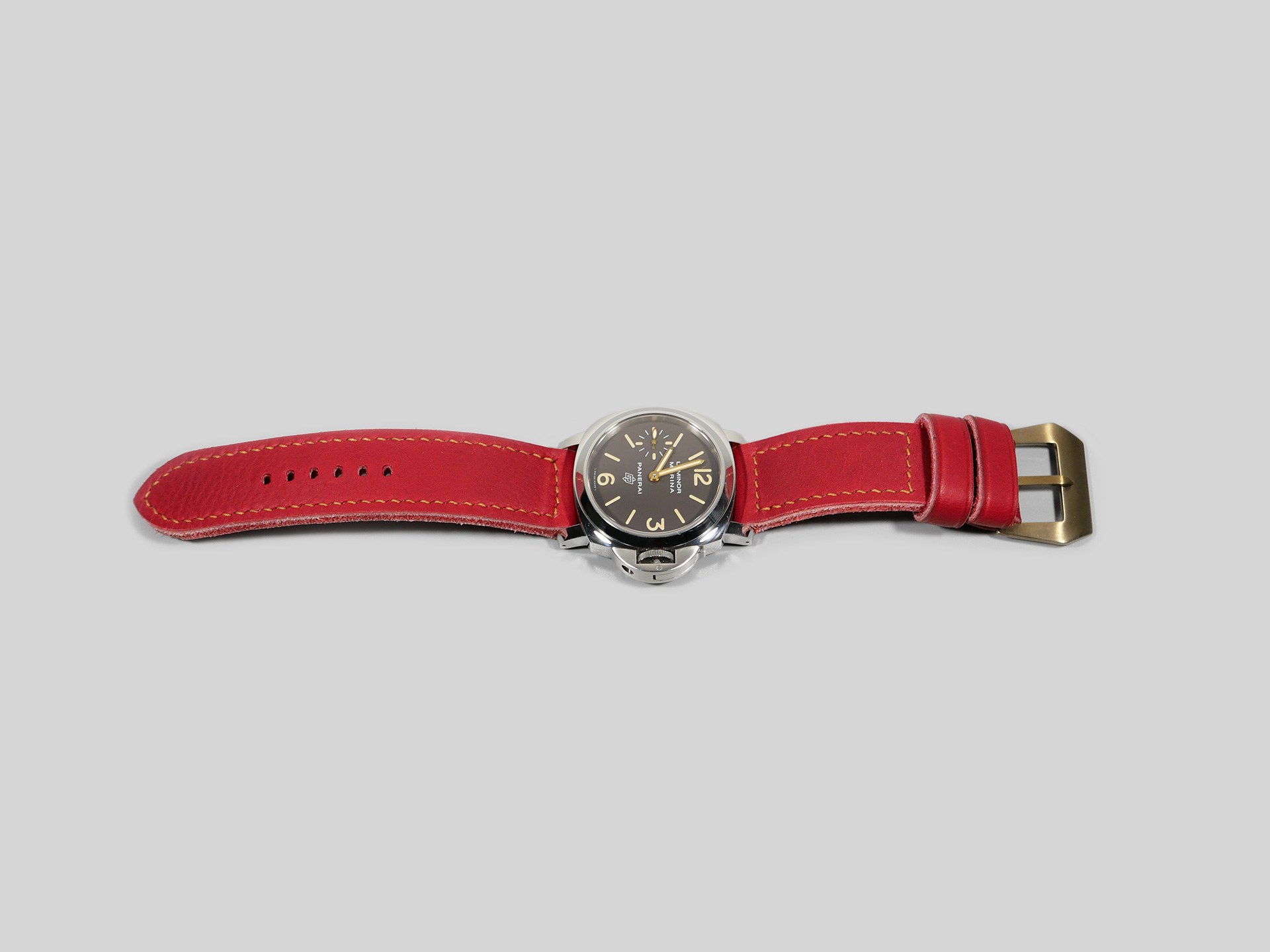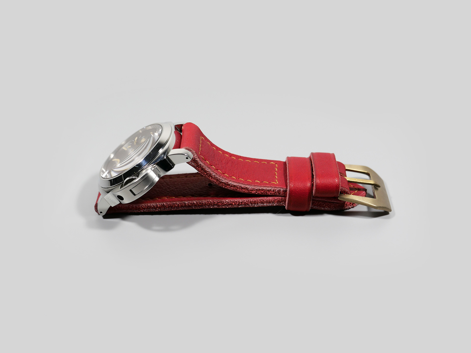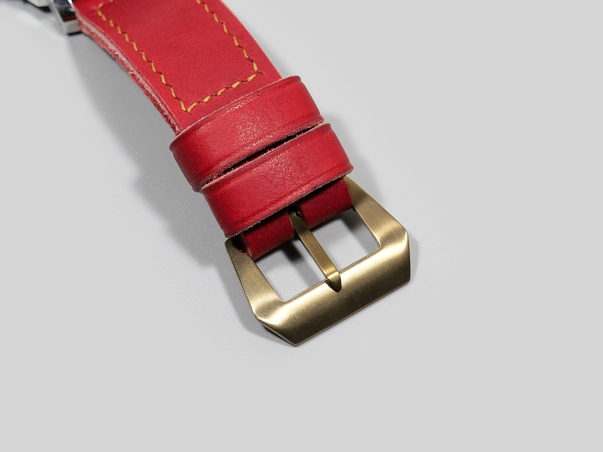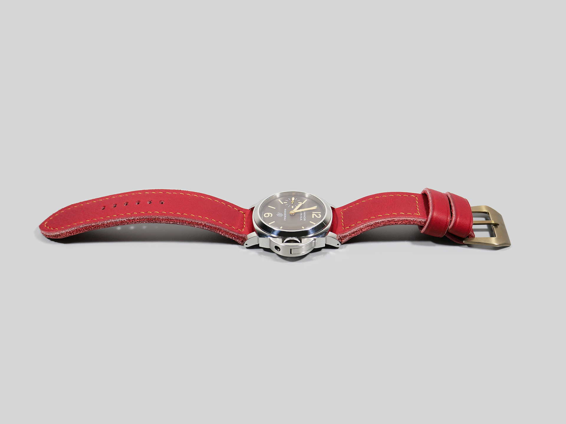 This crimson red Luminor 44mm strap ships with a vintage style brushed stainless pin buckle with a bronze finish.  Additional buckle options are available from the drop down menu.  Above, you can view this red 44mm Panerai strap paired with the tropical themed PAM00632.  The stitching color was specifically chosen to match the dial of this model and the bronze colored buckle.  If you would like the same strap, but with a different color stitching, please do not hesitate to contact me.