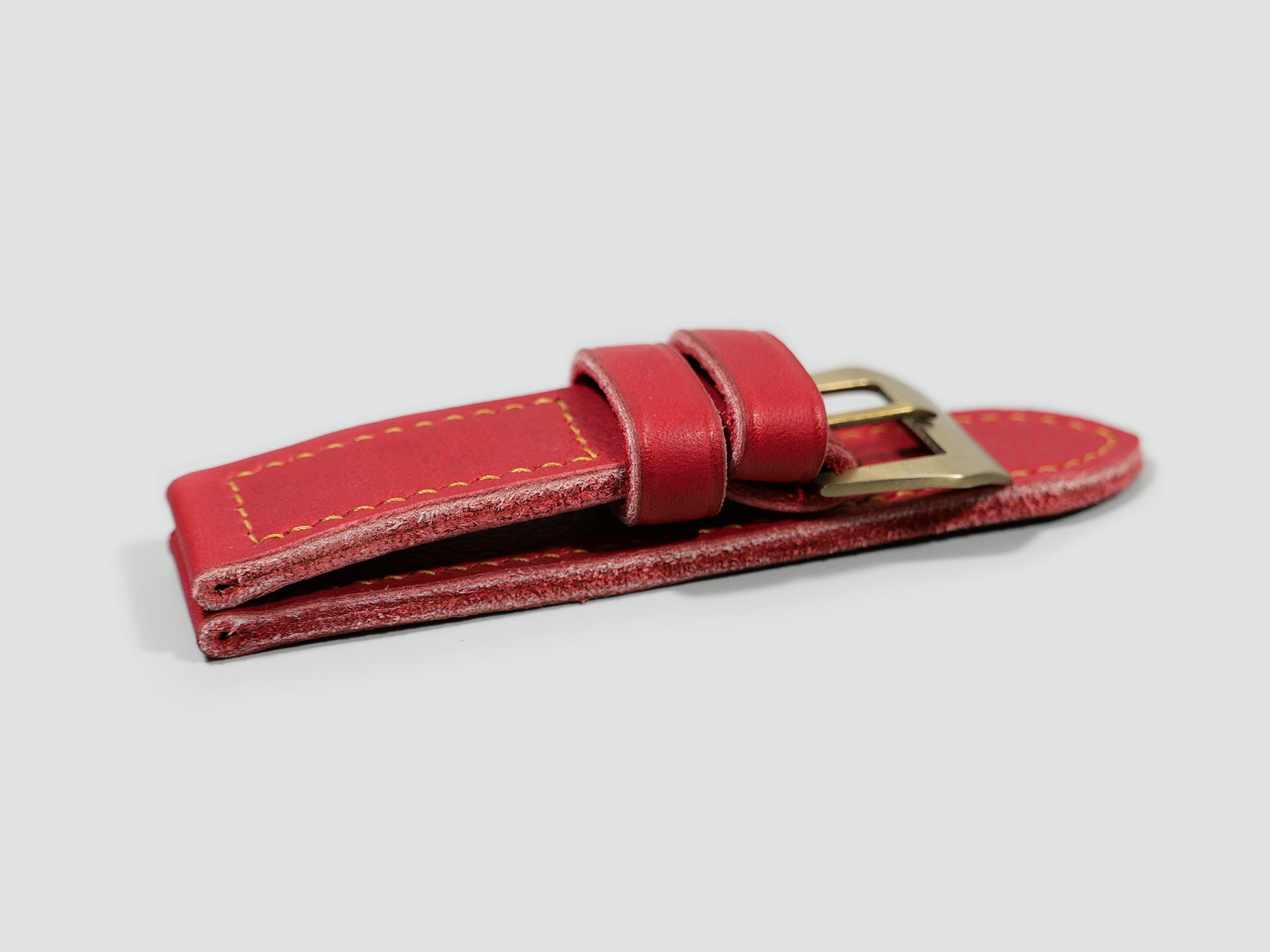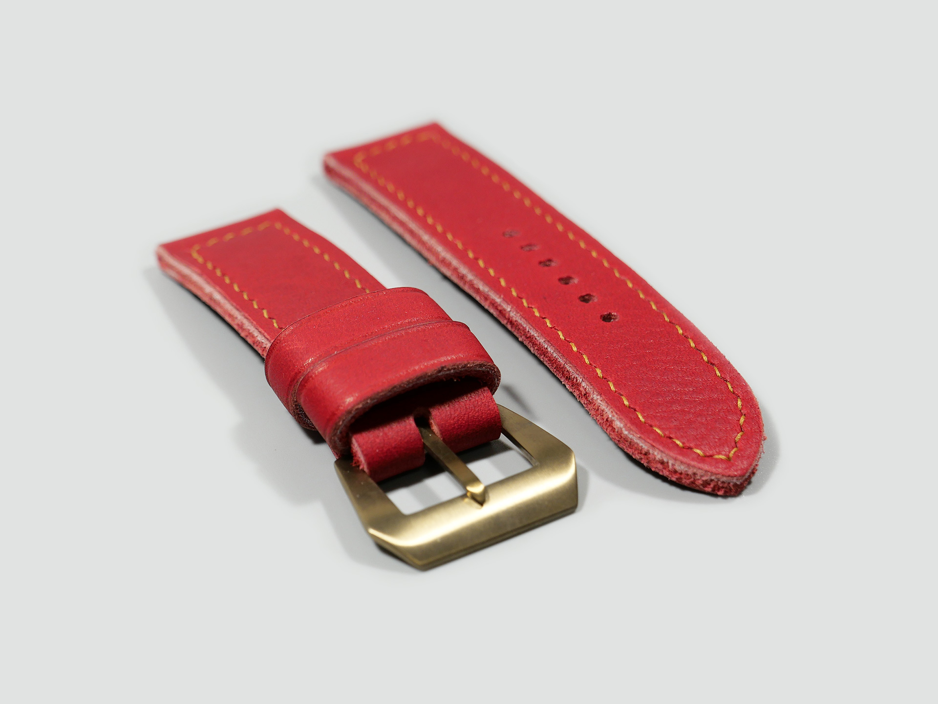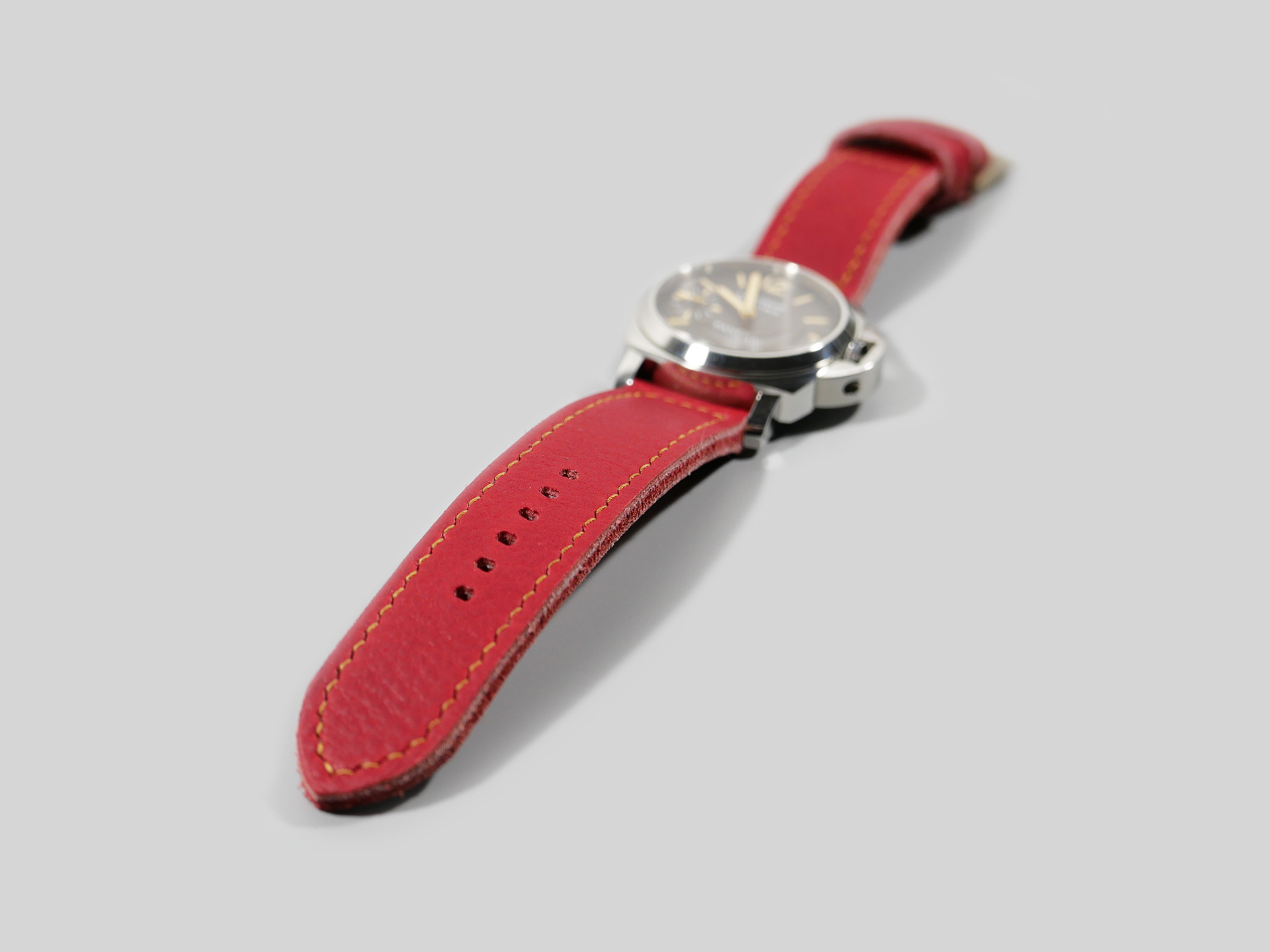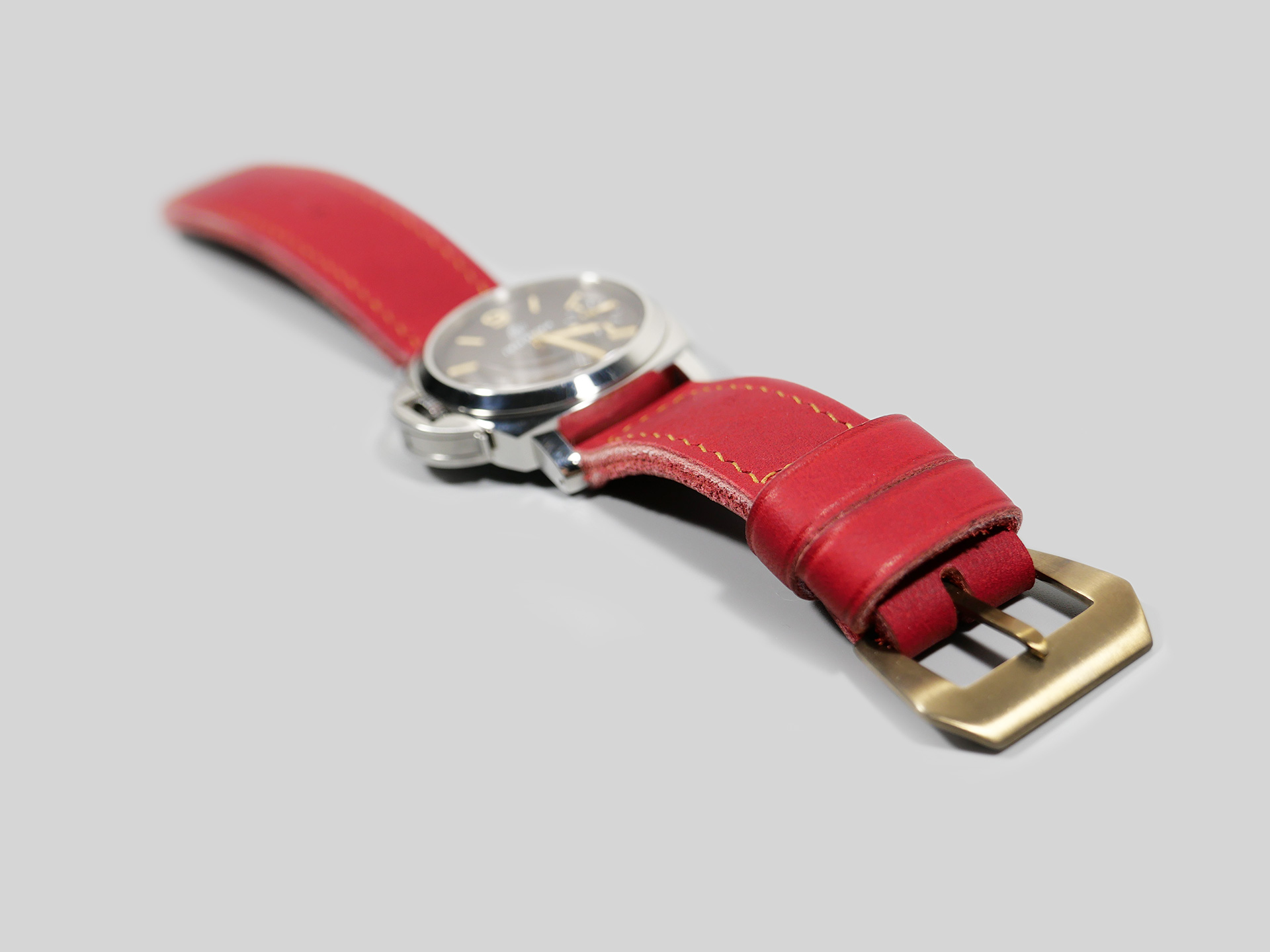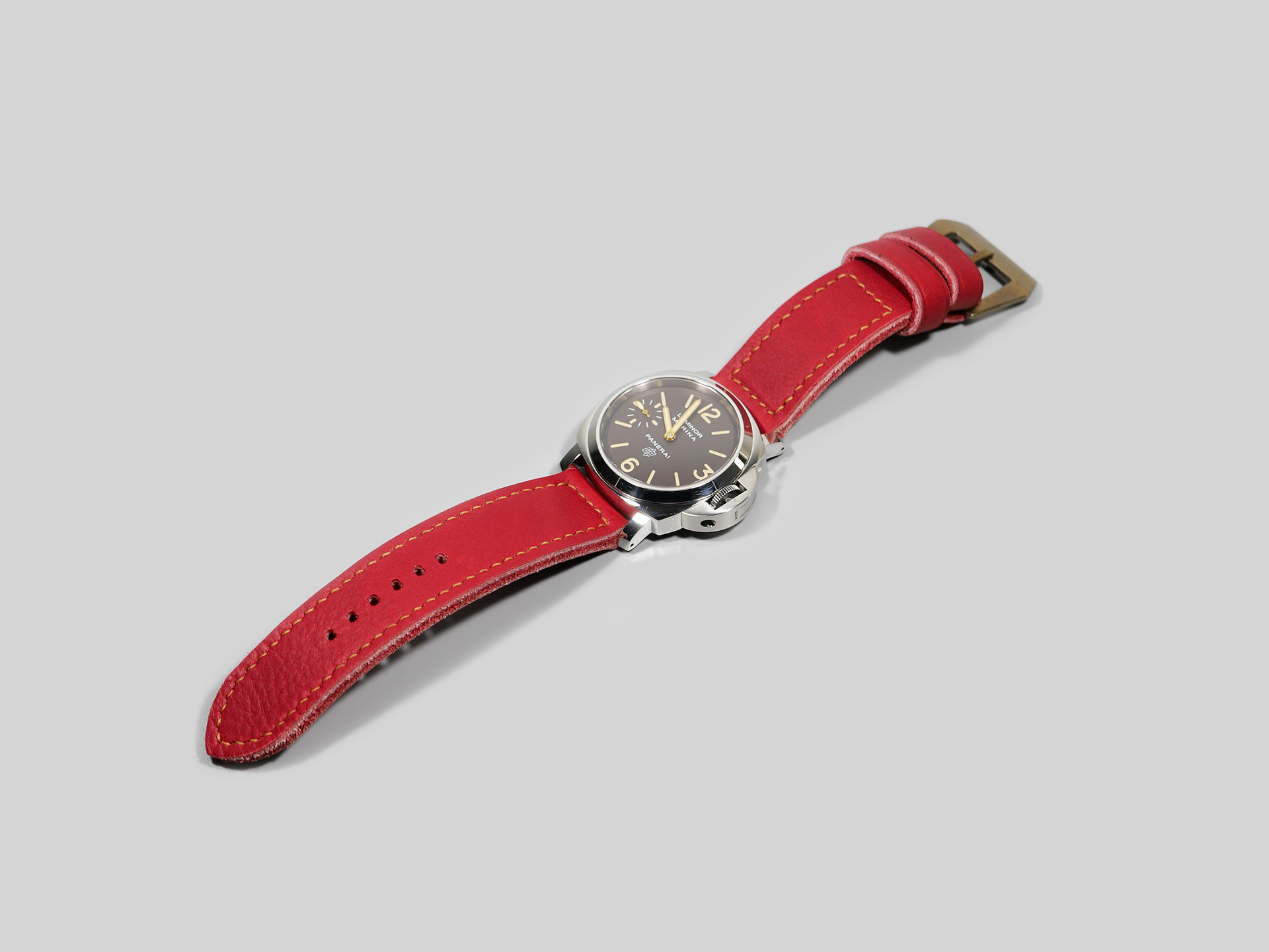 This crimson red Luminor 44mm strap ships with a vintage style brushed stainless pin buckle with a bronze finish.  Additional buckle options are available from the drop down menu.  Above, you can view this red 44mm Panerai strap paired with the tropical themed PAM00632.  The stitching color was specifically chosen to match the dial of this model and the bronze colored buckle.  If you would like the same strap, but with a different color stitching, please do not hesitate to contact me.