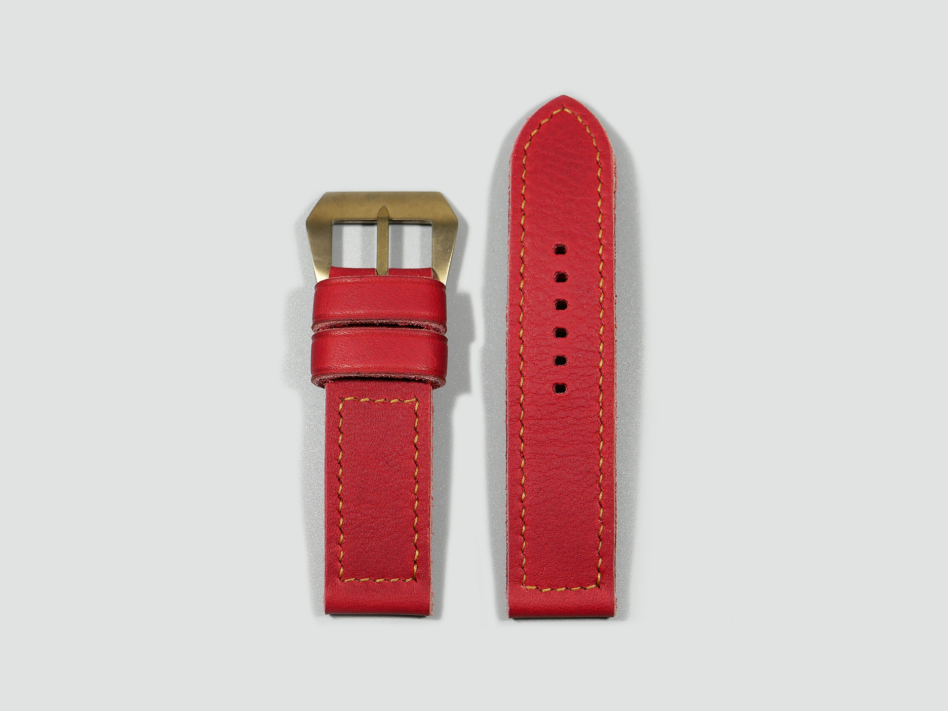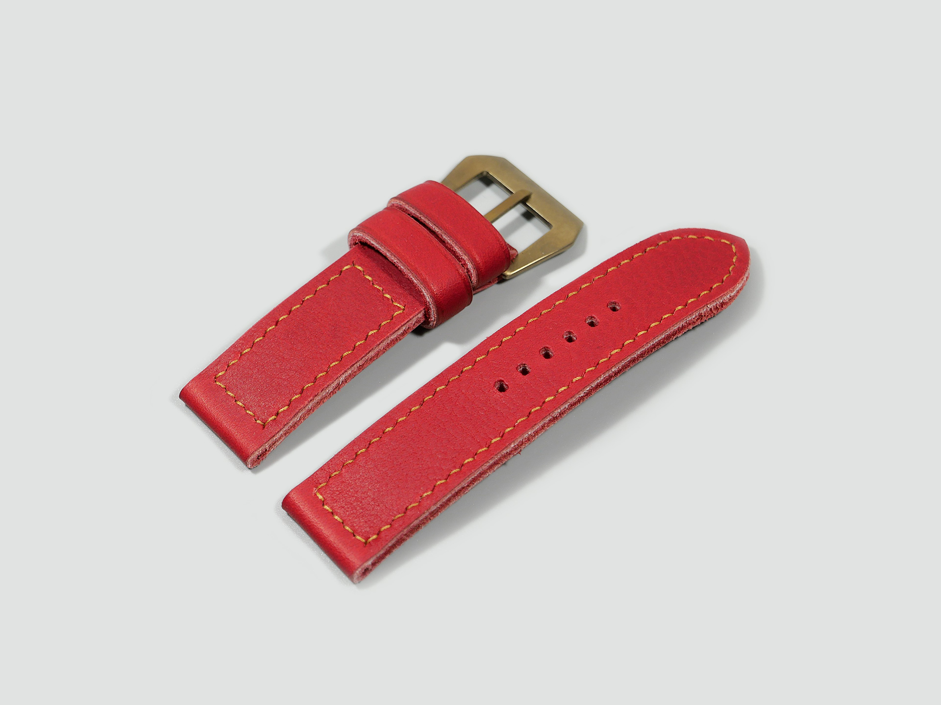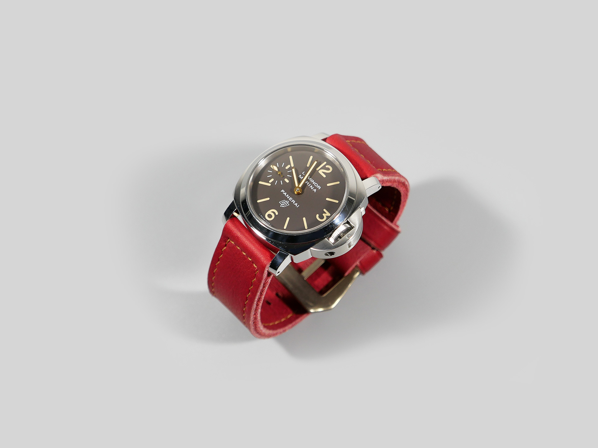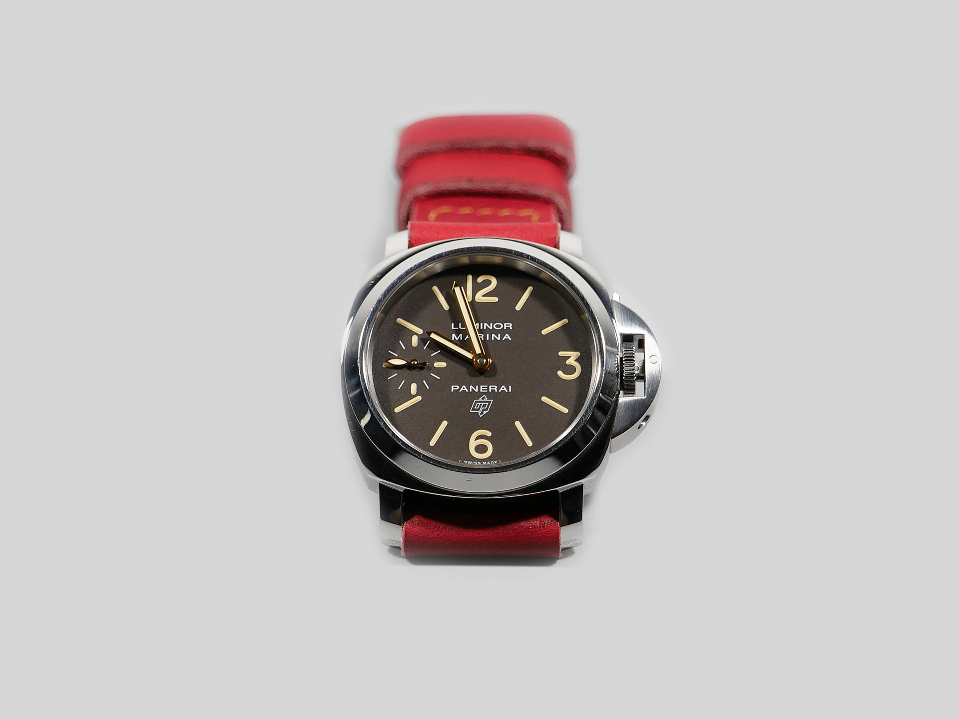 This crimson red Luminor 44mm strap ships with a vintage style brushed stainless pin buckle with a bronze finish.  Additional buckle options are available from the drop down menu.  Above, you can view this red 44mm Panerai strap paired with the tropical themed PAM00632.  The stitching color was specifically chosen to match the dial of this model and the bronze colored buckle.  If you would like the same strap, but with a different color stitching, please do not hesitate to contact me.