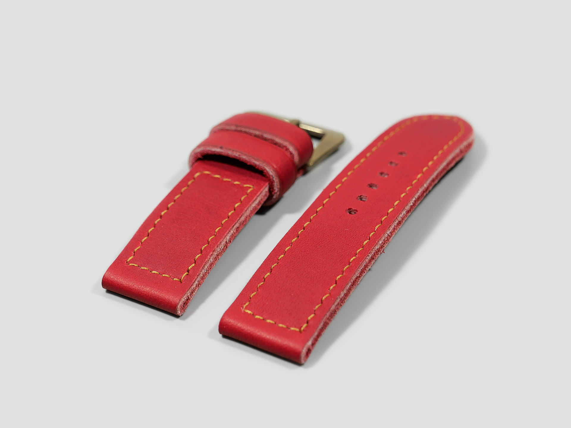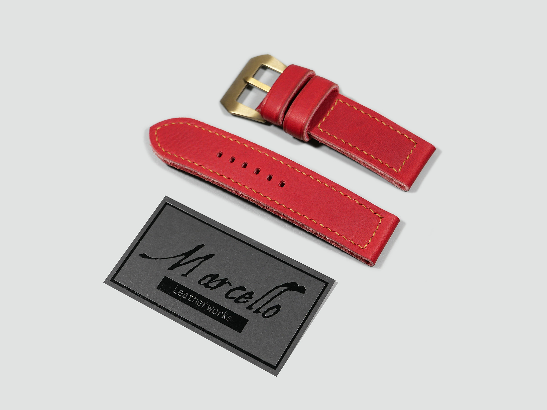 About the Leather:  This crimson red Panerai 44mm strap is 100% hand made and hand stitched, as are all of my straps.  I selected for this project a thick oil tanned leather with a waxy finish.  The thickness of this leather is especially suited to larger PAM cases.  This strap features two keepers, one floating and one fixed.  For a sharp contrast, I chose a bronze thread for the stitching.  Additionally, I have combined an unconventionally thin thread with wide spacing between the stitches to transform the stitch work.  This allows the wearer and those with an eye for detail to appreciate the contrast of colors.