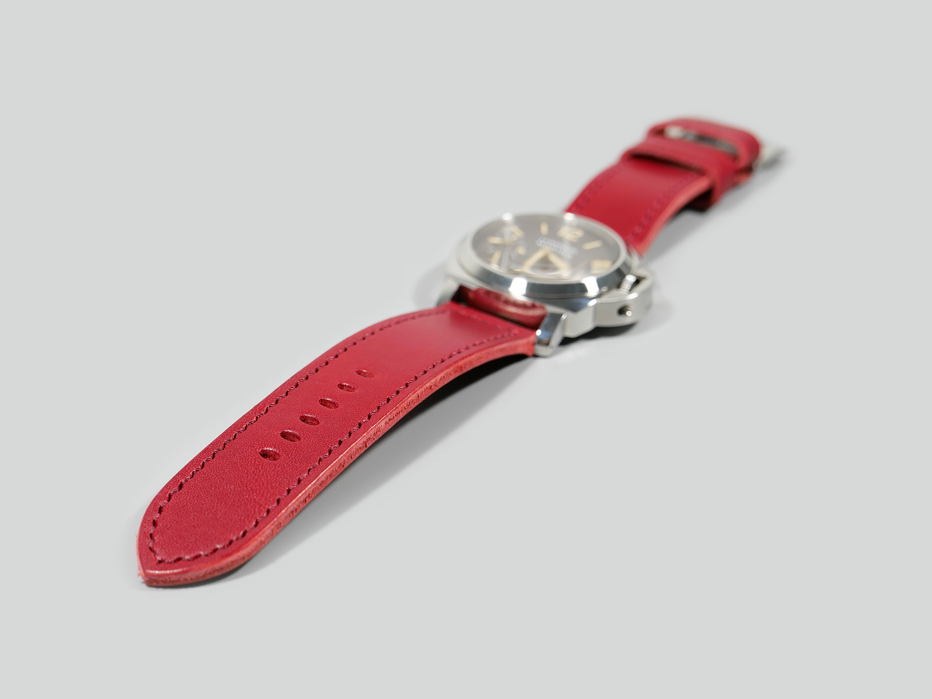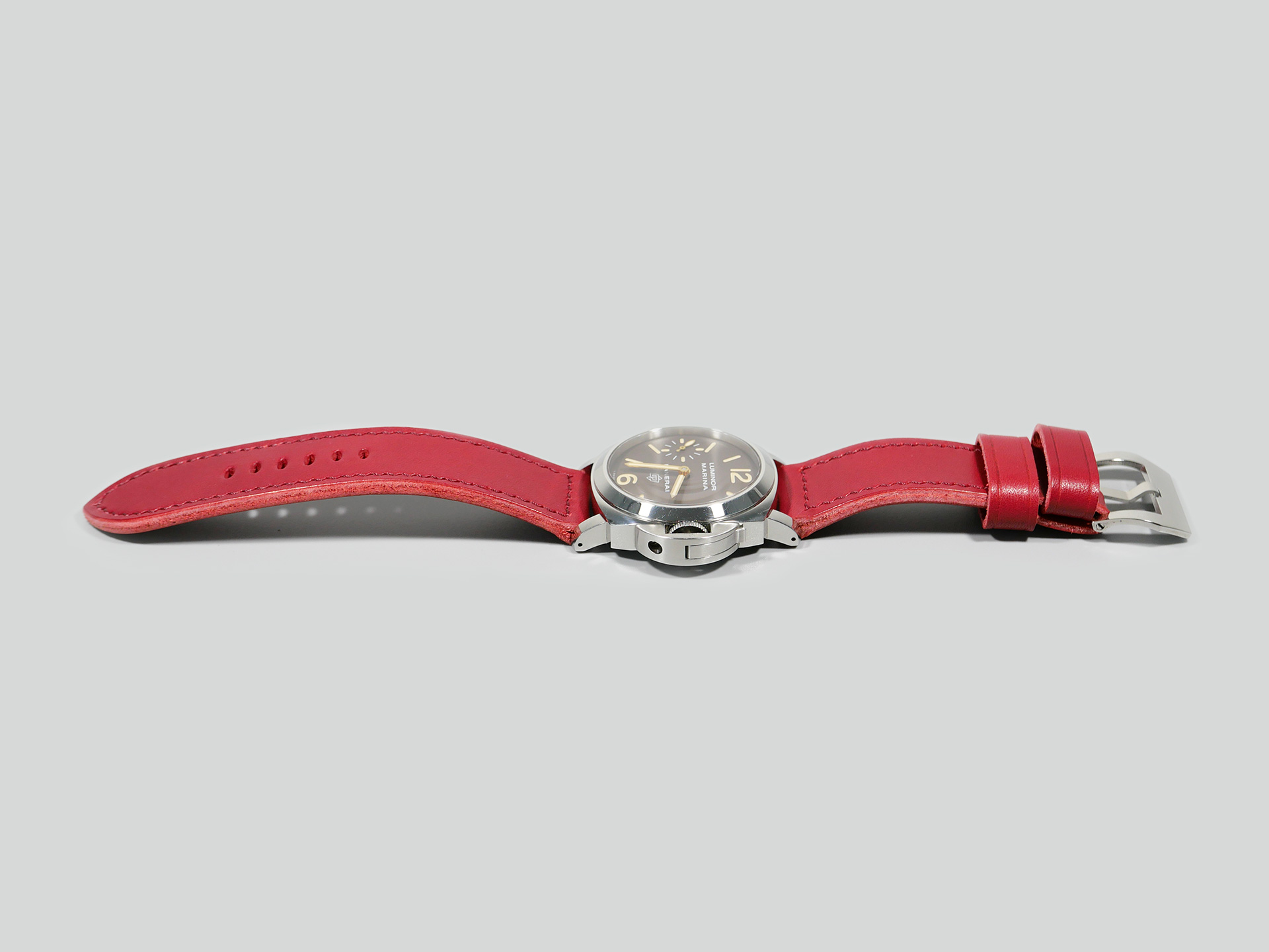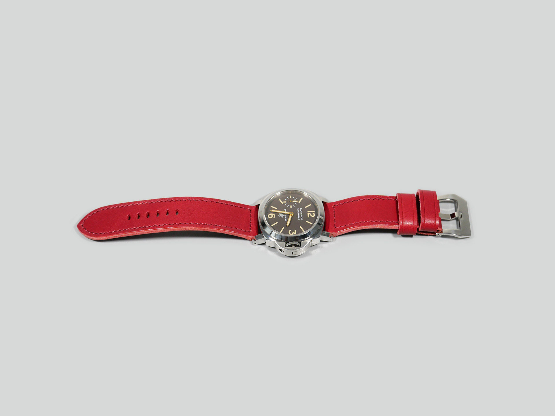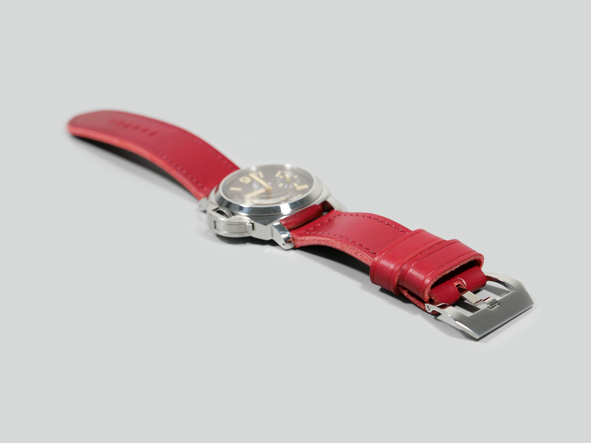 About the Leather: I created this amazing red Panerai Luminor strap 100% by hand, and hand stitched it as well. For this project, I have selected a limited run semi-gloss vegetable tan leather with a deep red tone. The strap features a uniform 24mm/24mm width throughout. I have designed this strap to feature one floating keeper and one fixed. I selected a darker red thread for the stitching to maintain the same color family, but to add a nice contrast. This red Panerai Luminor strap ships exclusively with a high quality polished trapezoidal PAM buckle, with screw bar. For this particular model, no other buckle options will be offered.
