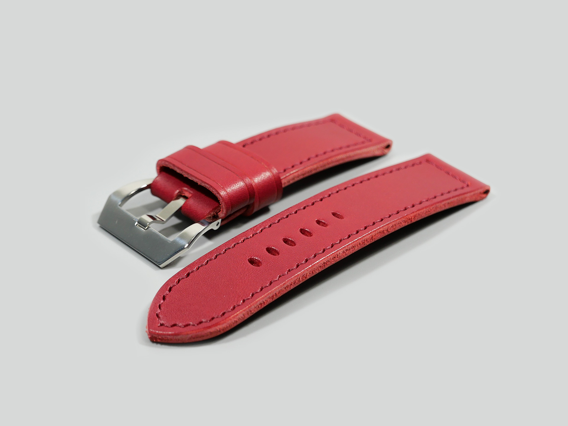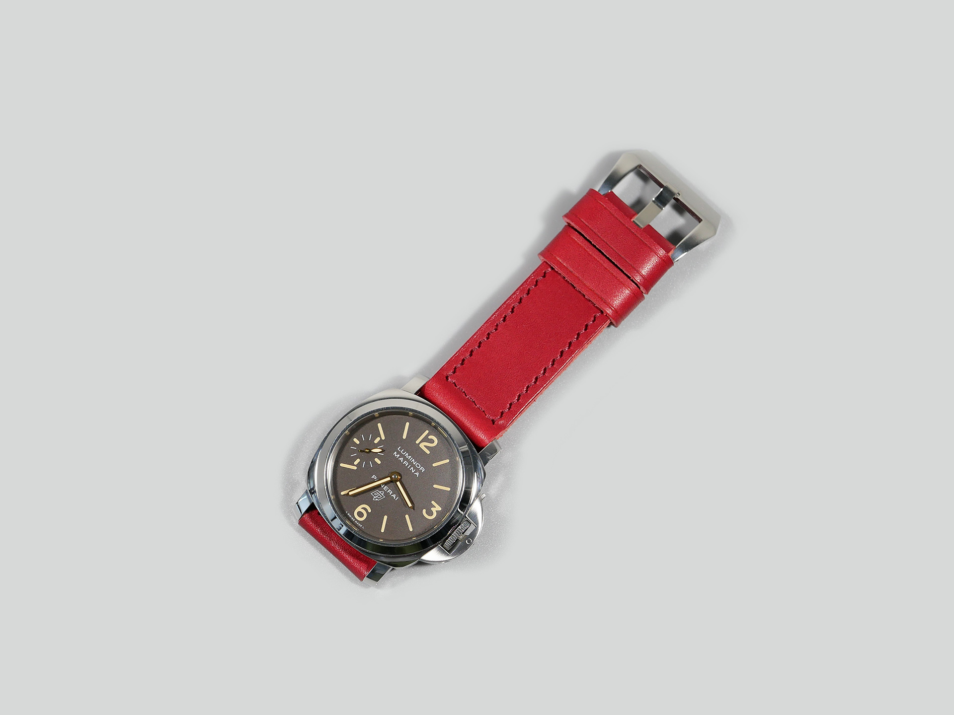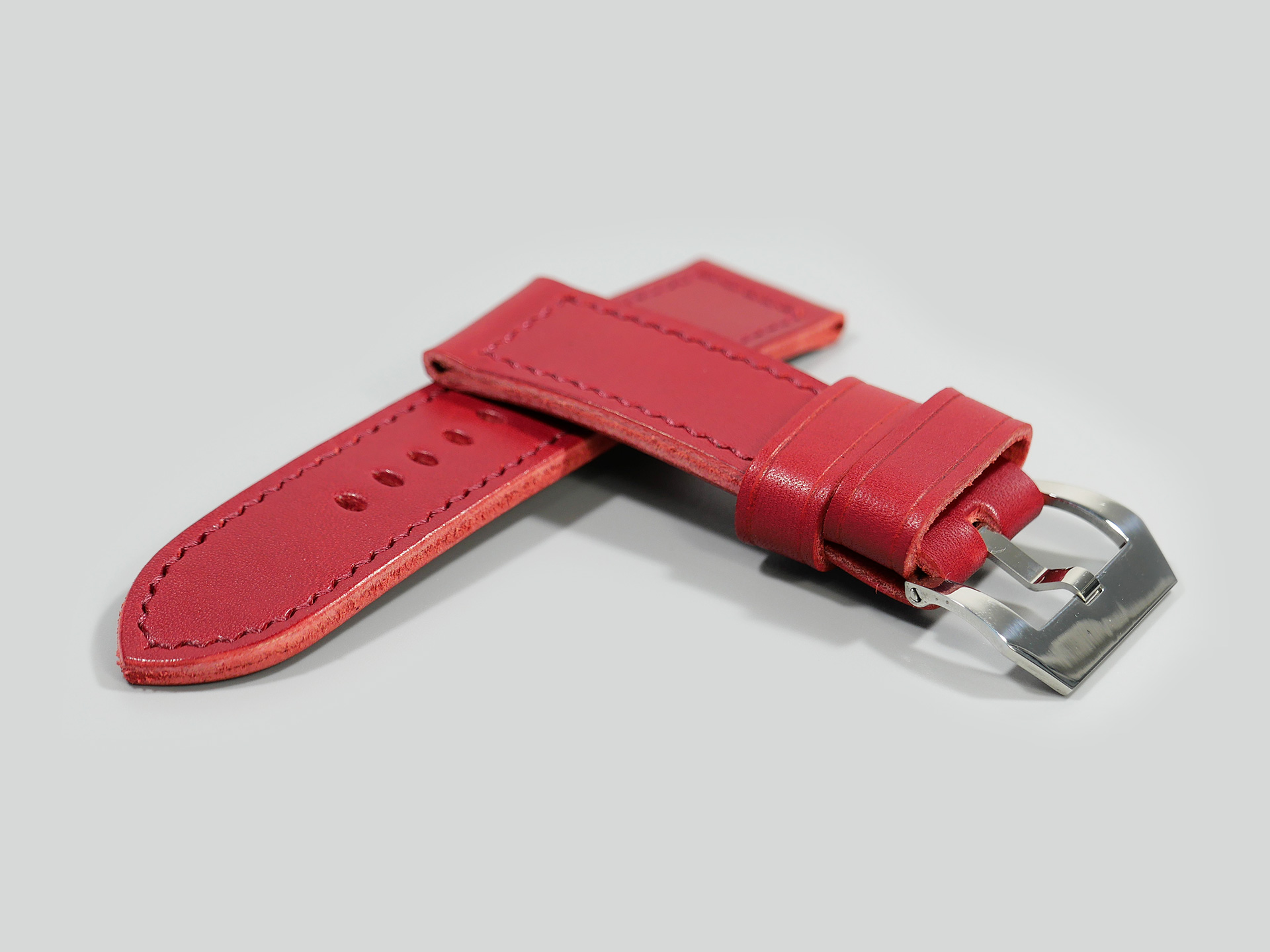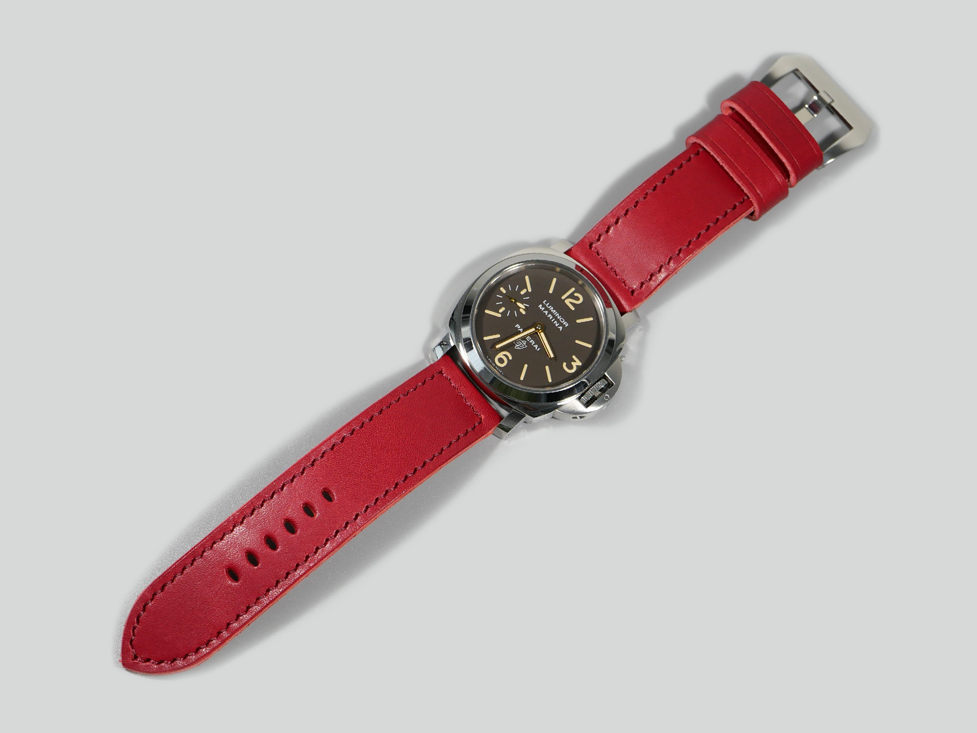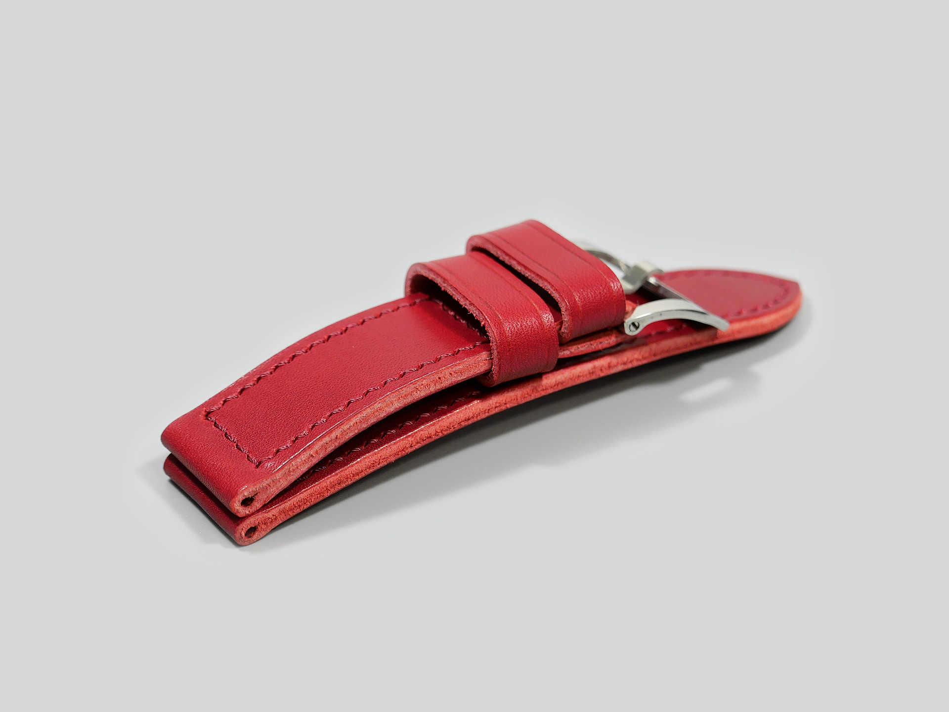 About the Leather: I created this amazing red Panerai Luminor strap 100% by hand, and hand stitched it as well. For this project, I have selected a limited run semi-gloss vegetable tan leather with a deep red tone. The strap features a uniform 24mm/24mm width throughout. I have designed this strap to feature one floating keeper and one fixed. I selected a darker red thread for the stitching to maintain the same color family, but to add a nice contrast. This red Panerai Luminor strap ships exclusively with a high quality polished trapezoidal PAM buckle, with screw bar. For this particular model, no other buckle options will be offered.