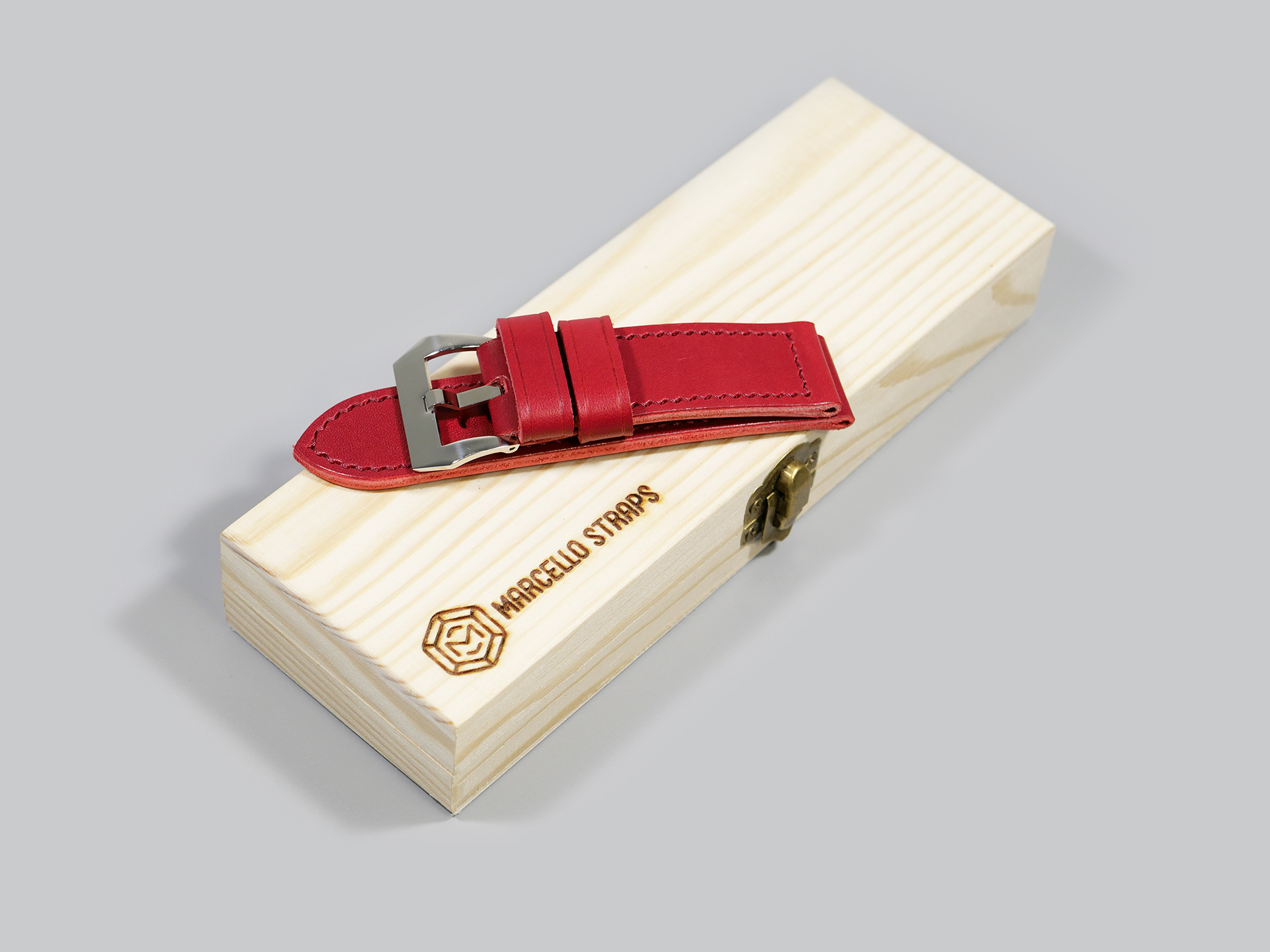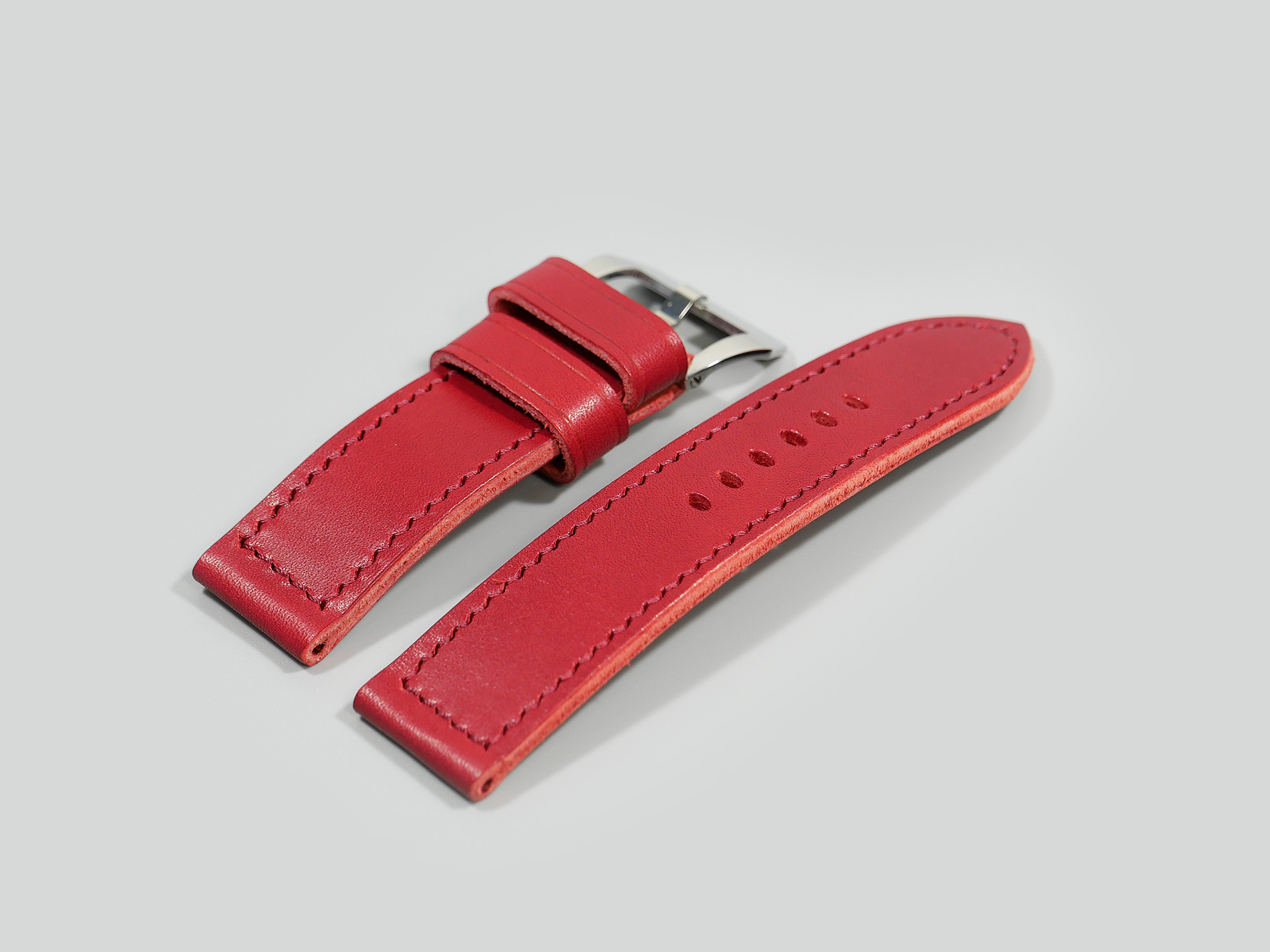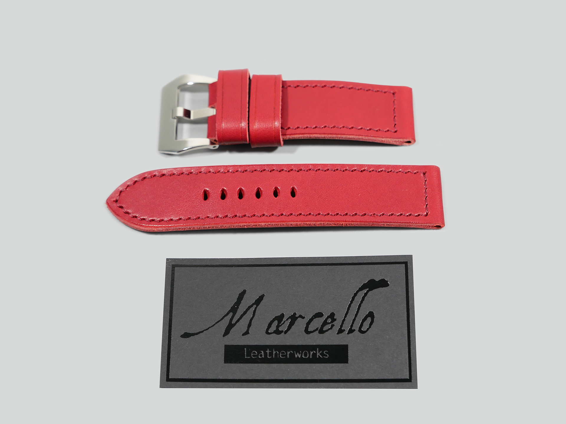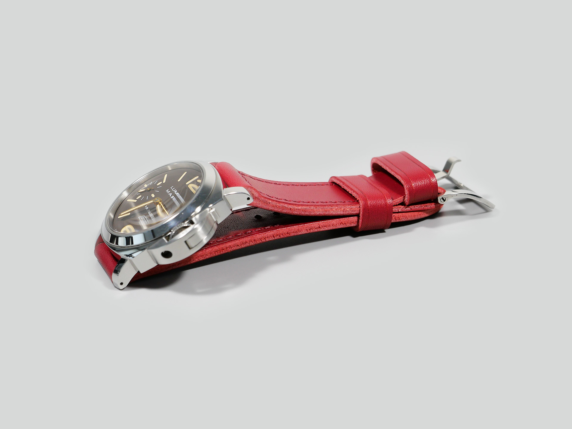About the Leather: I created this amazing red Panerai Luminor strap 100% by hand, and hand stitched it as well. For this project, I have selected a limited run semi-gloss vegetable tan leather with a deep red tone. The strap features a uniform 24mm/24mm width throughout. I have designed this strap to feature one floating keeper and one fixed. I selected a darker red thread for the stitching to maintain the same color family, but to add a nice contrast. This red Panerai Luminor strap ships exclusively with a high quality polished trapezoidal PAM buckle, with screw bar. For this particular model, no other buckle options will be offered.