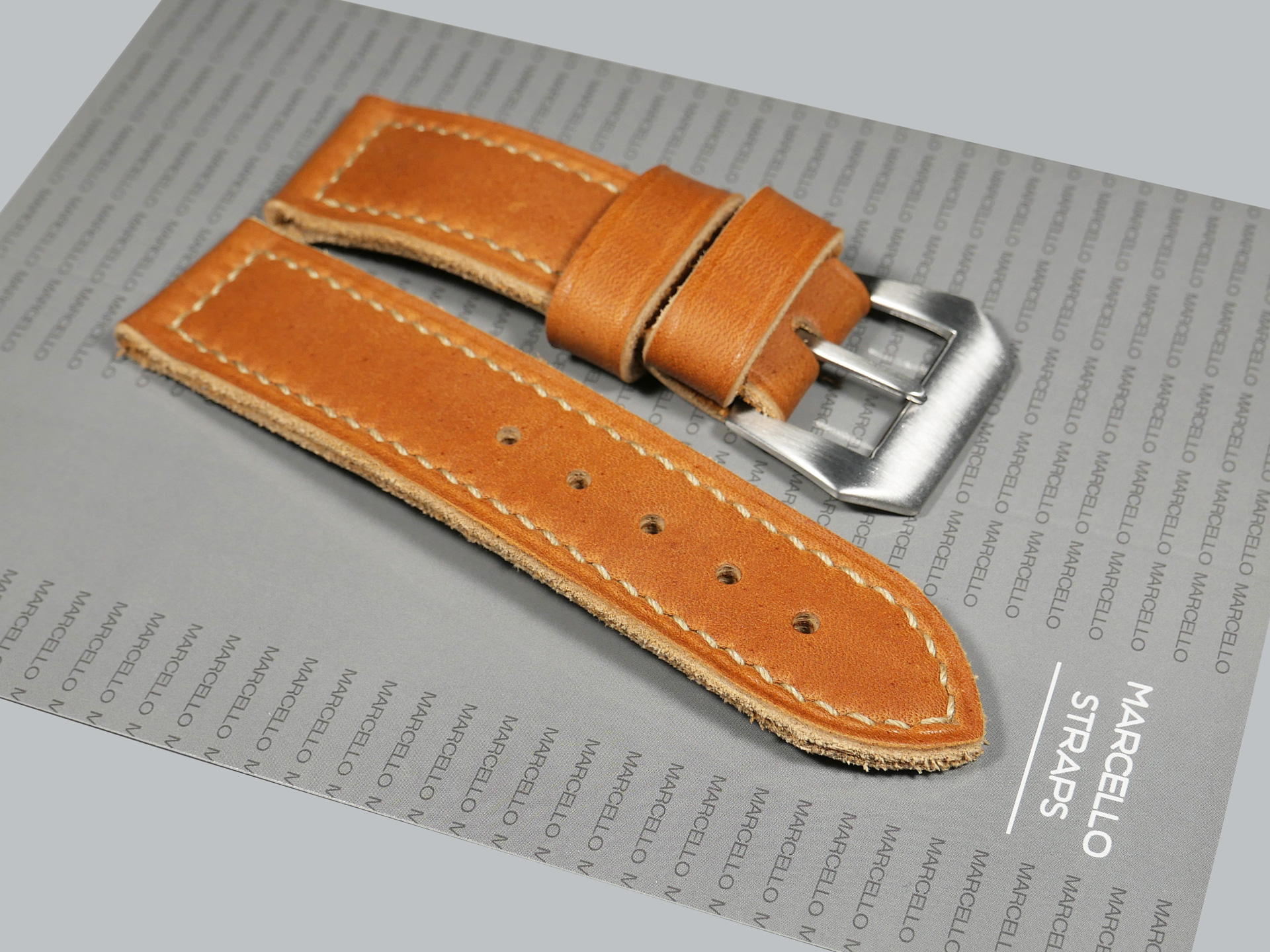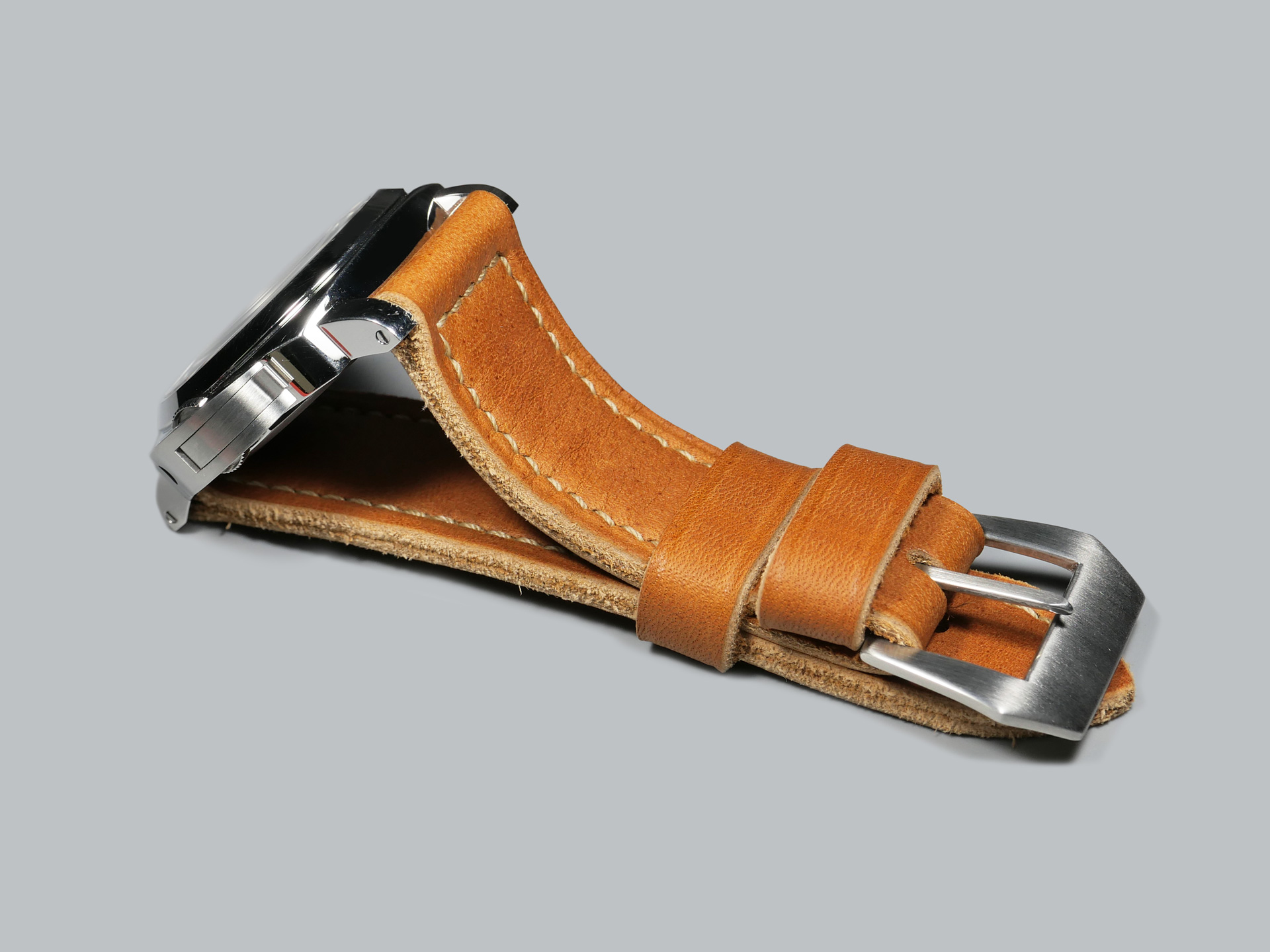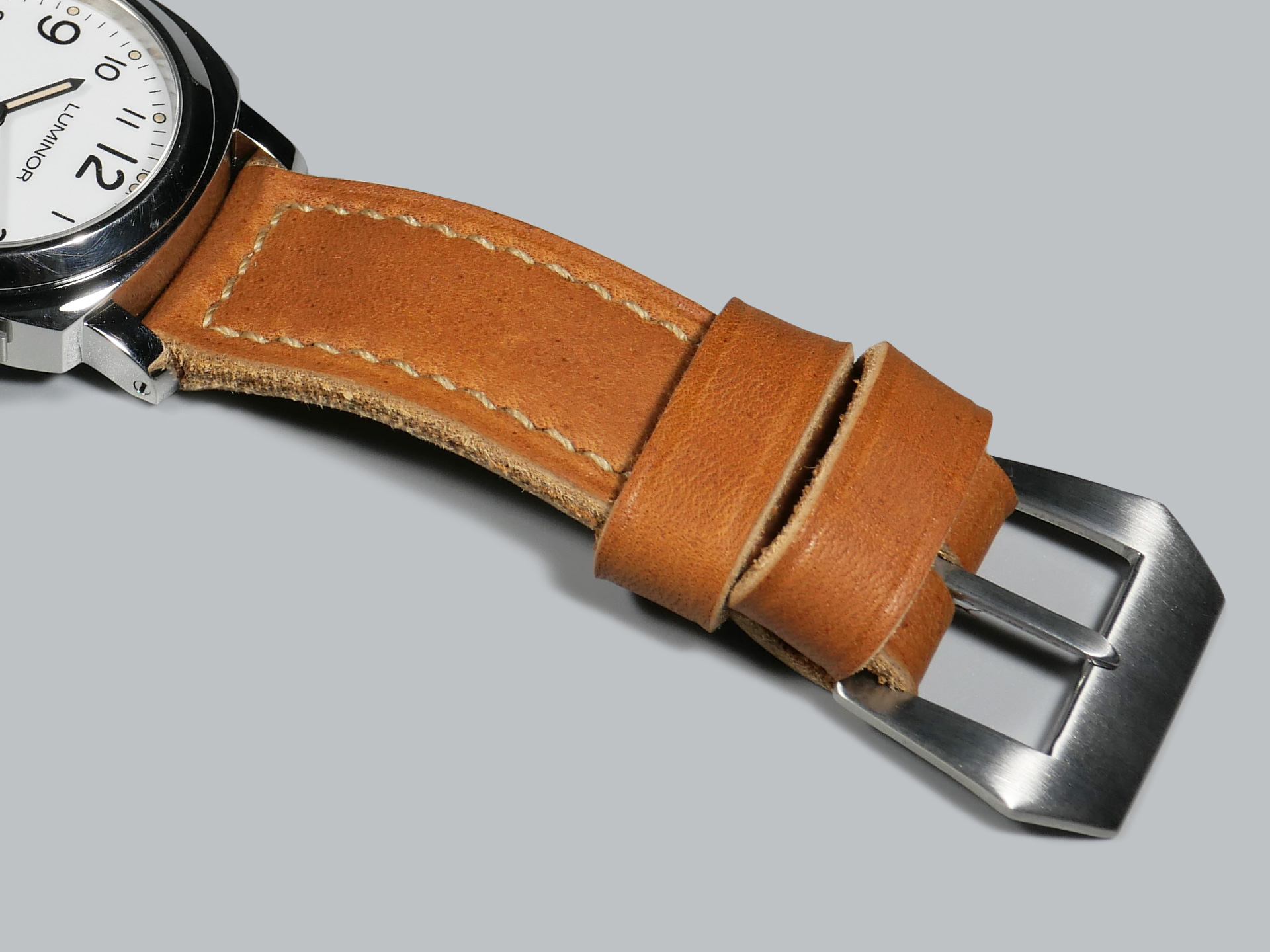 About the Leather:  Introducing a special strap for true Panerai enthusiasts! This meticulously handcrafted soft Panerai strap is inspired by the vintage era and is crafted with utmost care. Made from thick yet supple vegetable-tanned leather in a medium brown tone, this strap is extremely soft and comfortable on the wrist. The thick beige saddle stitching, done in a boxed pattern, adds a nice subdued contrast to the design. Featuring one floating keeper and one fixed, the strap also showcases a soft crease along its unfinished rugged edges.