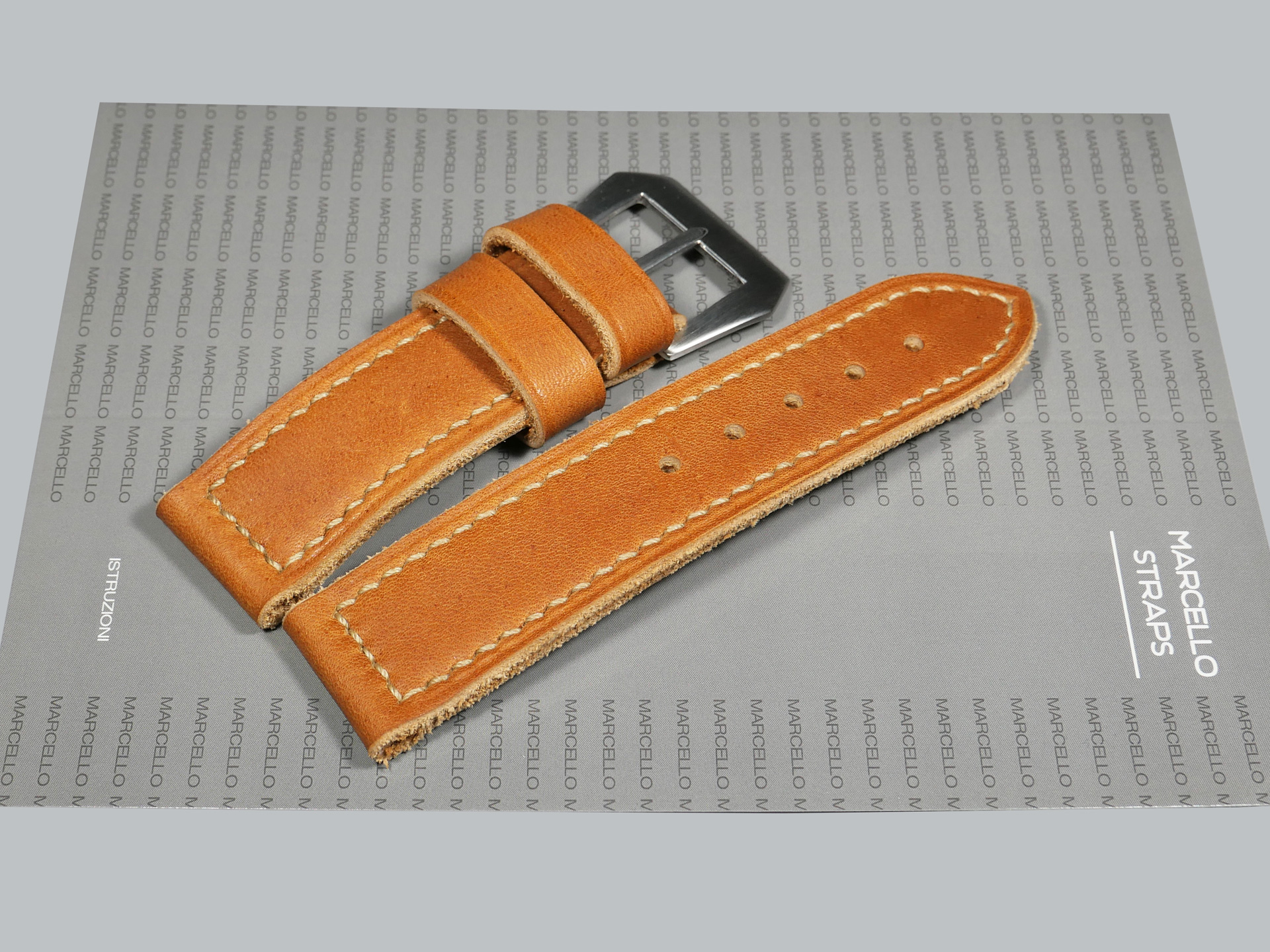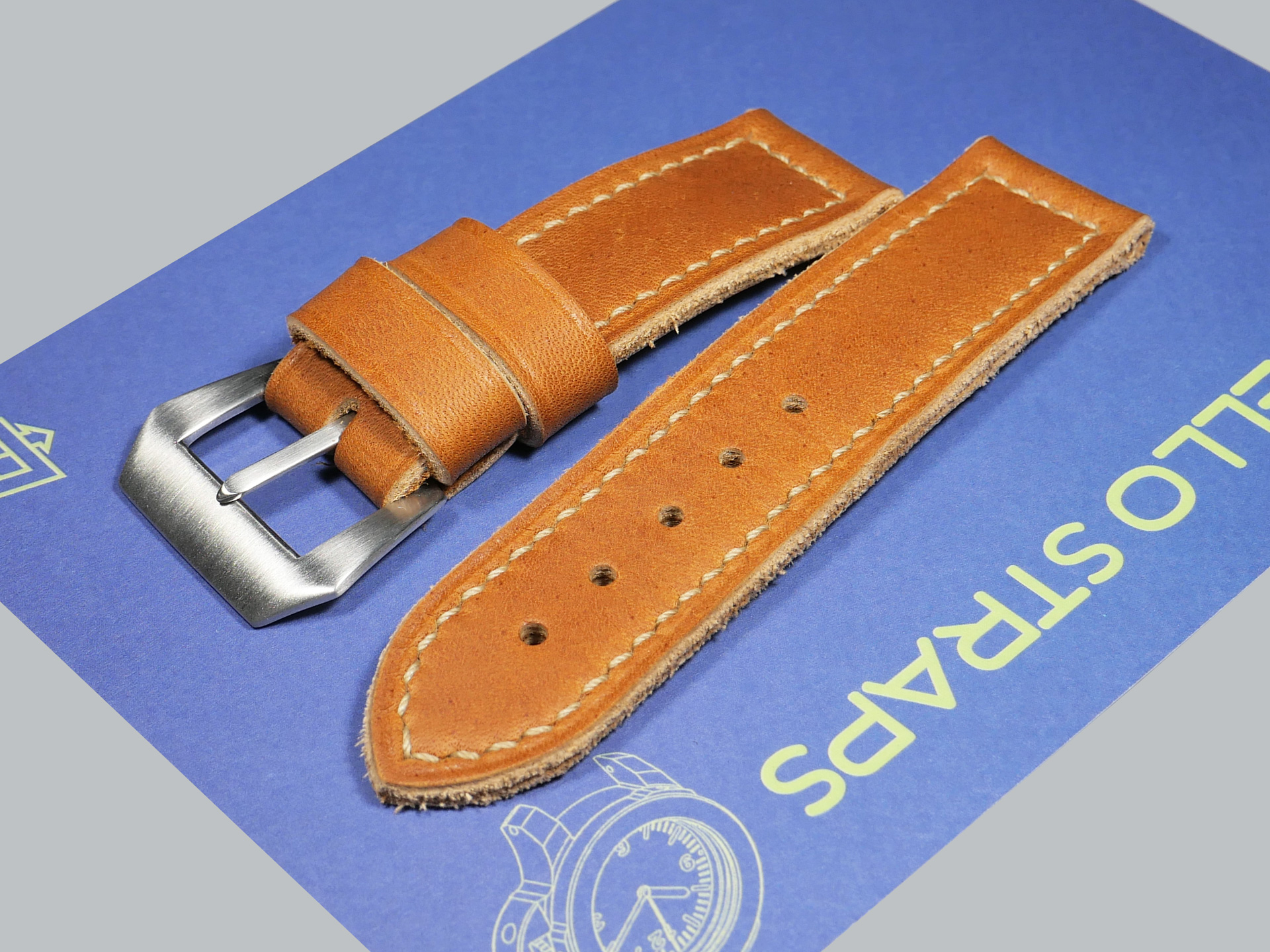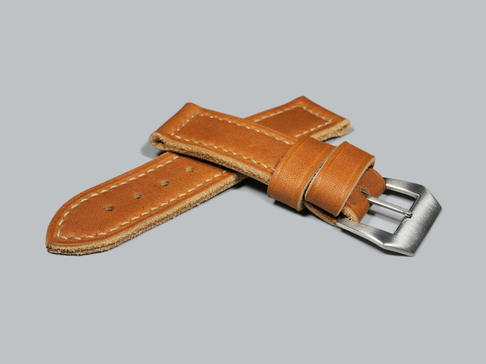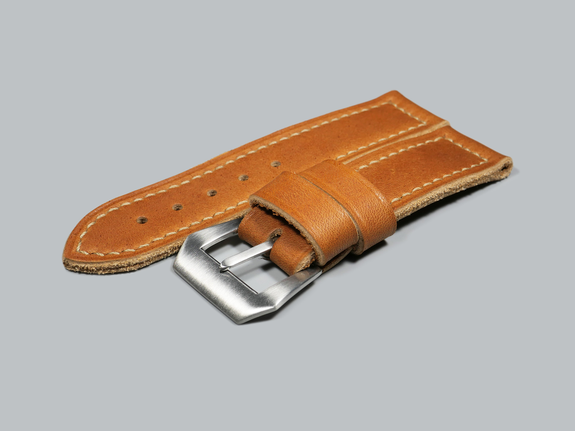 Most of my 24mm custom straps for 44mm Panerai models utilize a vintage Panerai style pin buckle. However, you will find that many straps in this section also have additional buckle options in the drop down menus above.  My general design philosophy for 24mm straps is dual keepers of generous width, box stitching, and a thickness or 3.5 to 5.5mm depending on leather temper.