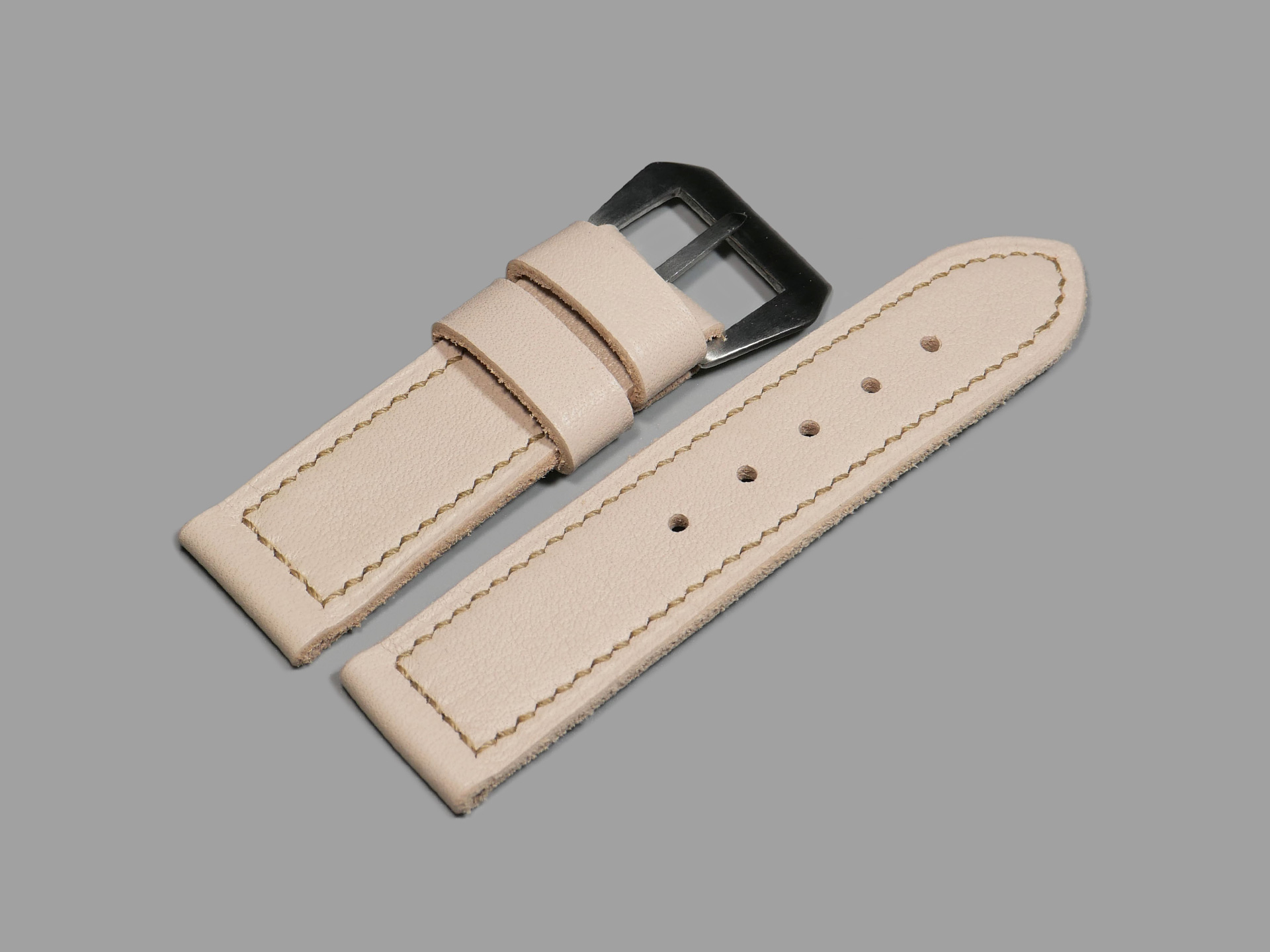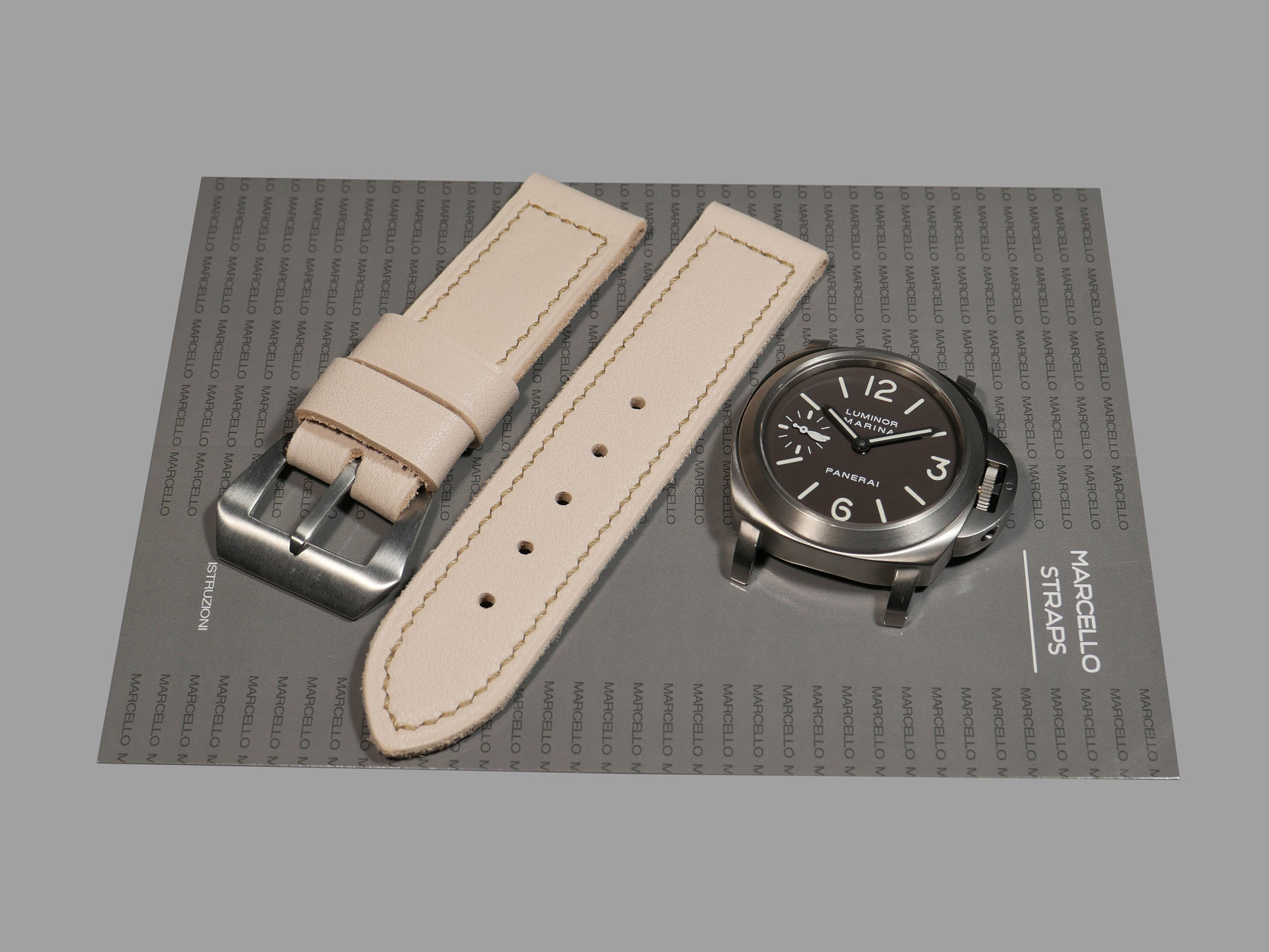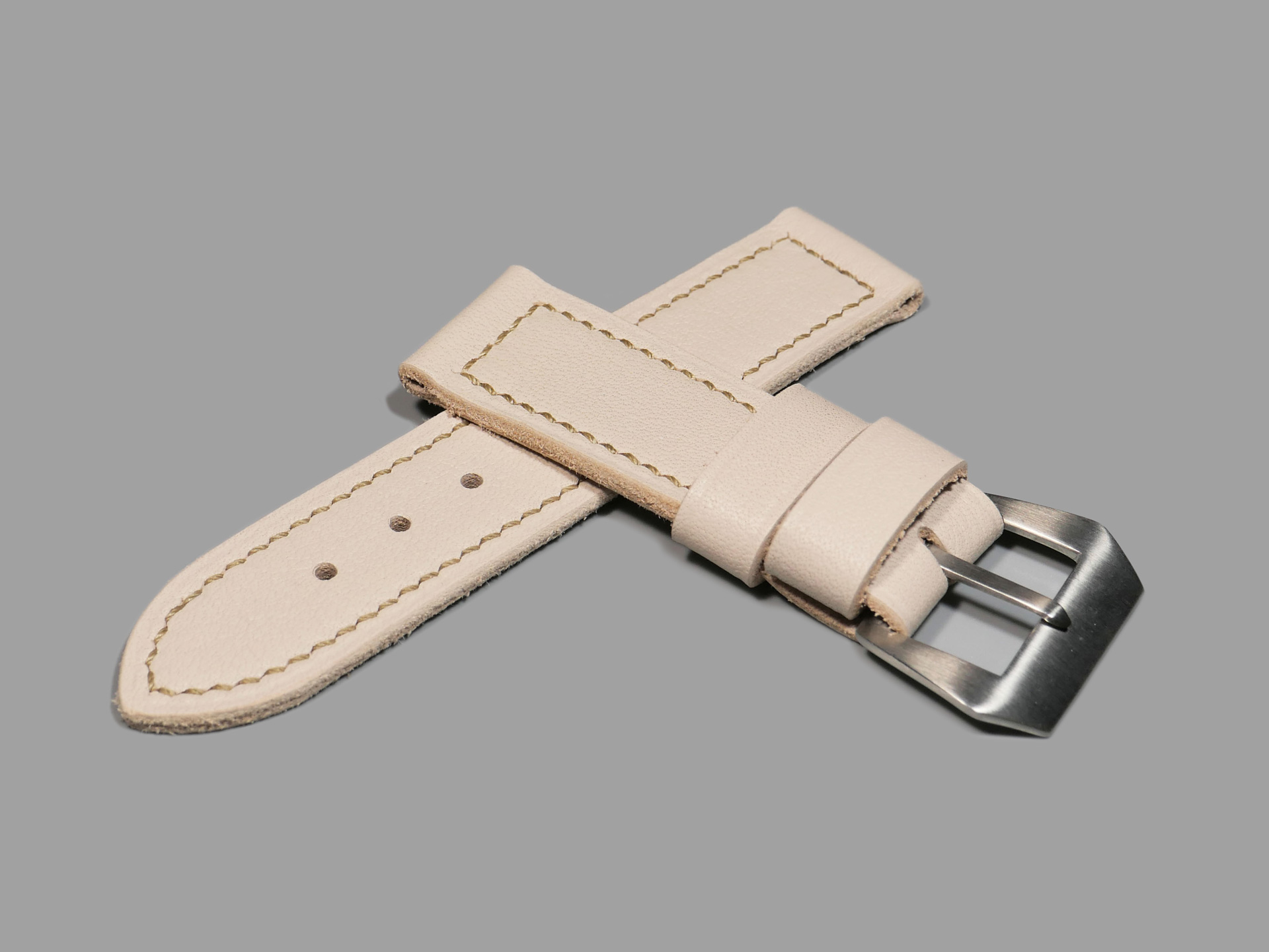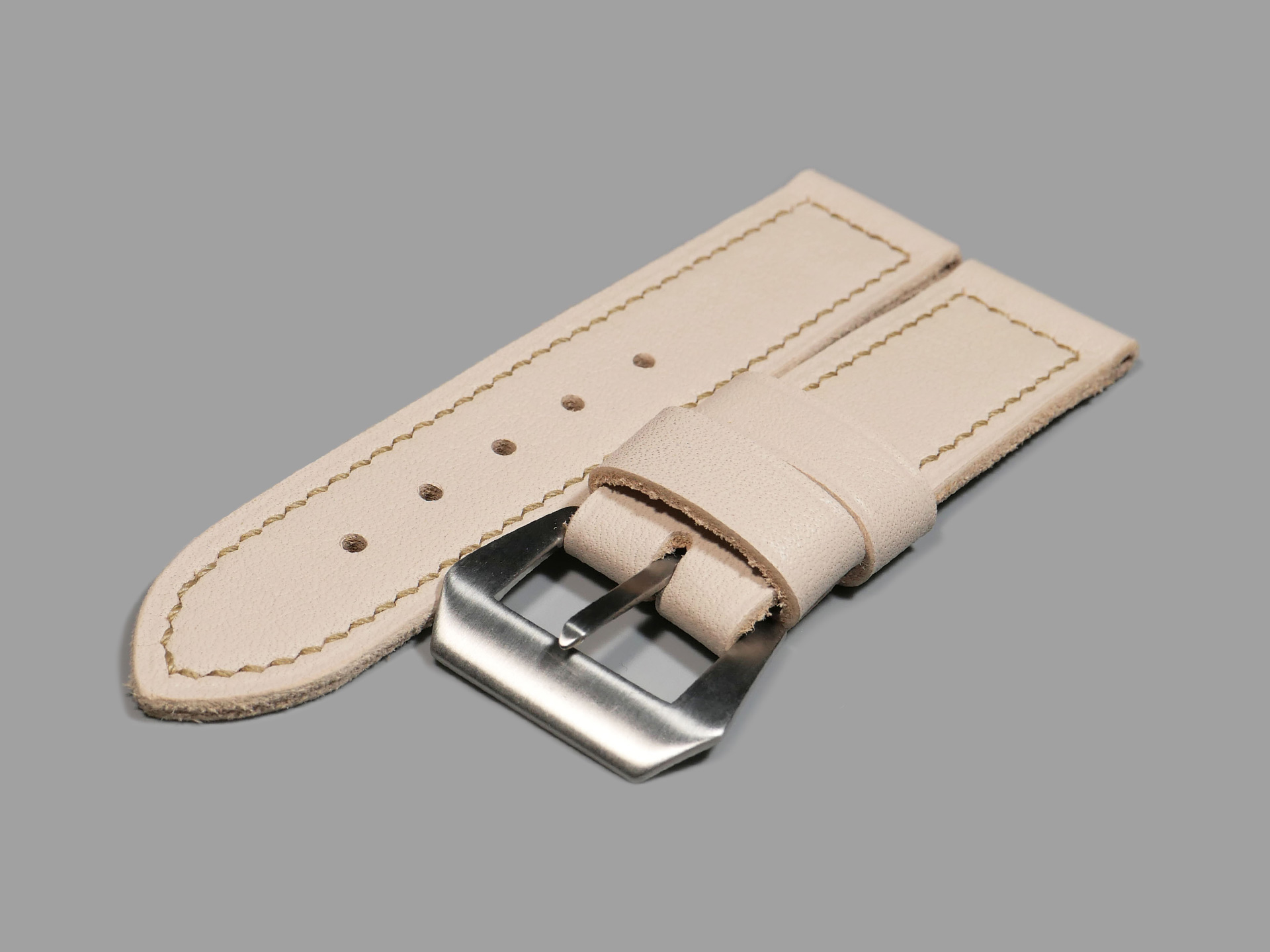 For this beefy strap, I utilized beige thread in a box stitched pattern.  This strap design features one fixed and one floating keeper.  Additionally, this strap ships by default with a brushed stainless vintage style buckle (pictured). The sample strap in the photos above measures 125/80.  As usual, I can make it in any size that you prefer.  Pictured above, you may see this one of a kind handmade white 44mm Panerai strap on the Panerai Luminor Marina PAM00061. Finally, the neutral color of this white Panerai strap allows for a great deal of versatility.  Perfect strap for summer!