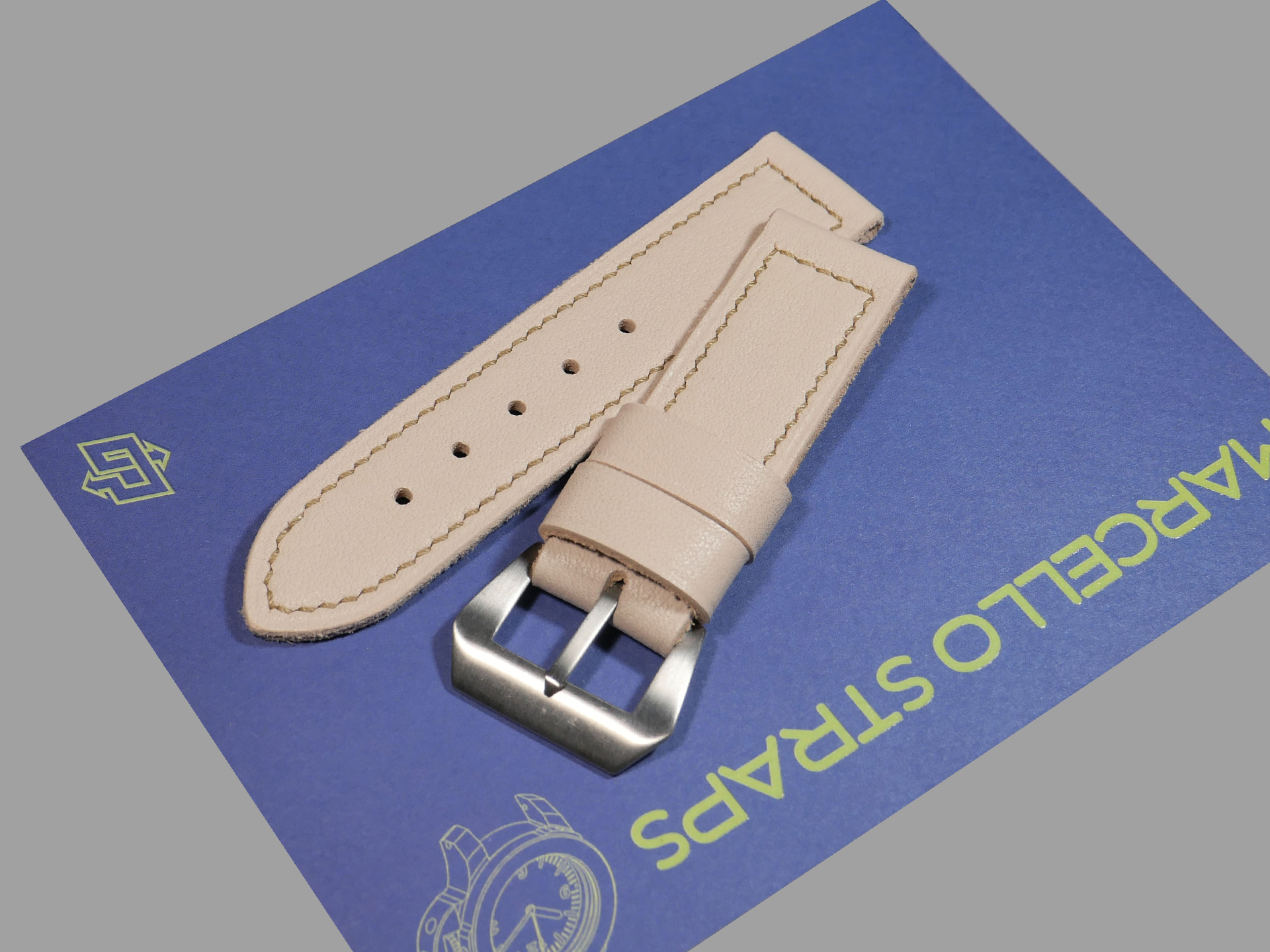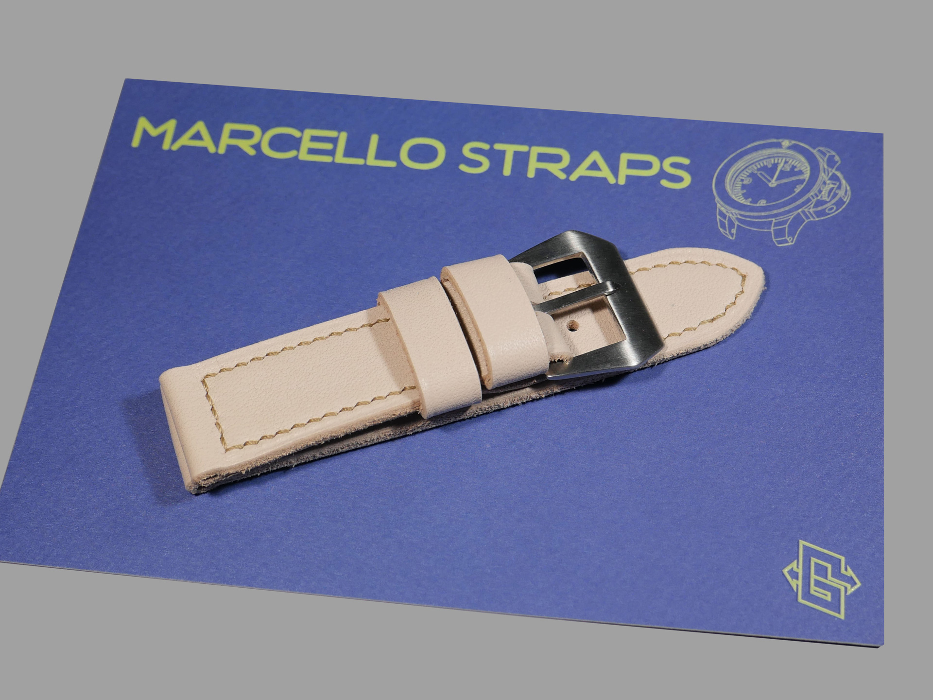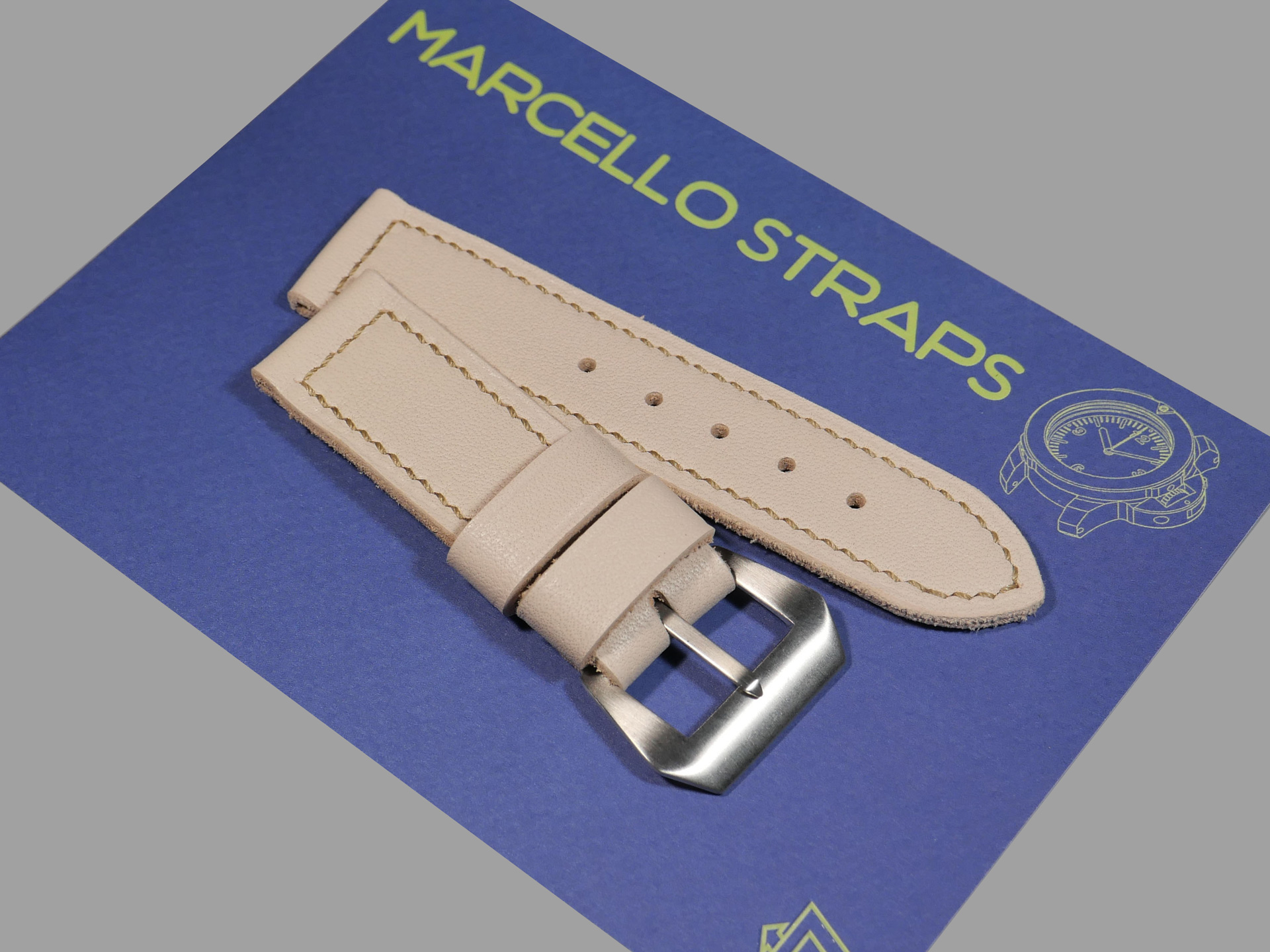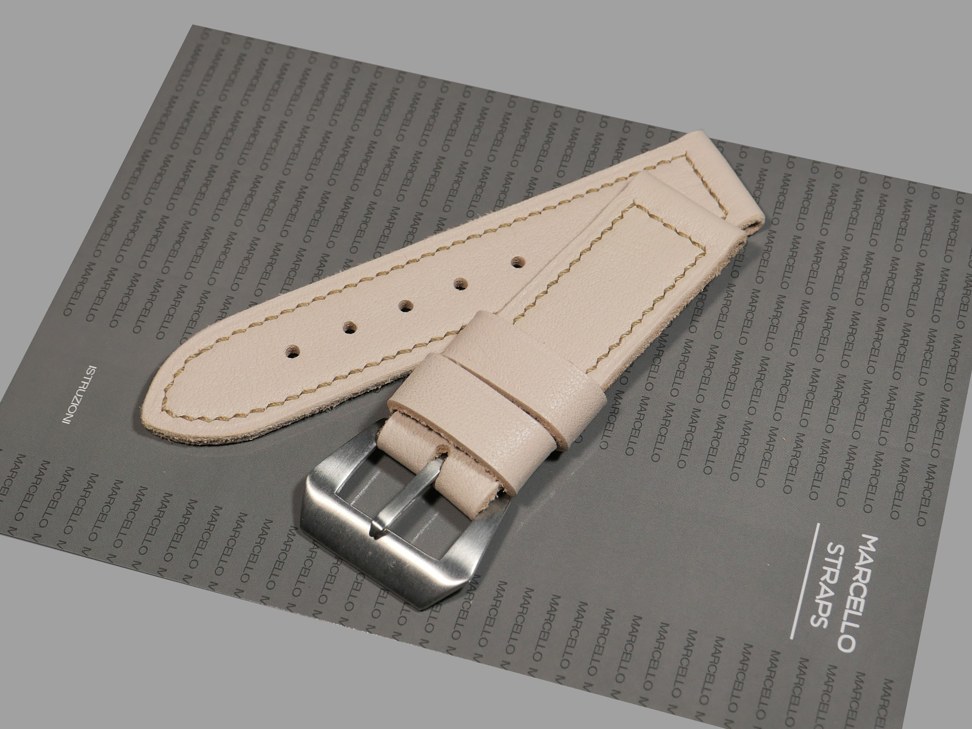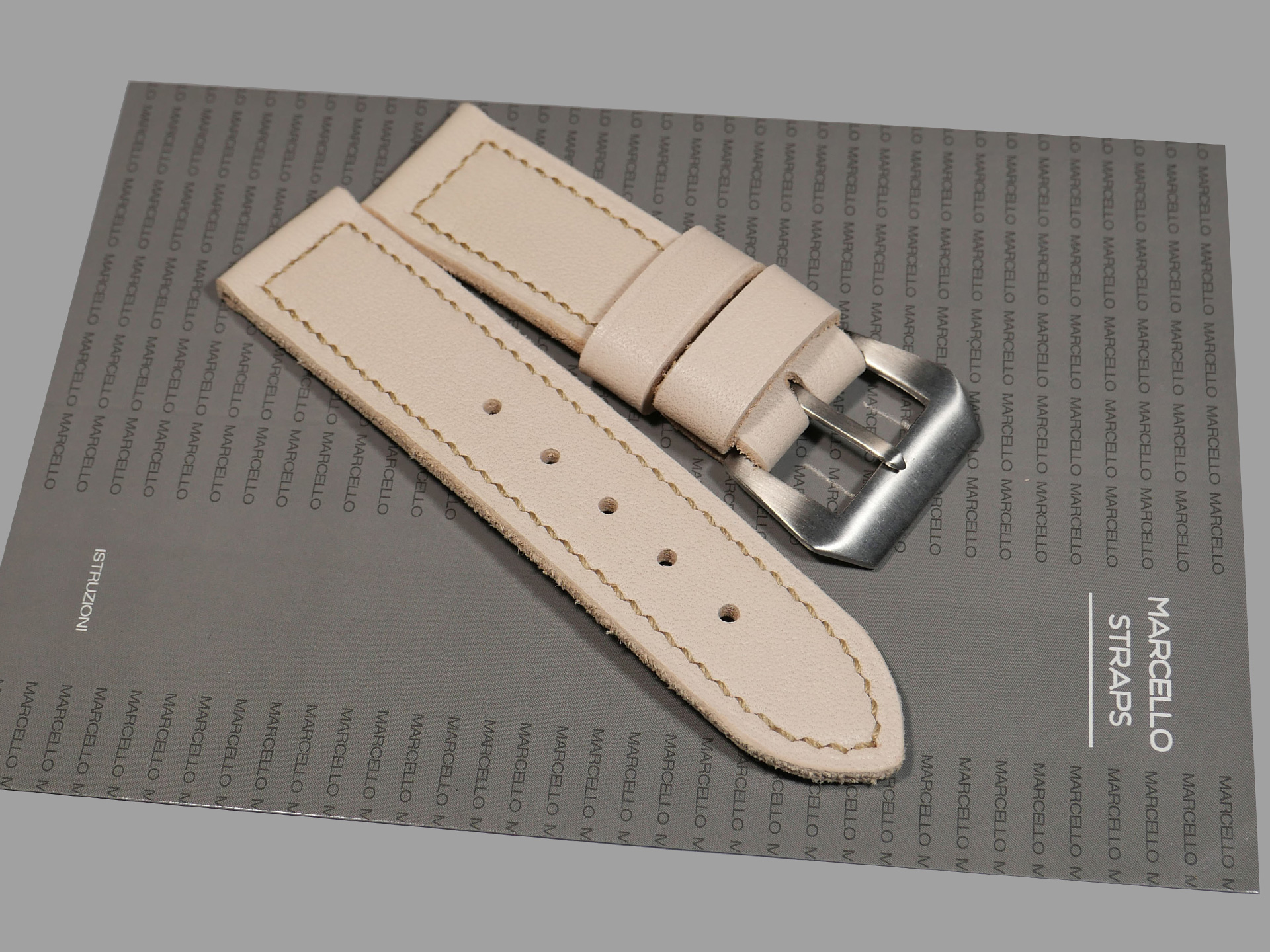 For this beefy strap, I utilized beige thread in a box stitched pattern.  This strap design features one fixed and one floating keeper.  Additionally, this strap ships by default with a brushed stainless vintage style buckle (pictured). The sample strap in the photos above measures 125/80.  As usual, I can make it in any size that you prefer.  Pictured above, you may see this one of a kind handmade white 44mm Panerai strap on the Panerai Luminor Marina PAM00061. Finally, the neutral color of this white Panerai strap allows for a great deal of versatility.  Perfect strap for summer!