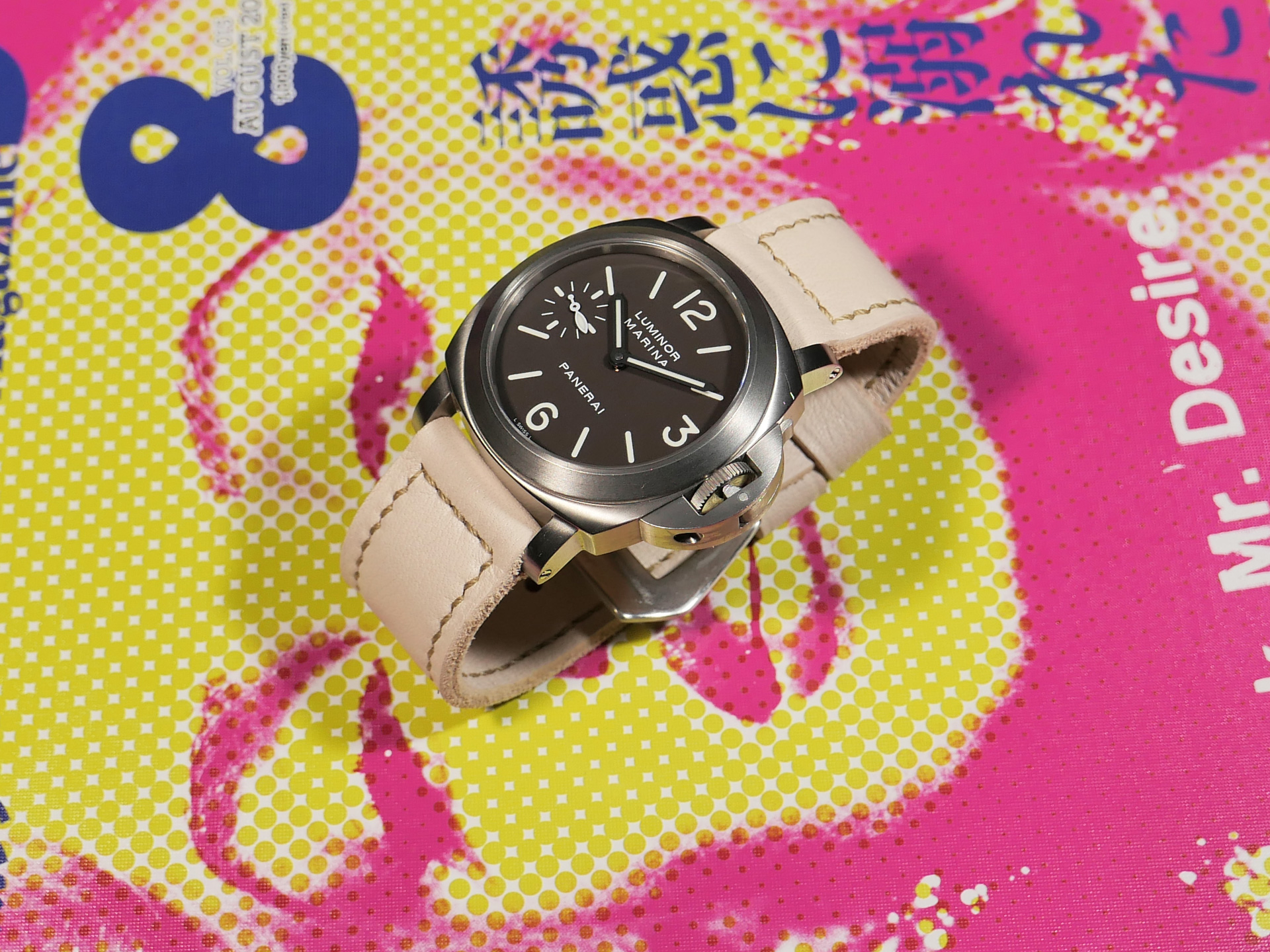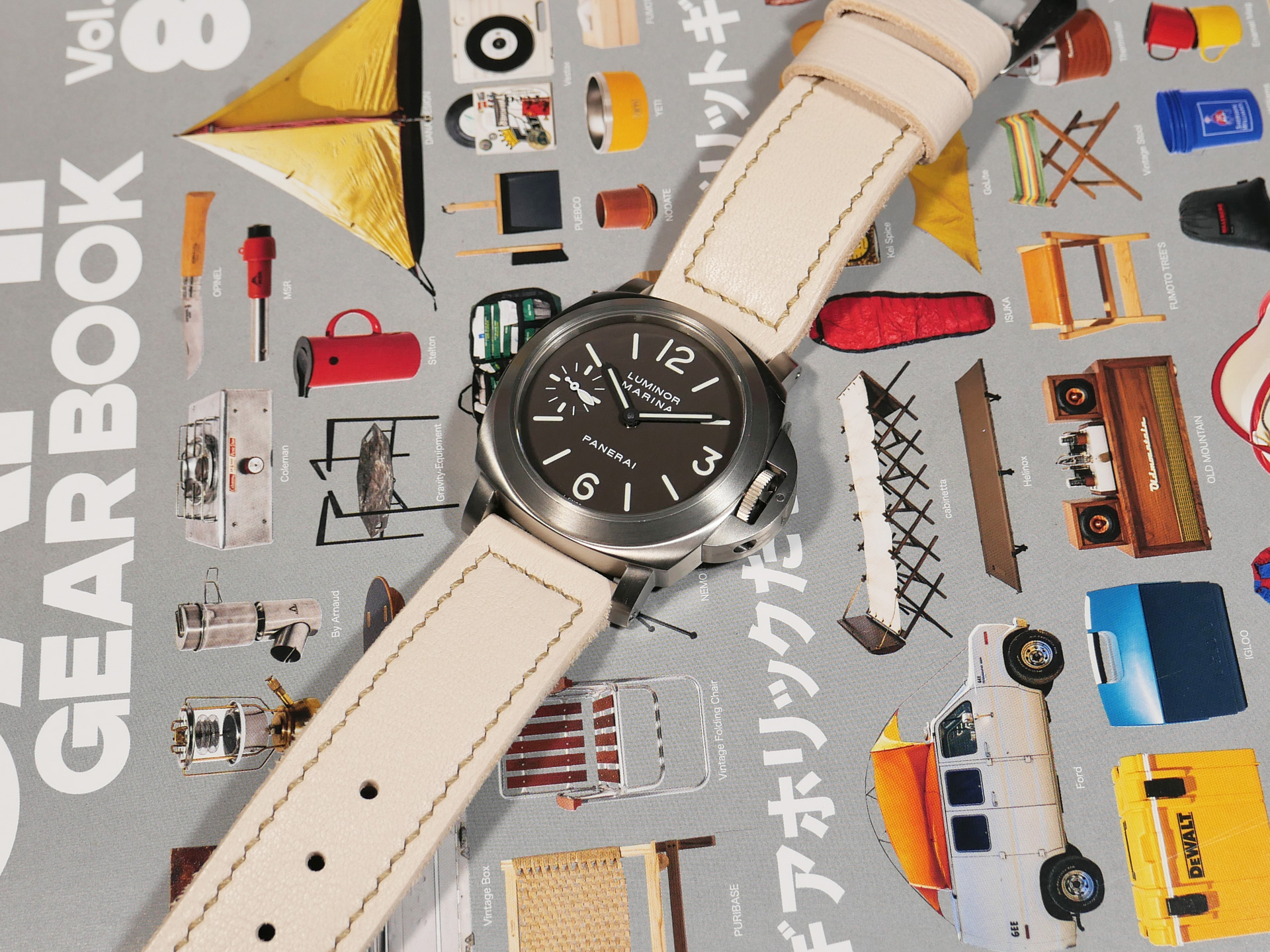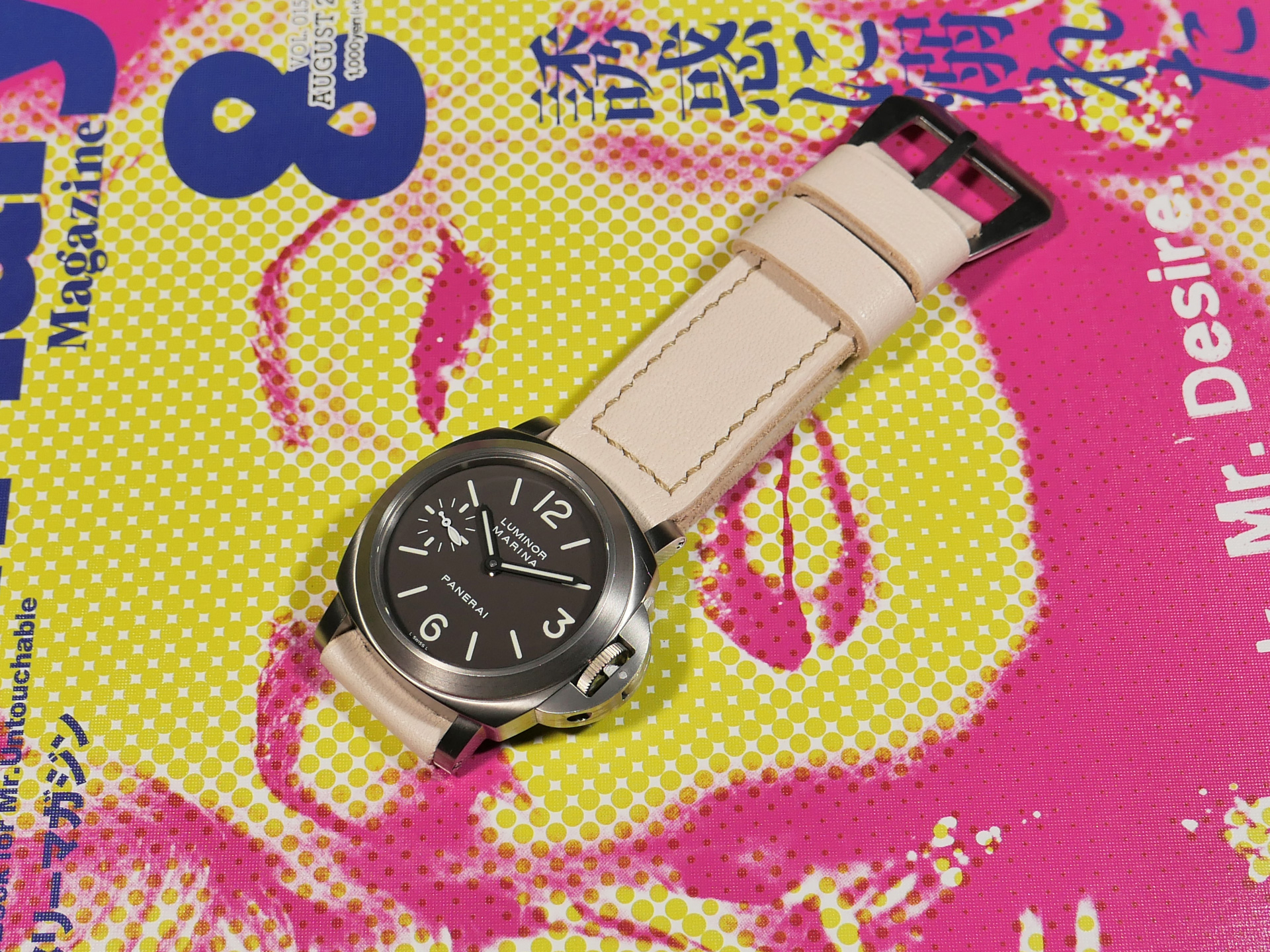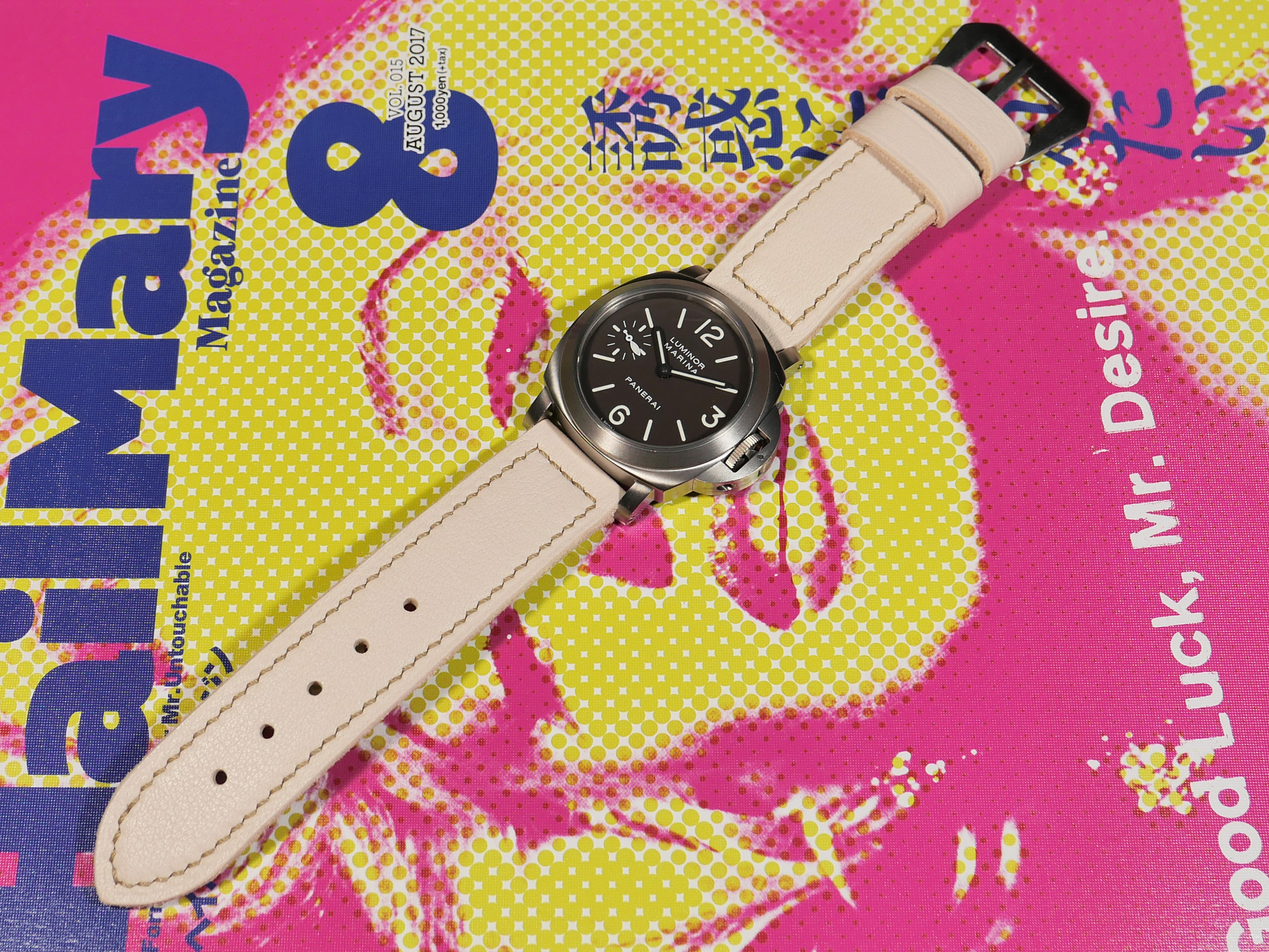 For this beefy strap, I utilized beige thread in a box stitched pattern.  This strap design features one fixed and one floating keeper.  Additionally, this strap ships by default with a brushed stainless vintage style buckle (pictured). The sample strap in the photos above measures 125/80.  As usual, I can make it in any size that you prefer.  Pictured above, you may see this one of a kind handmade white 44mm Panerai strap on the Panerai Luminor Marina PAM00061. Finally, the neutral color of this white Panerai strap allows for a great deal of versatility.  Perfect strap for summer!