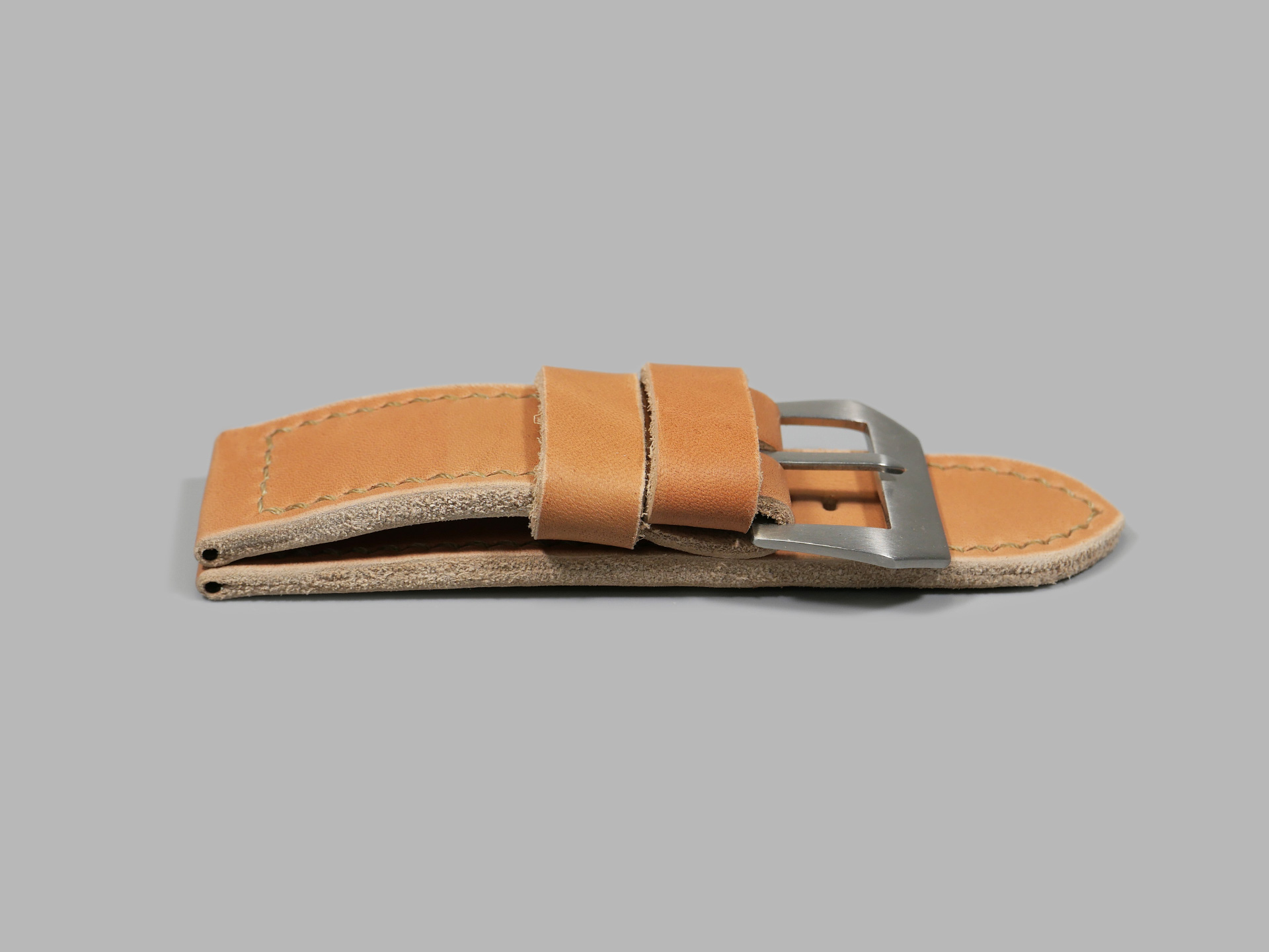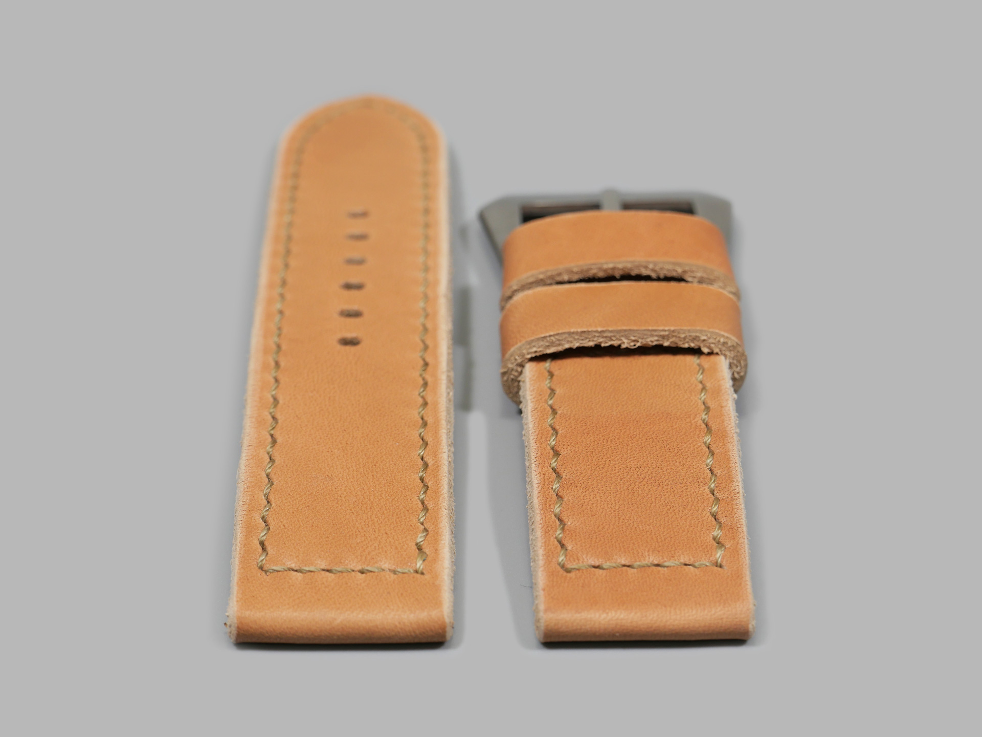 Additionally, I like the make the strap keepers nice and wide. I box stitch most 47mm Panerai straps for extra strength. On rare occasions, I may employ open ended stitching. 47mm Panerai custom straps tend to be 5.0mm thick or greater. I usually utilize vintage style stainless pin buckles that are sewn in place. These pin buckles work especially well for straps that are thicker. Vintage style Panerai pin buckles also allow for more narrow holes for the buckle. Whats more, for these 26mm wide straps I mostly employ thicker thread with a larger margin in the stitching. I adjust spacing between stitches to be slightly wider than on my 44mm or Radiomir straps.