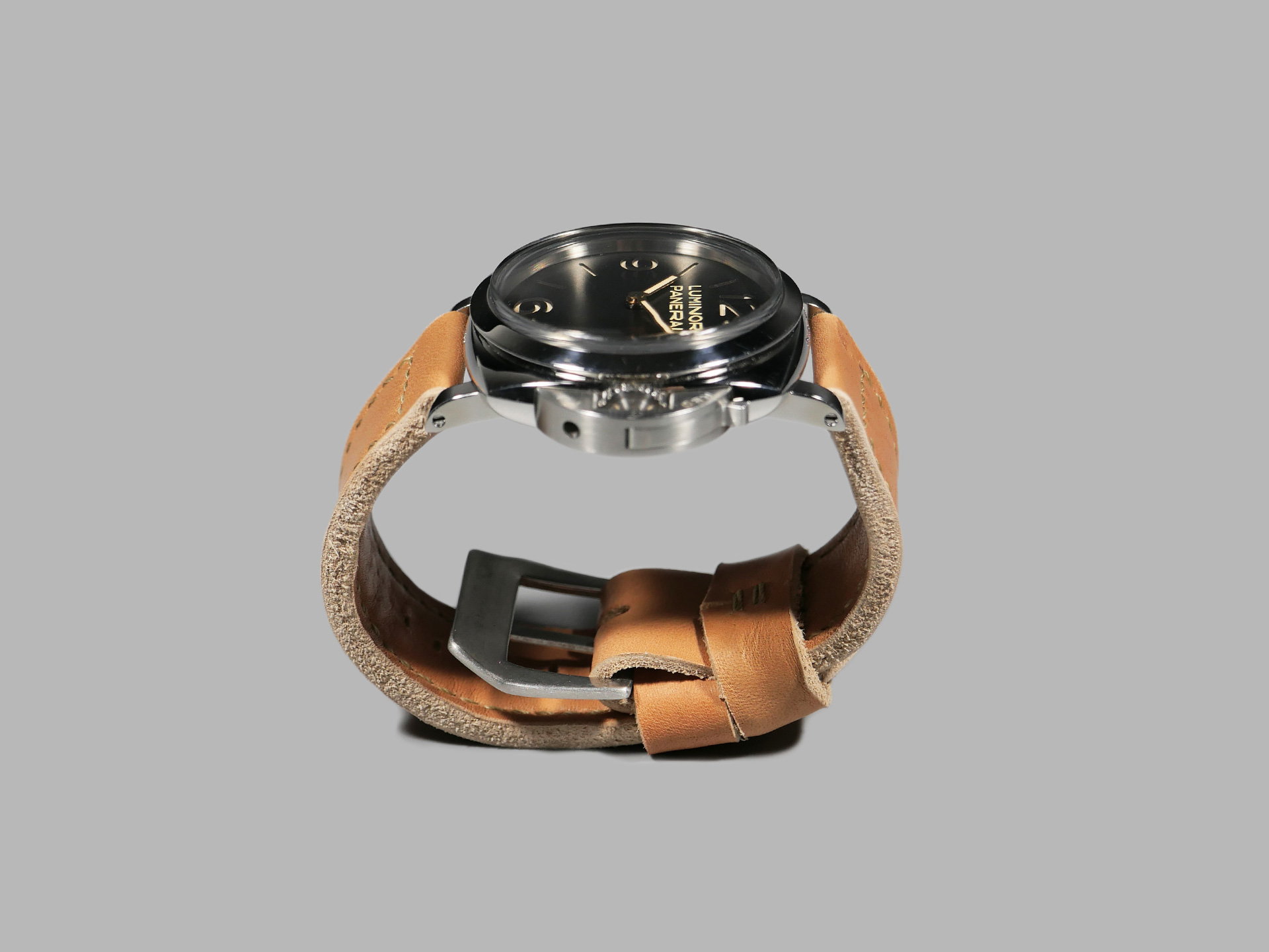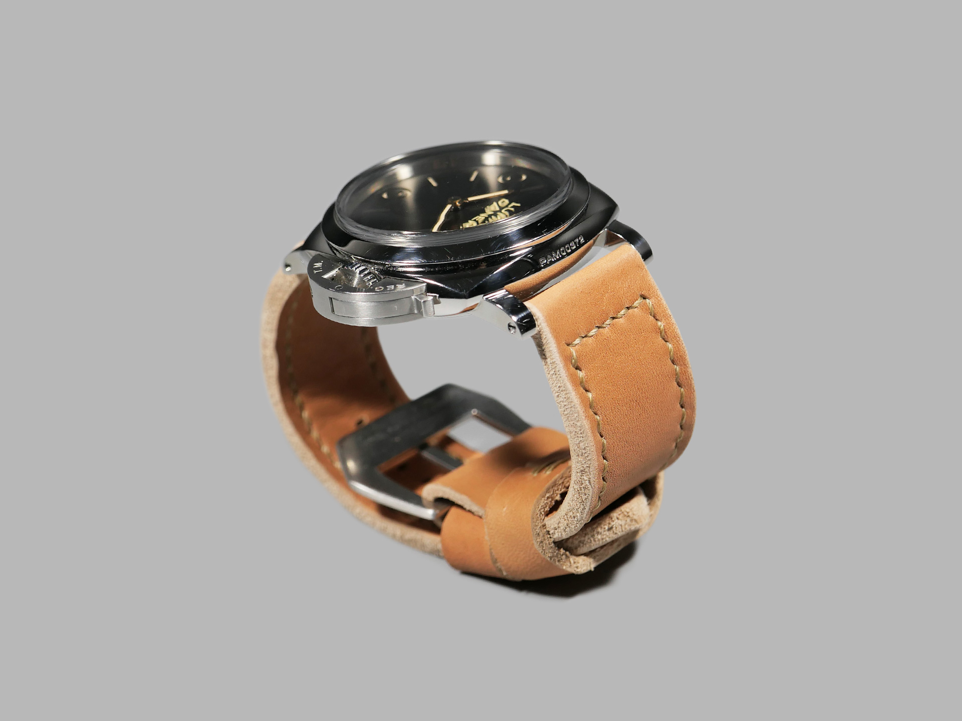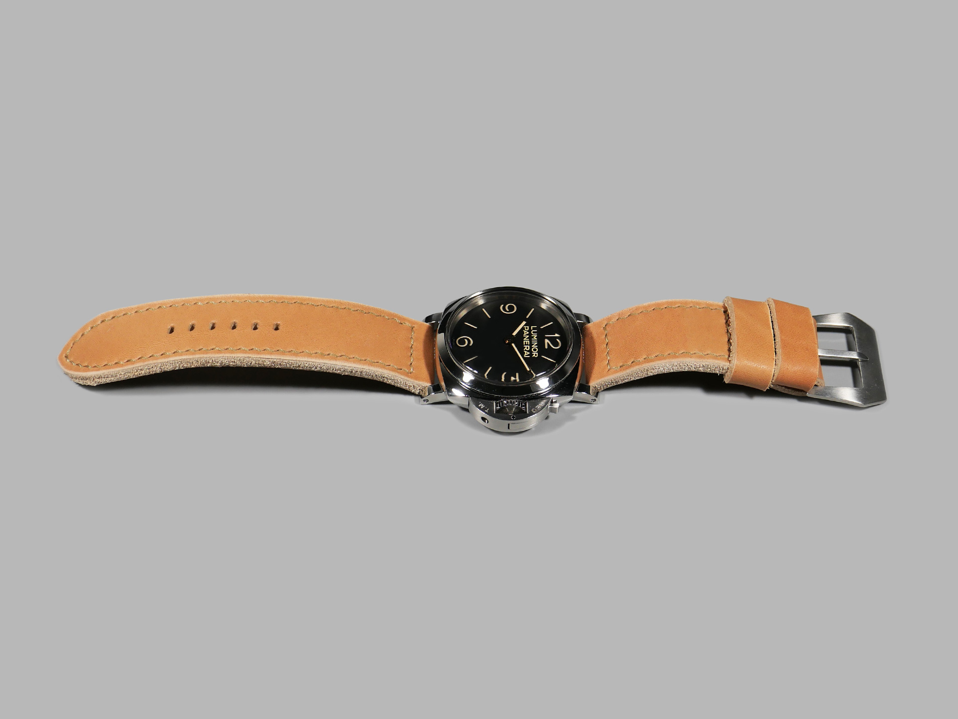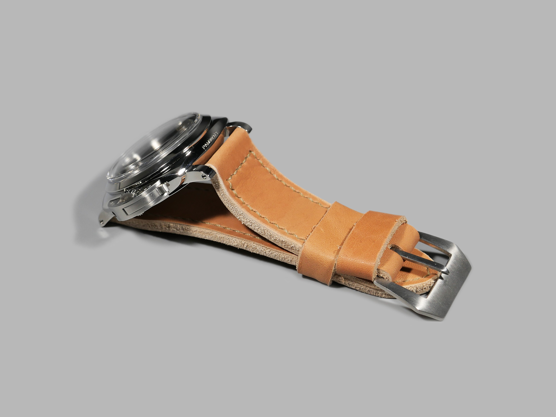 This strap ships by default with a vintage style brushed stainless pin buckle. The neutral color palette of this tan classic style Panerai strap guarantees that it will match all 47mm PAMs regardless of dial or lume color. Pictured above, you may see this legendary handmade strap on the Panerai Luminor PAM00372. This strap will age as you wear it and will no doubt become an essential part of your strap collection.