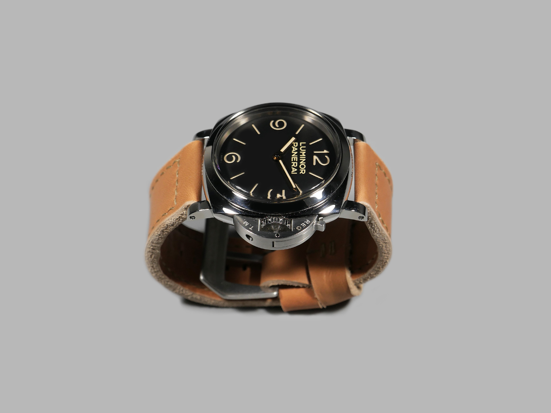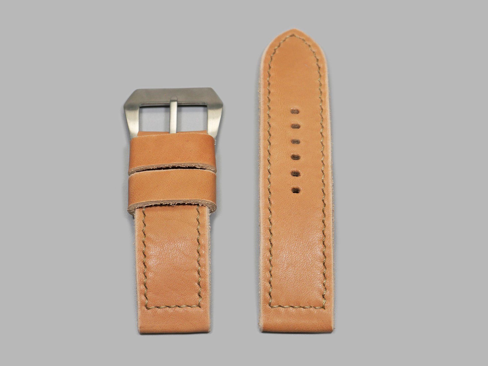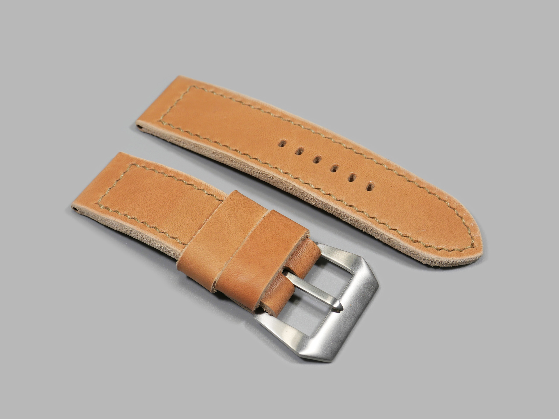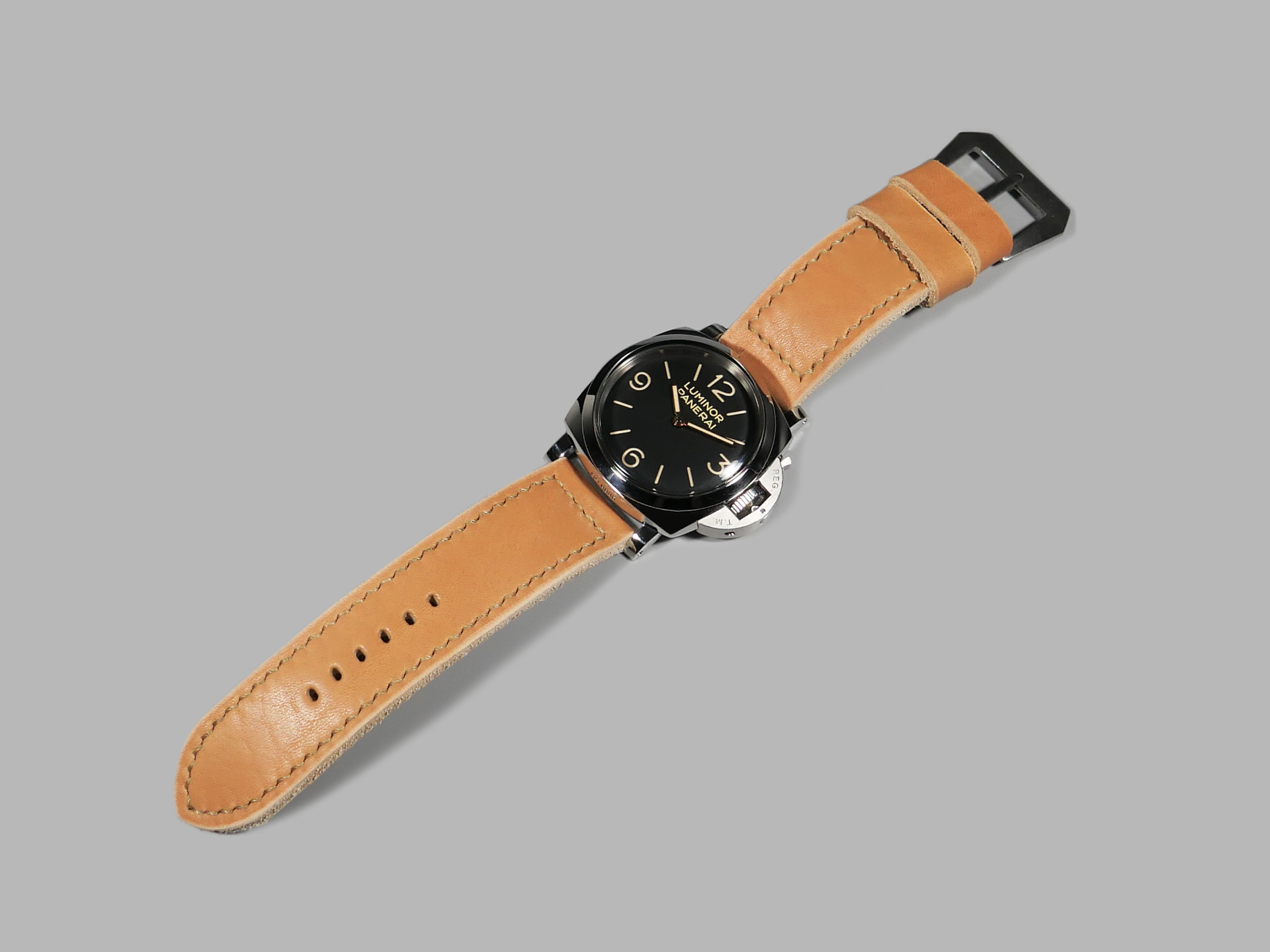 This strap ships by default with a vintage style brushed stainless pin buckle. The neutral color palette of this tan classic style Panerai strap guarantees that it will match all 47mm PAMs regardless of dial or lume color. Pictured above, you may see this legendary handmade strap on the Panerai Luminor PAM00372. This strap will age as you wear it and will no doubt become an essential part of your strap collection.
