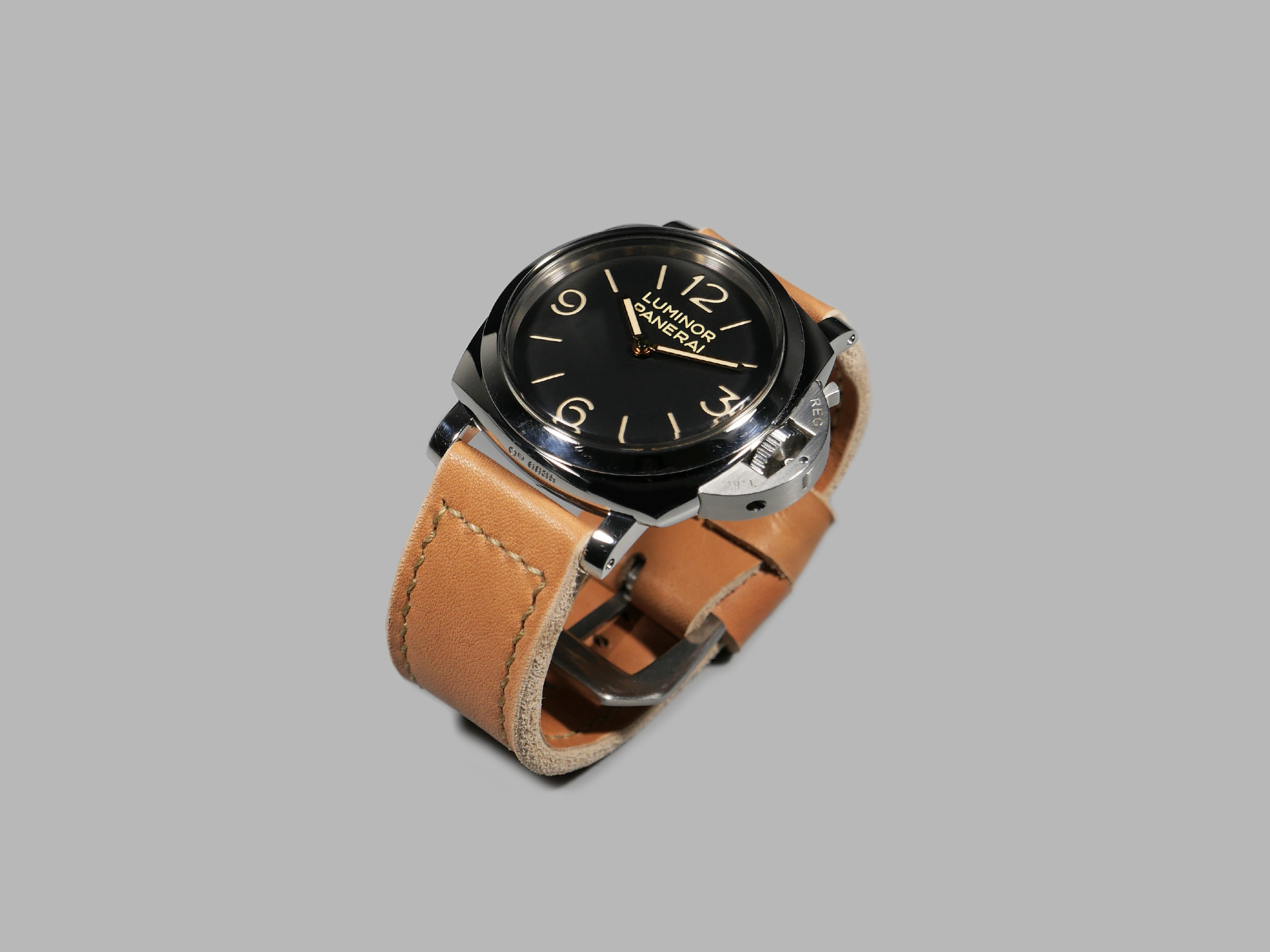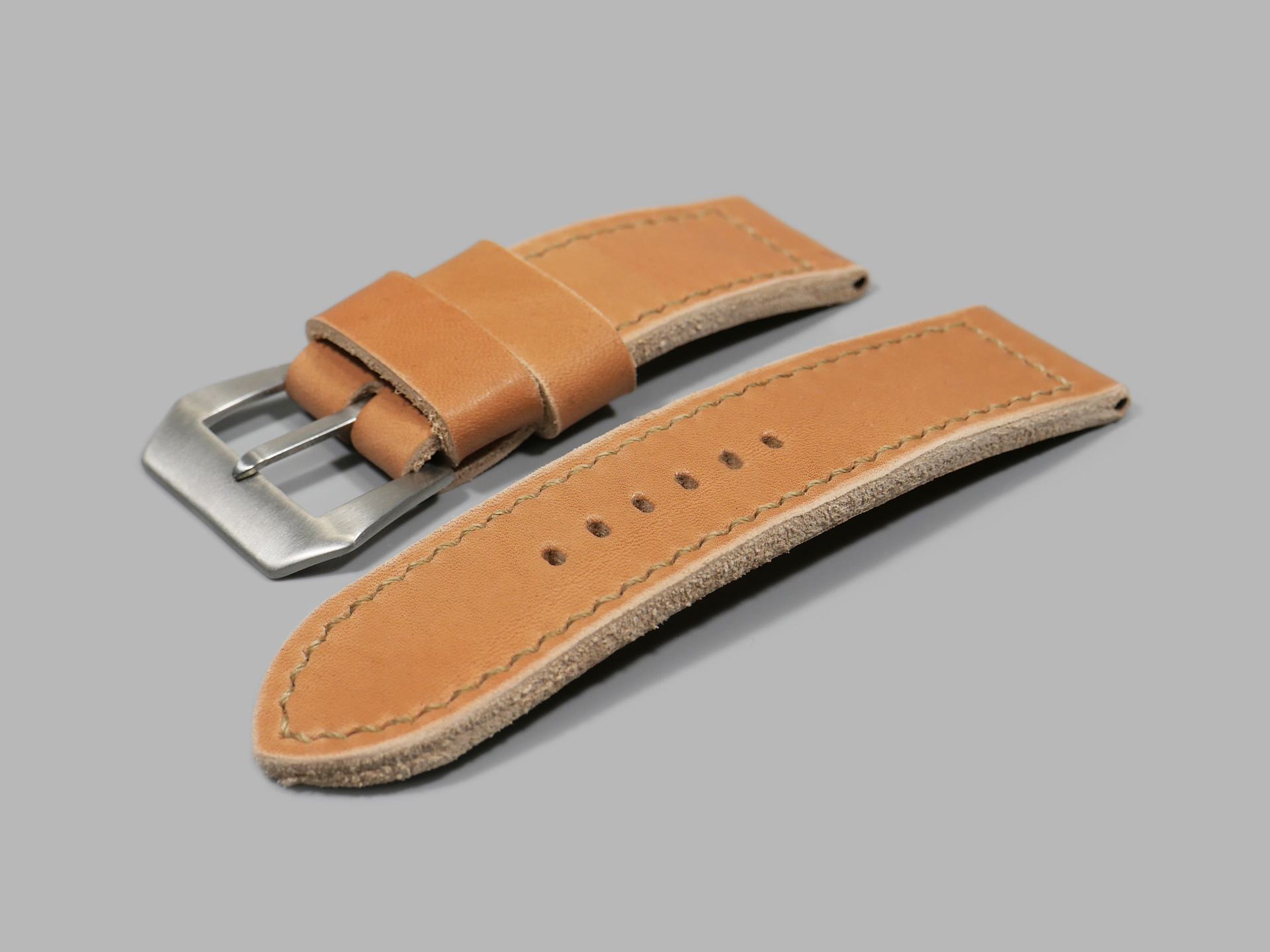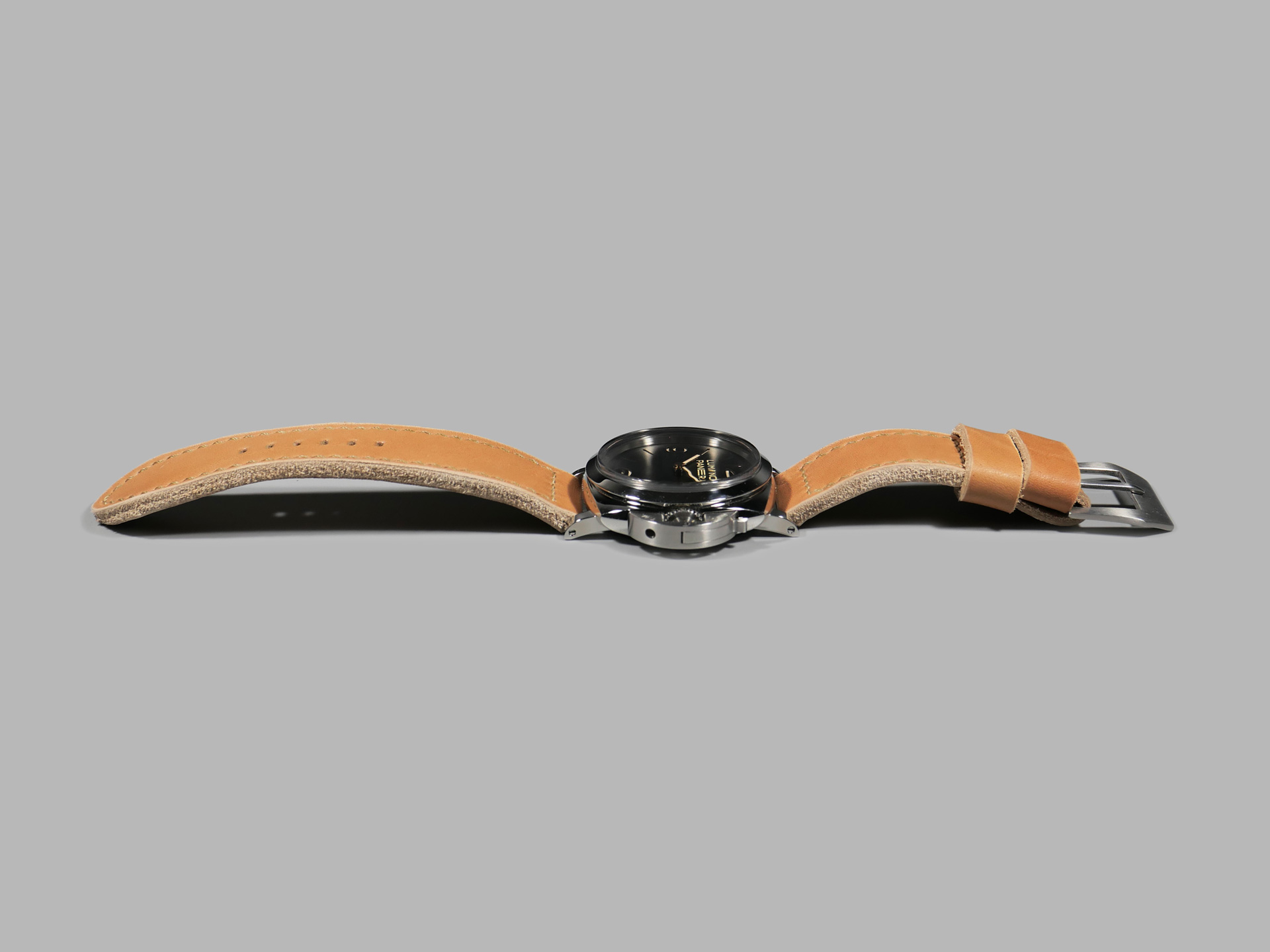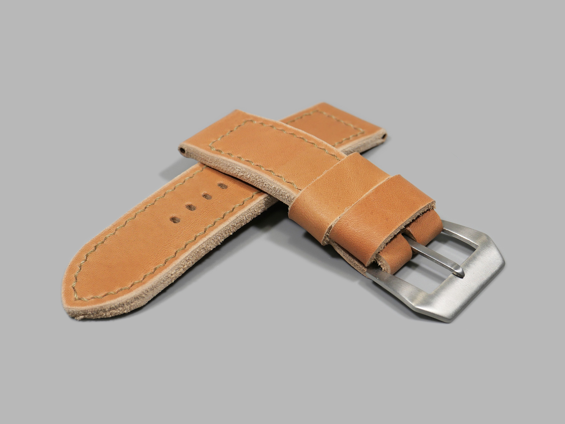 This strap ships by default with a vintage style brushed stainless pin buckle. The neutral color palette of this tan classic style Panerai strap guarantees that it will match all 47mm PAMs regardless of dial or lume color. Pictured above, you may see this legendary handmade strap on the Panerai Luminor PAM00372. This strap will age as you wear it and will no doubt become an essential part of your strap collection.