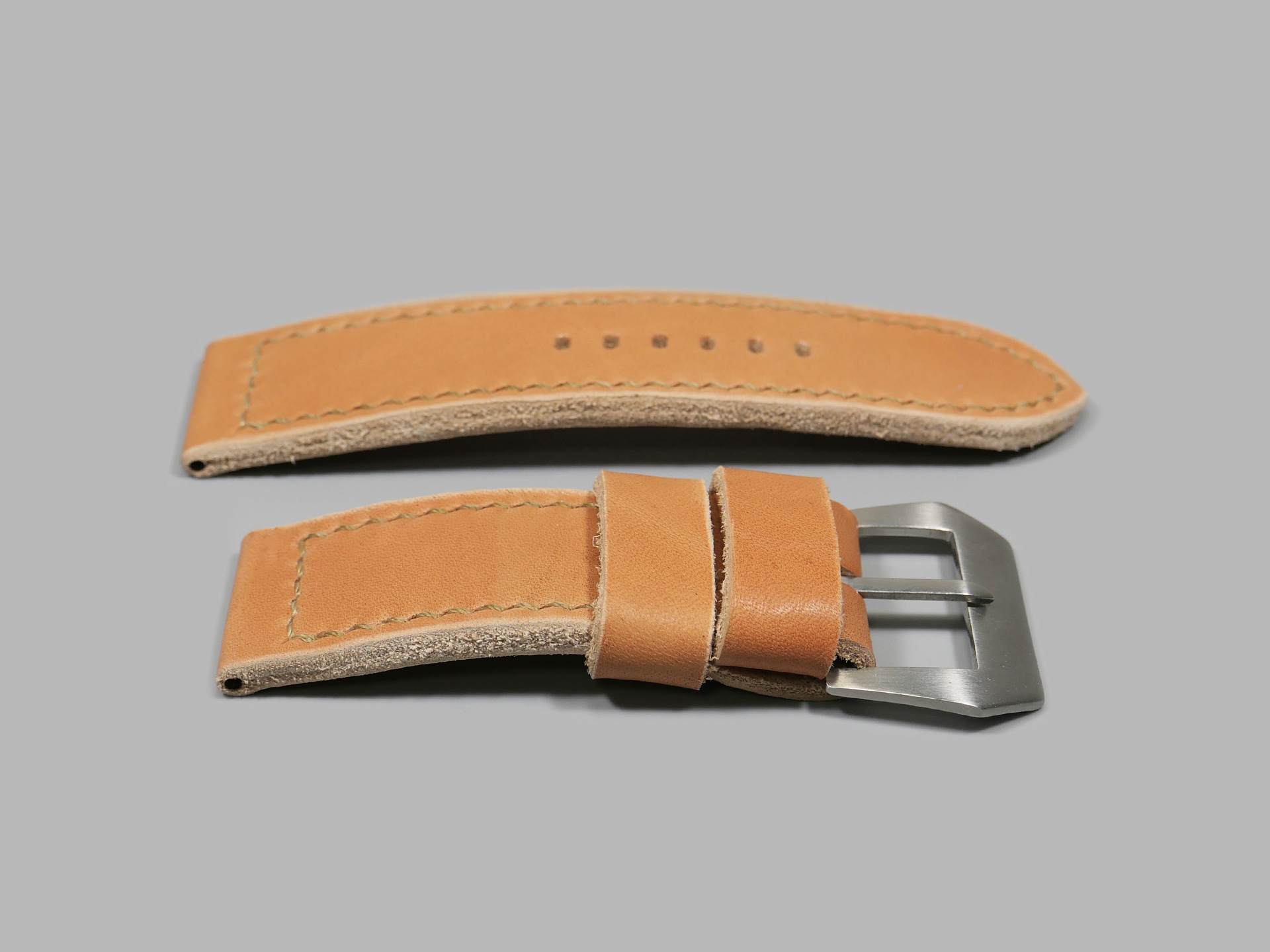 About the Leather: I created this next level, distressed super soft Panerai strap 100% by hand and hand stitched it, as with all of my straps. This is a distressed vegetable tanned leather with a very soft temper. Being a distressed leather, the top finish will show signs of wear, scuff marks, fat lines, grain creases and color variations. These elements add character to the leather. This super soft Panerai strap wears very comfortably on the wrist. The color is a whiskey tan tone but shows variation across the surface. The inner is a lighter tone than the surface. I utilized beige thread to lend a classic aesthetic. This strap design features one fixed and one floating keeper. The edges of the strap are distressed.
