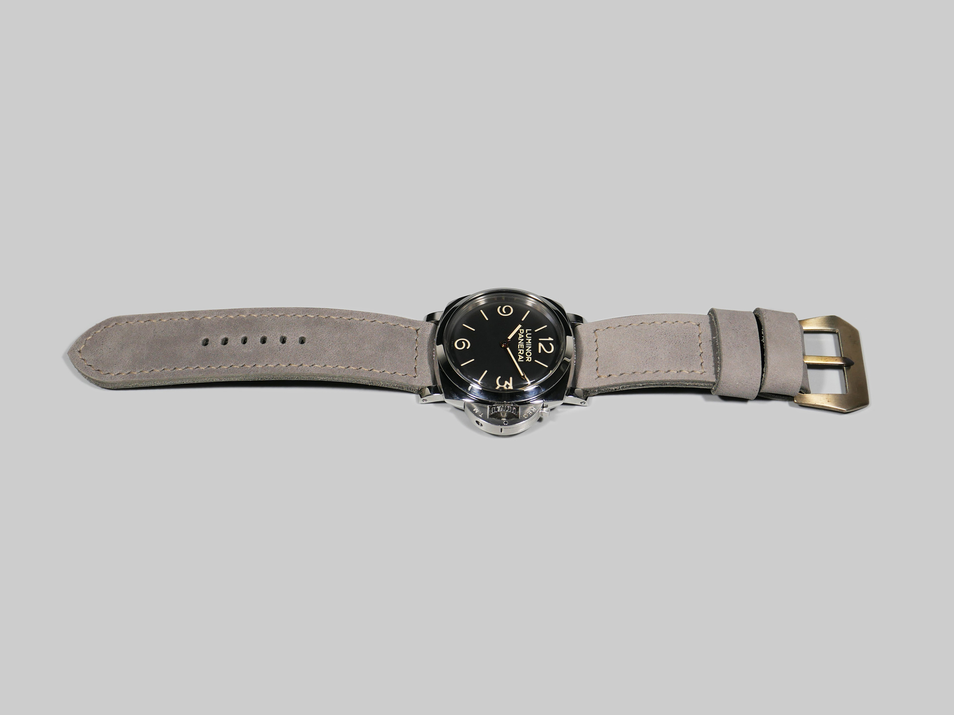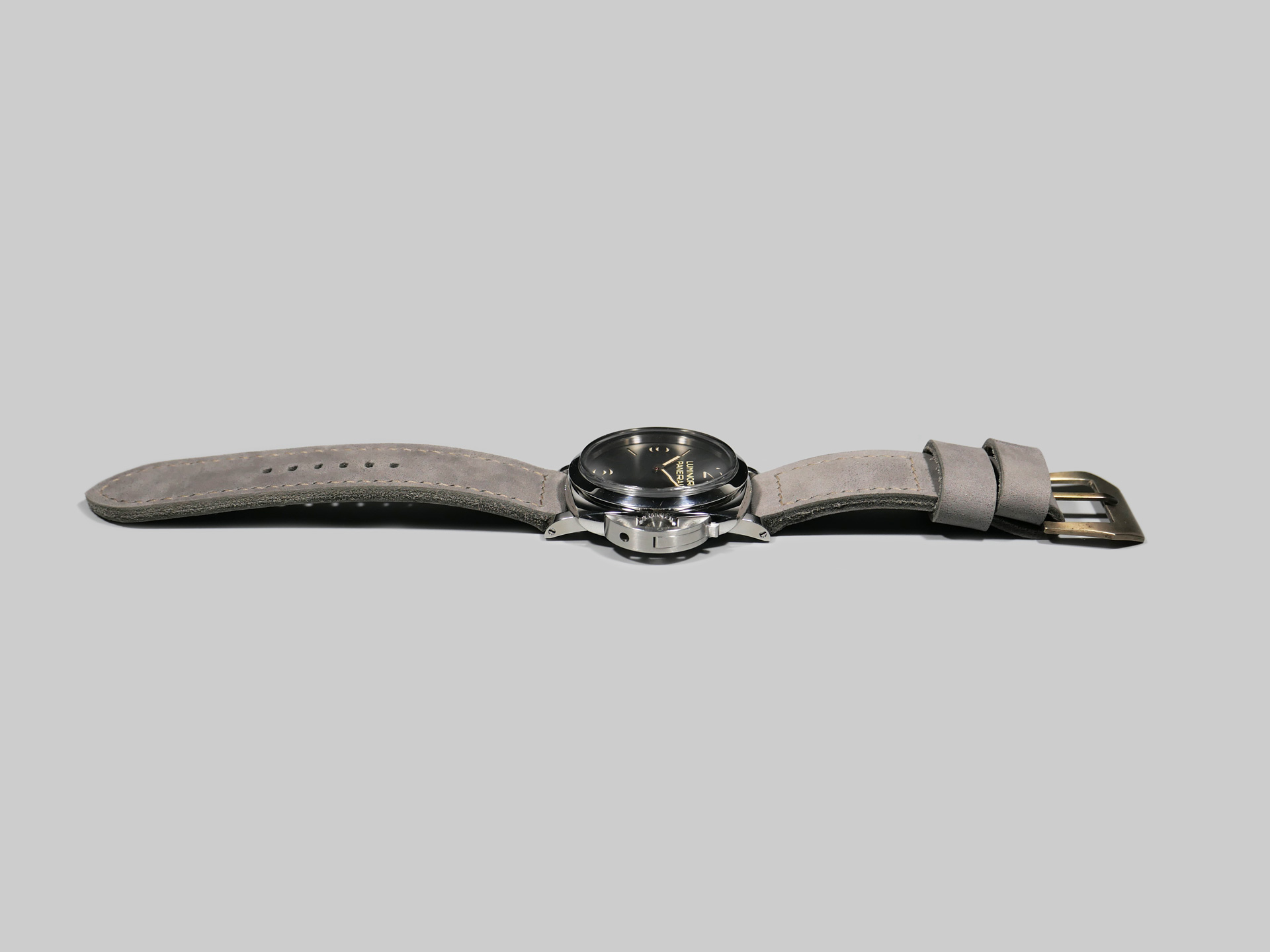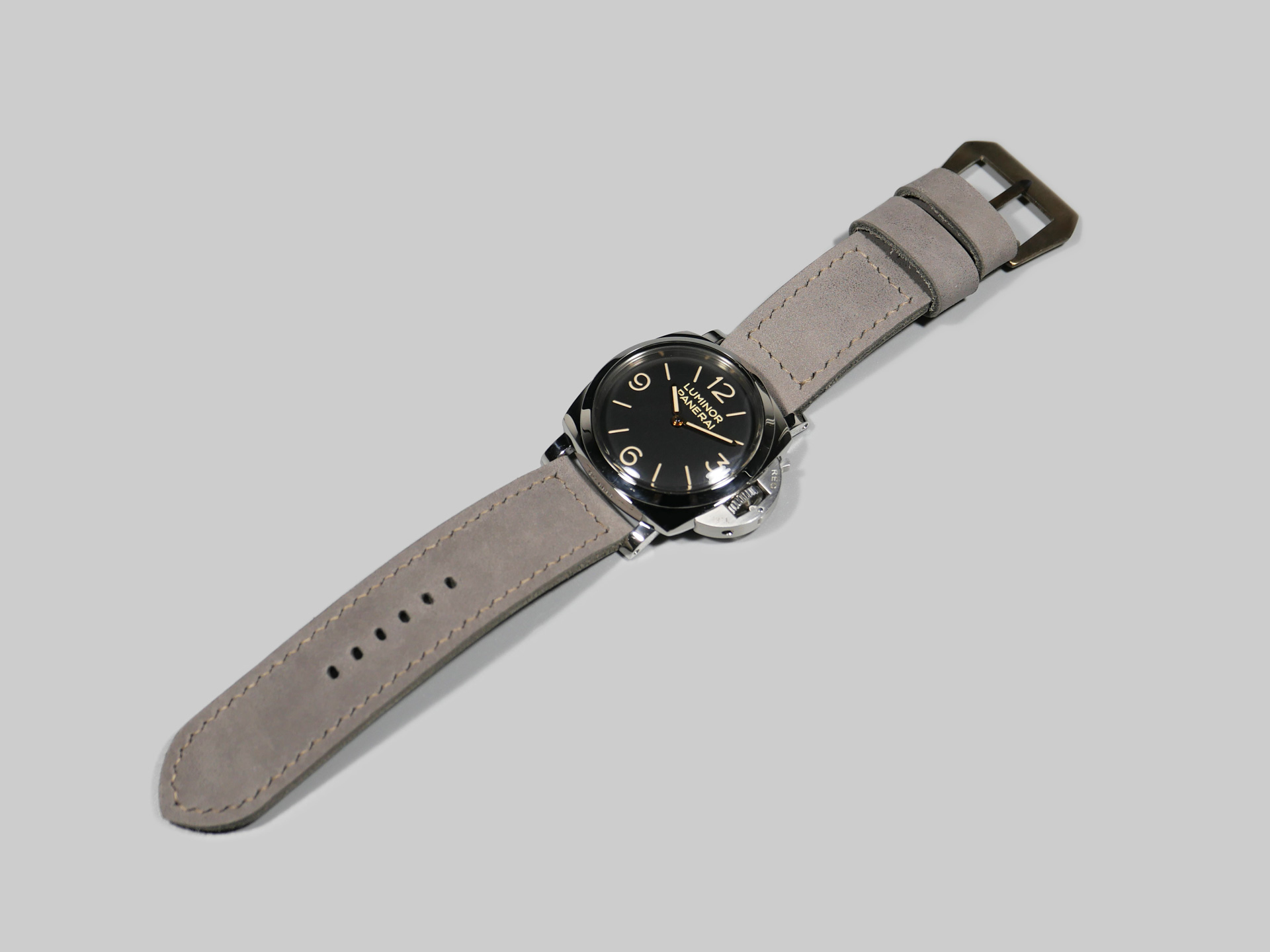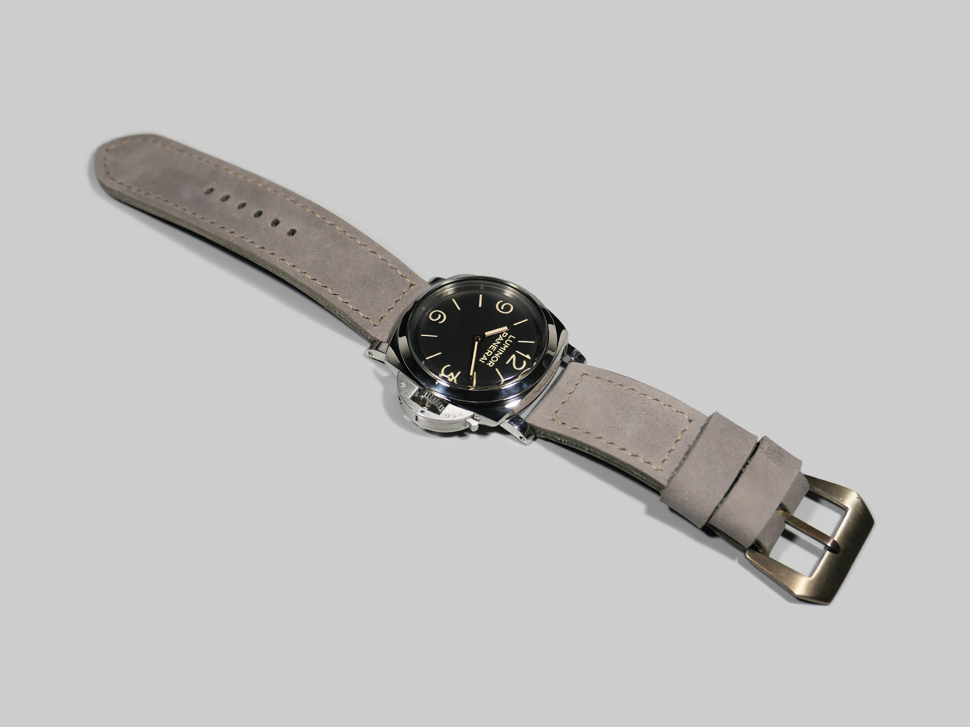 I have aged the stainless buckle in the photo with an electro-chemical process, in this case giving it a unique aged tone. You may also request a plain stainless buckle in substitute at no additional fee using the drop down menu. A perfect match for essentially any dial and indication combo. Pictured above on the stunning PAM00372, you can see how the tone of this ghost lilac Panerai 47mm strap plays nicely with the matte dial.