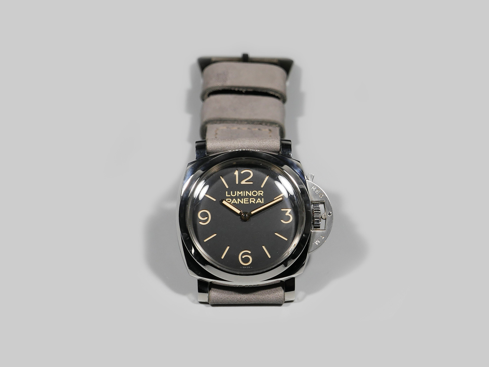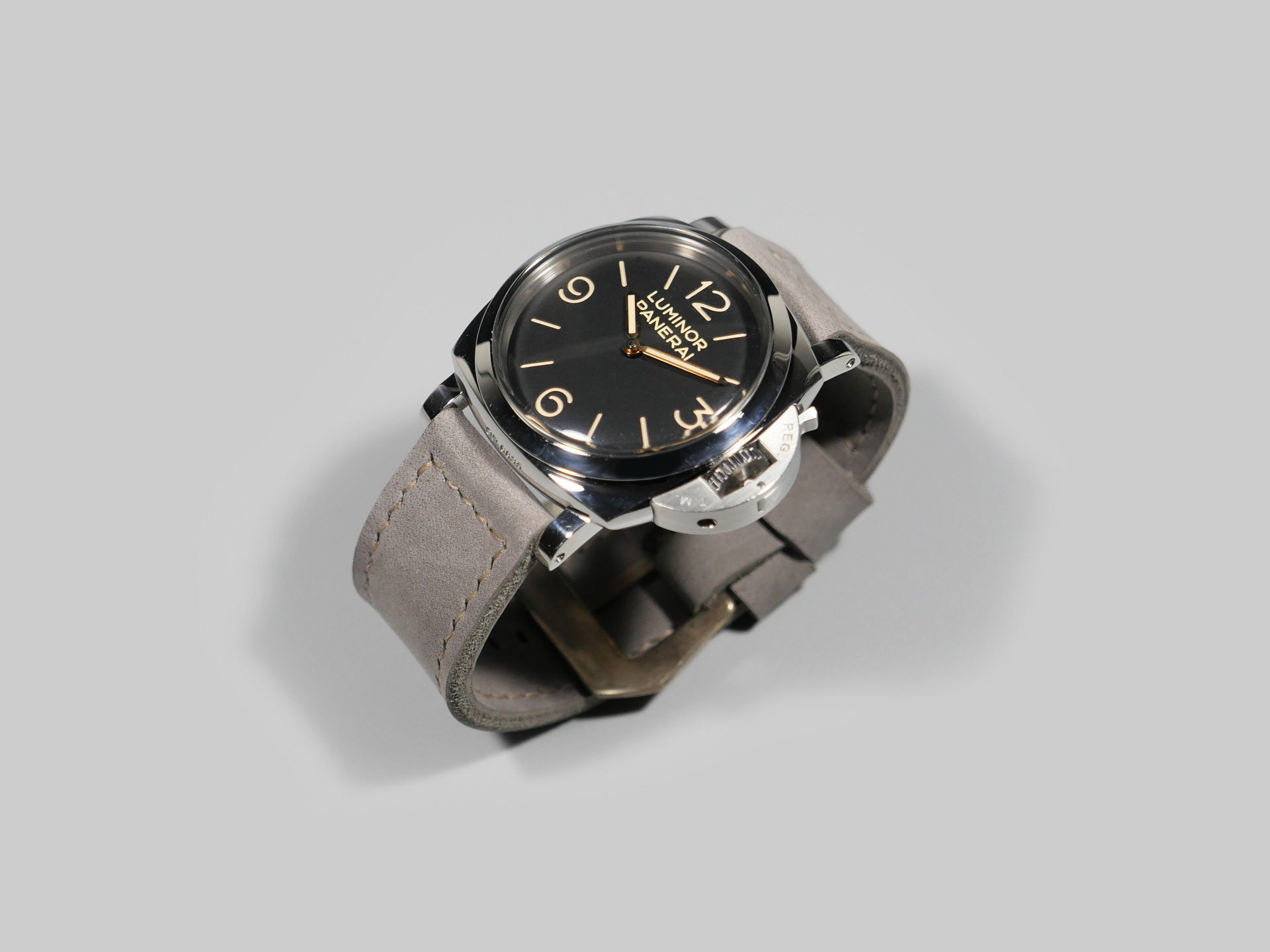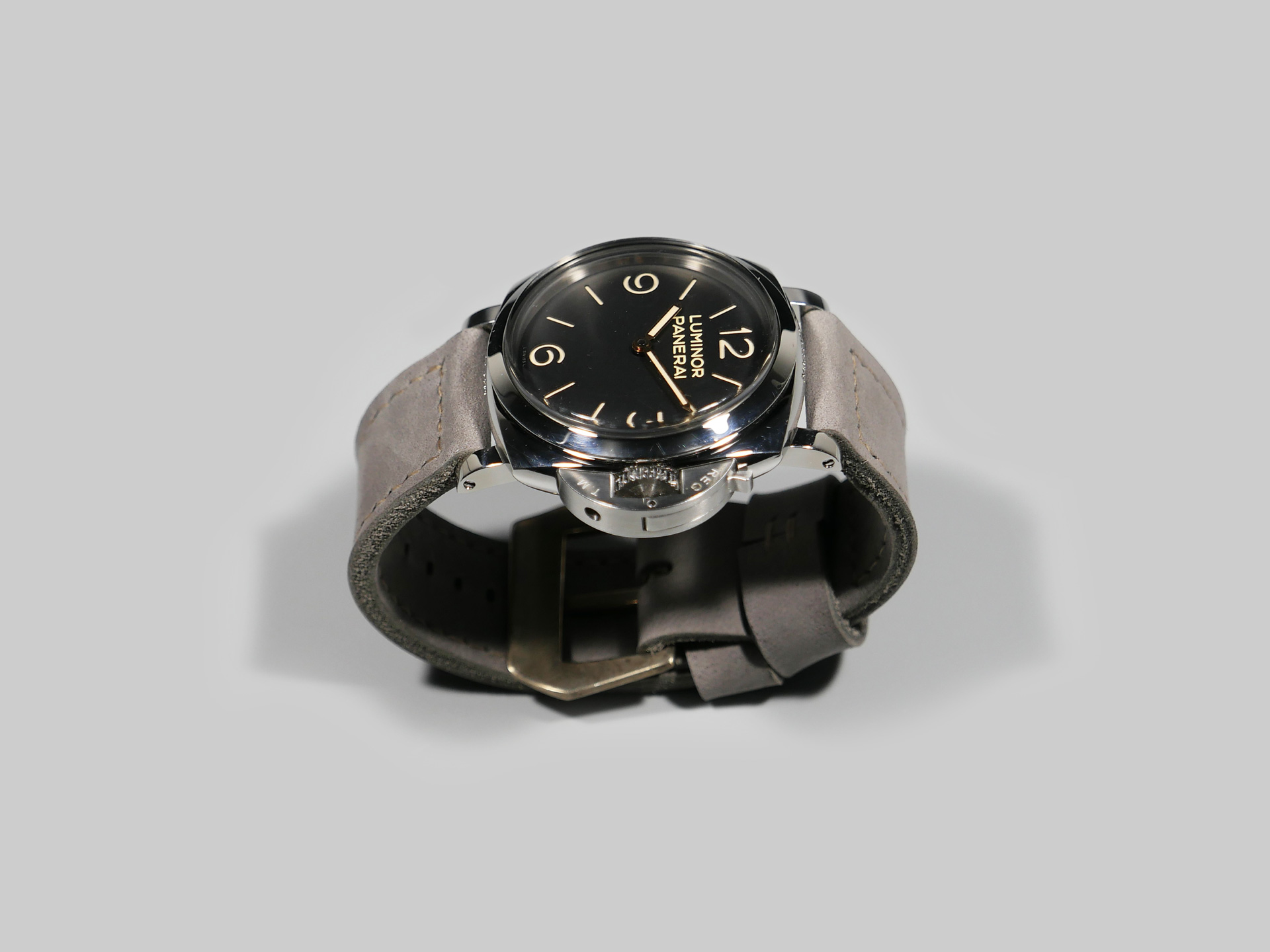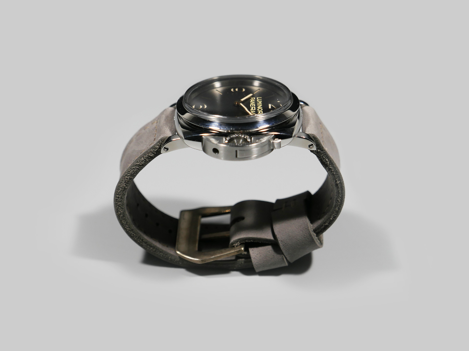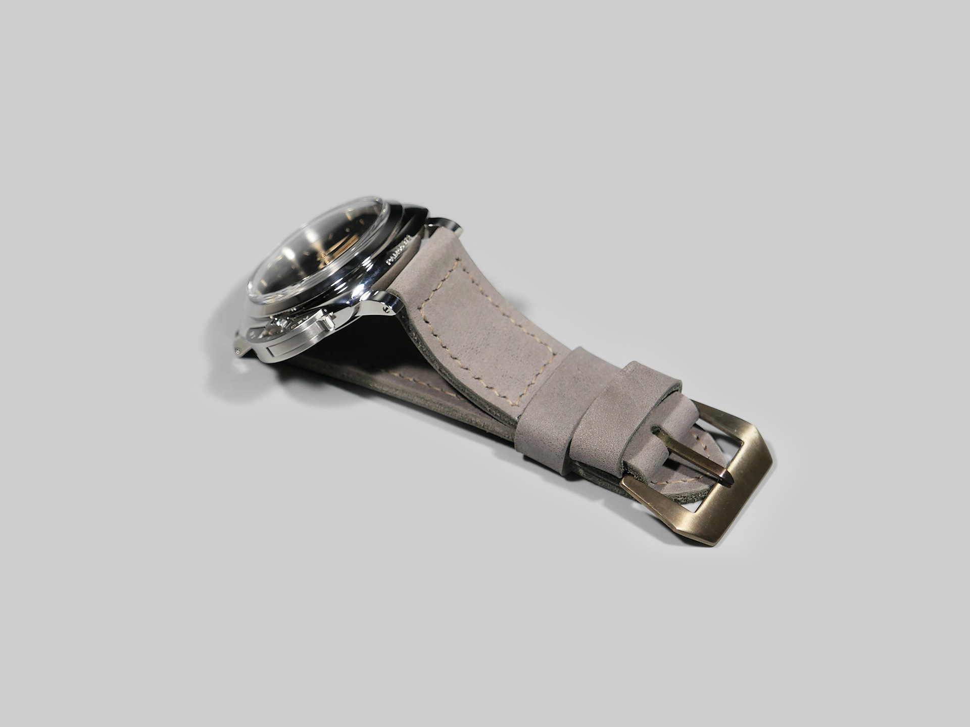 I have aged the stainless buckle in the photo with an electro-chemical process, in this case giving it a unique aged tone. You may also request a plain stainless buckle in substitute at no additional fee using the drop down menu. A perfect match for essentially any dial and indication combo. Pictured above on the stunning PAM00372, you can see how the tone of this ghost lilac Panerai 47mm strap plays nicely with the matte dial.