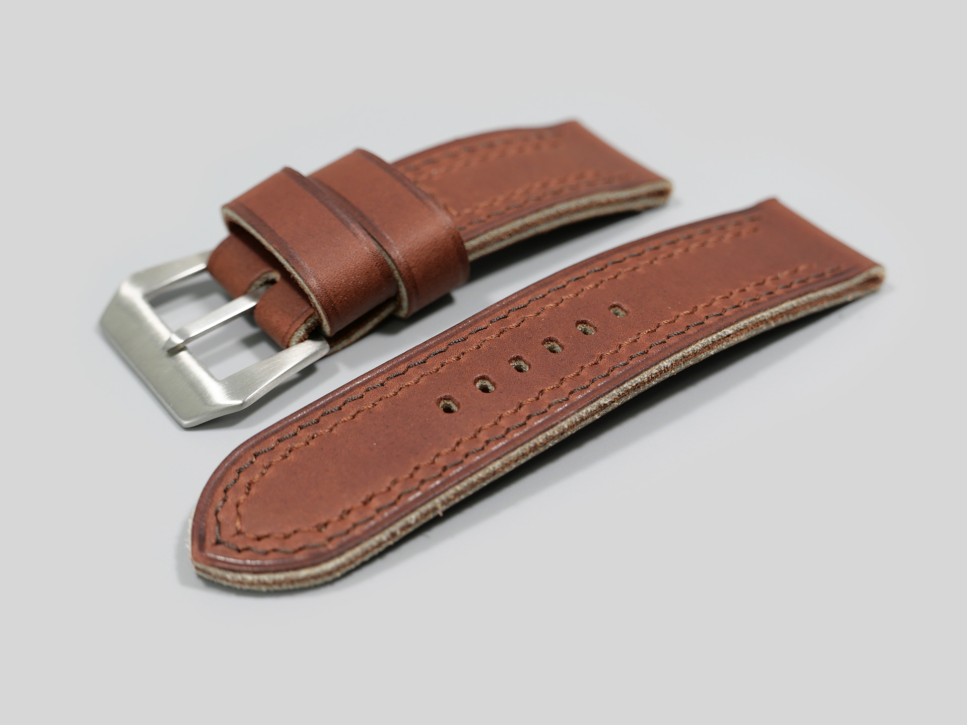 Additionally, I like the make the strap keepers nice and wide. I box stitch most 47mm Panerai straps for extra strength. On rare occasions, I may employ open ended stitching. 47mm Panerai custom straps tend to be 5.0mm thick or greater. I usually utilize vintage style stainless pin buckles that are sewn in place. These pin buckles work especially well for straps that are thicker. Vintage style Panerai pin buckles also allow for more narrow holes for the buckle. Whats more, for these 26mm wide straps I mostly employ thicker thread with a larger margin in the stitching. I adjust spacing between stitches to be slightly wider than on my 44mm or Radiomir straps.