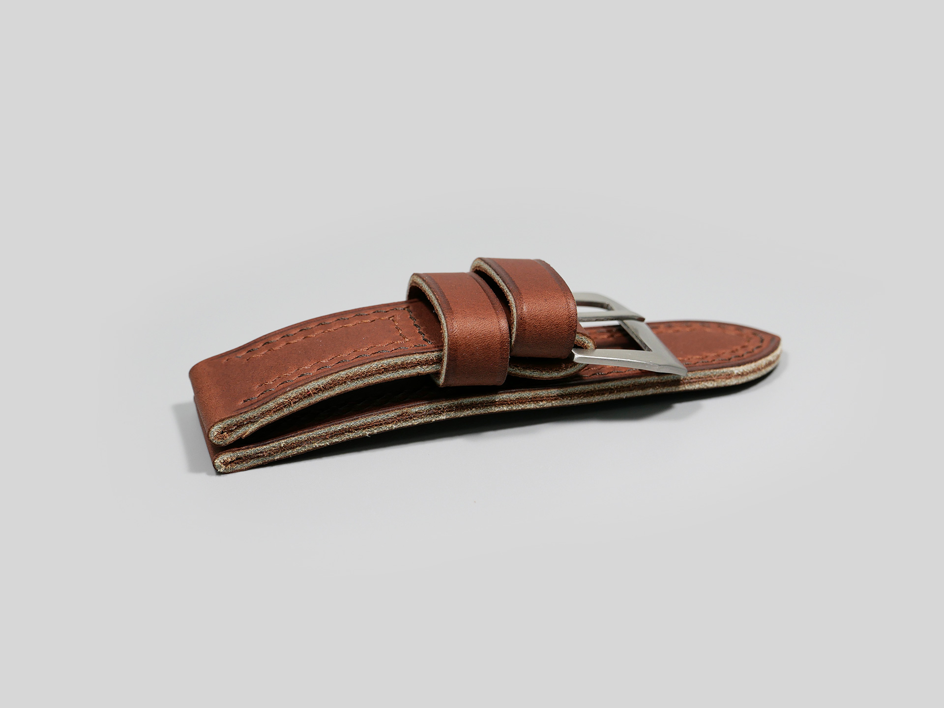 The 47mm Panerai case ships with a 26mm width strap. There is no escaping the mass of such a case and strap combination. My designs for this case take into account several features of the 47mm cases including the arches, curves, angles, and degrees of slope of not just the case, but the buckle as well. Instead of step-in away from or trying to minimize the bulk of the case, my goal is to embrace it. To reflect this, I work with thick leathers and make the straps for this model a minimum of 5.0mm thick on average.