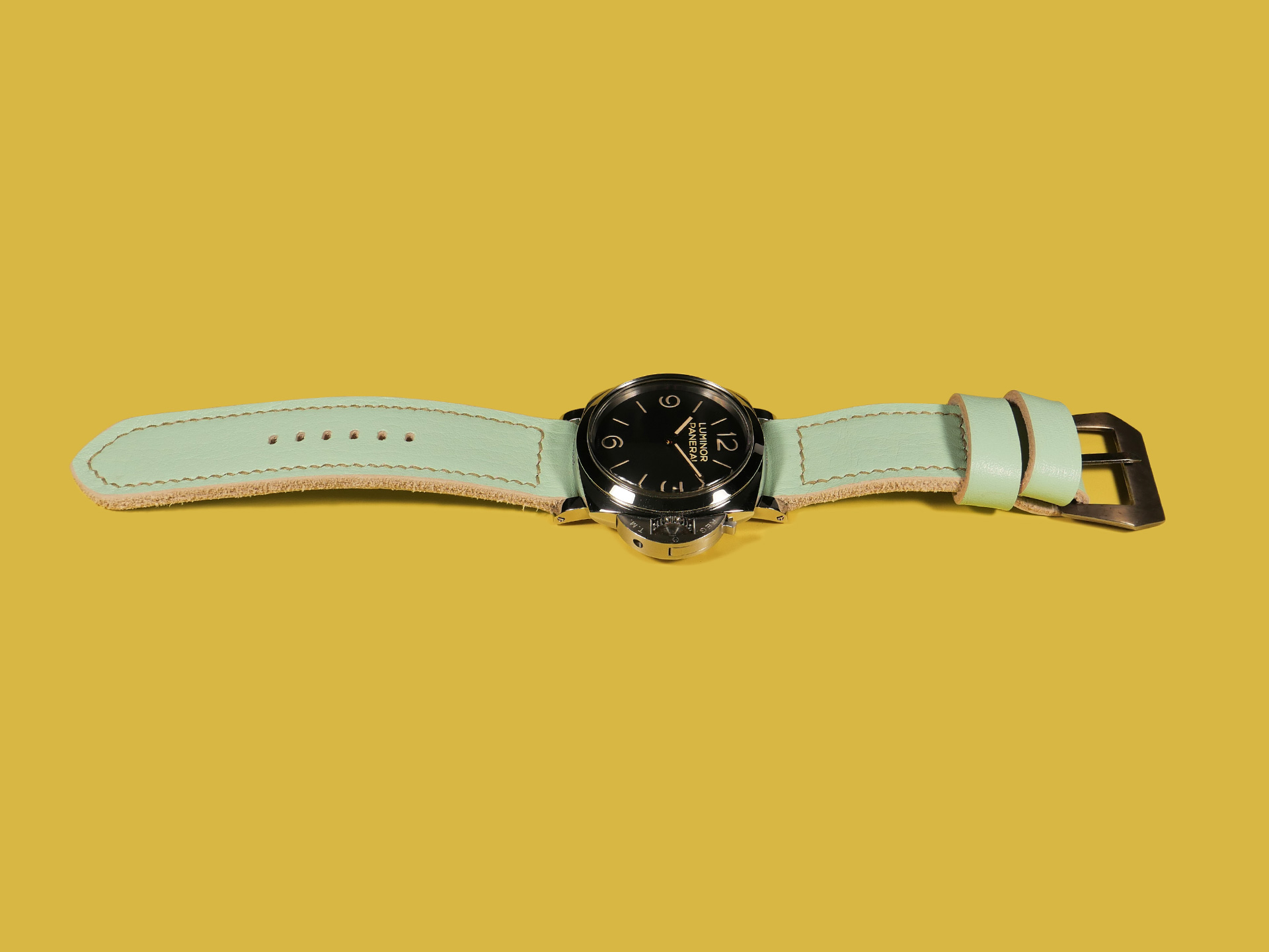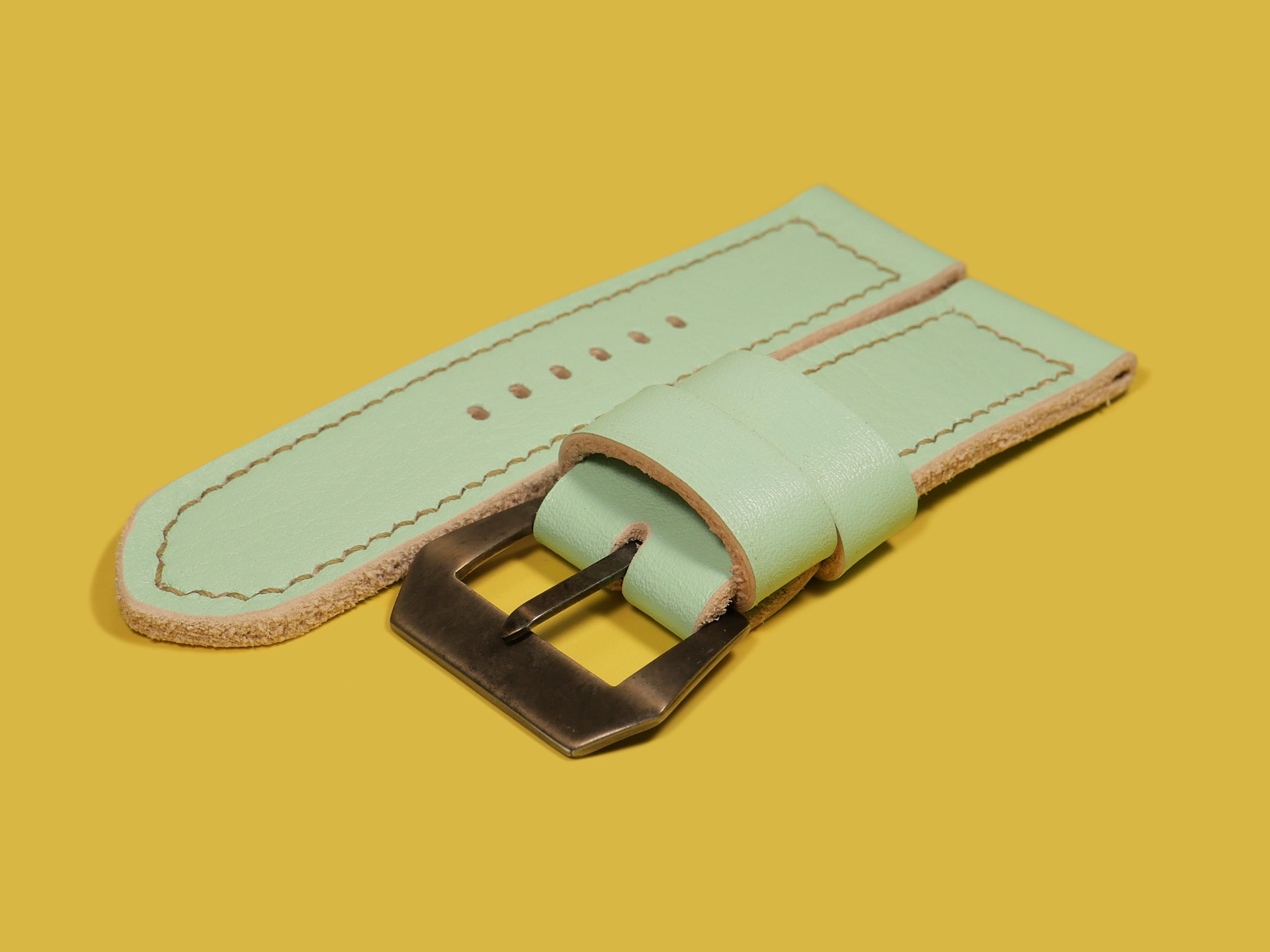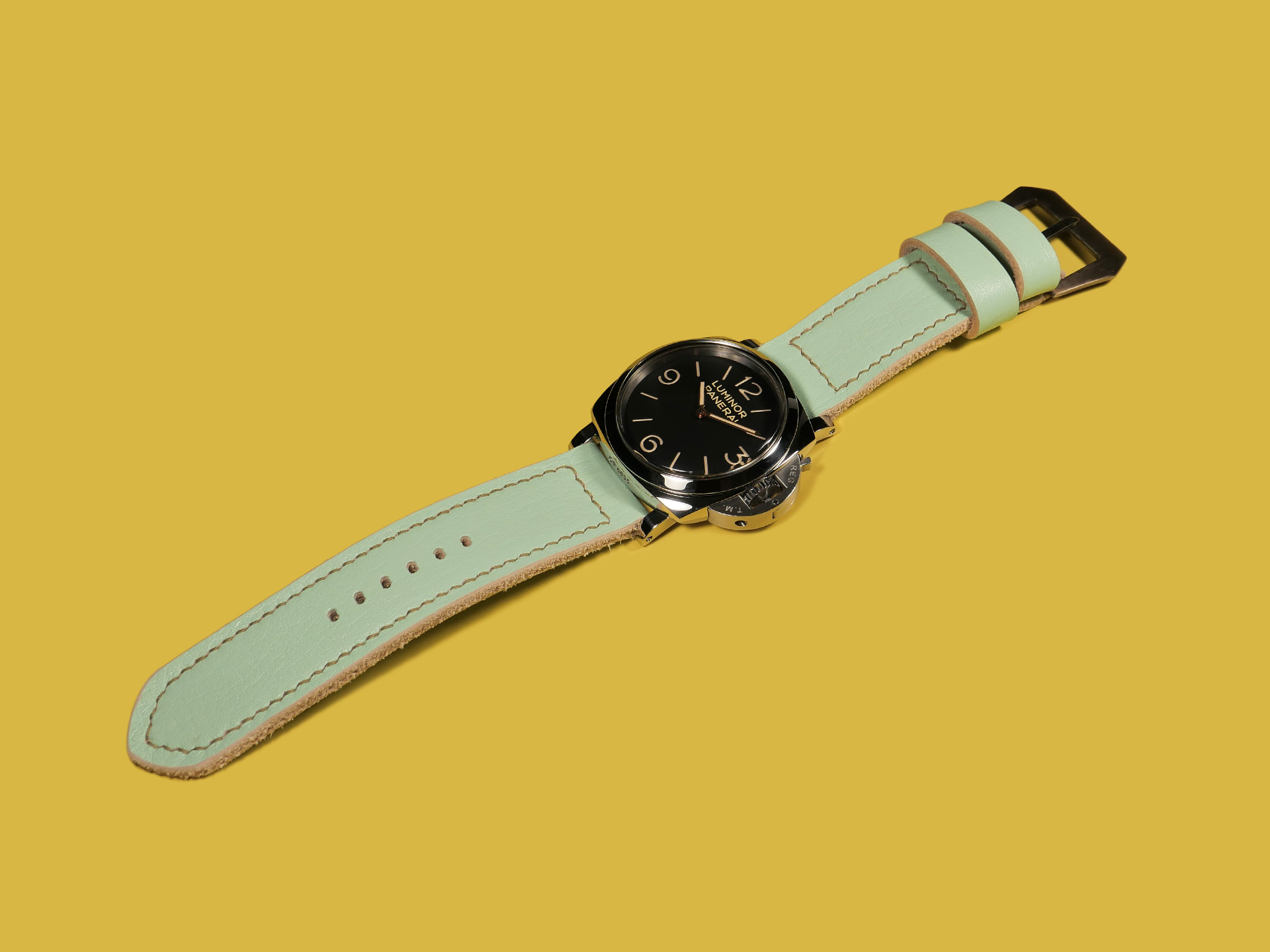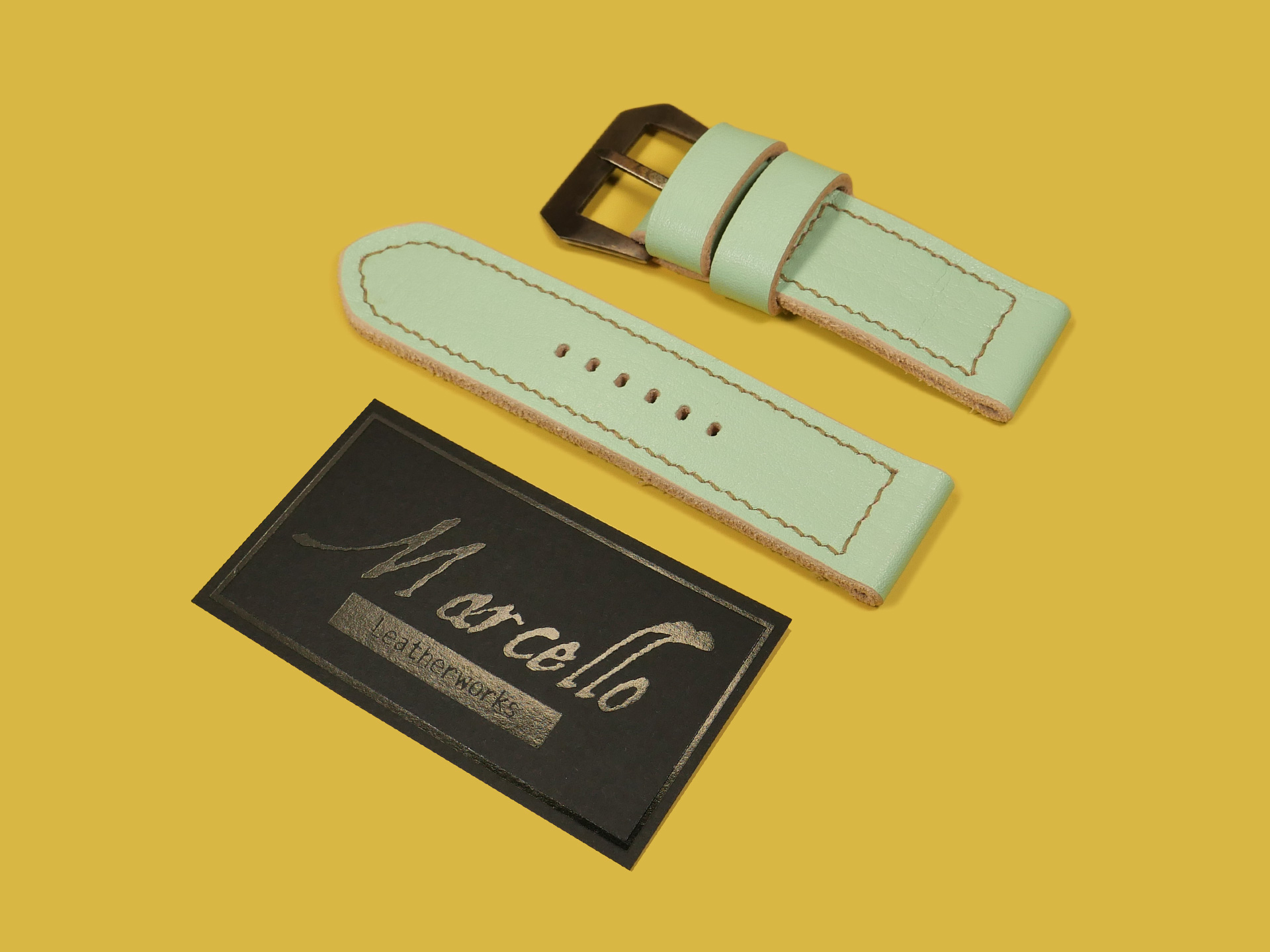 About the Leather:  I created this soft mint 47mm Panerai strap 100% by hand, and hand stitched it as with all of my straps. This is a chrome tanned leather with a very soft temper and a consistent finish. The exterior has been hand coated with pliable blue latex sealant. The latex coating is quite durable and will show minor signs of wear in key areas over time, lending the strap even more character. The inner side of the leather is cream tan in color.