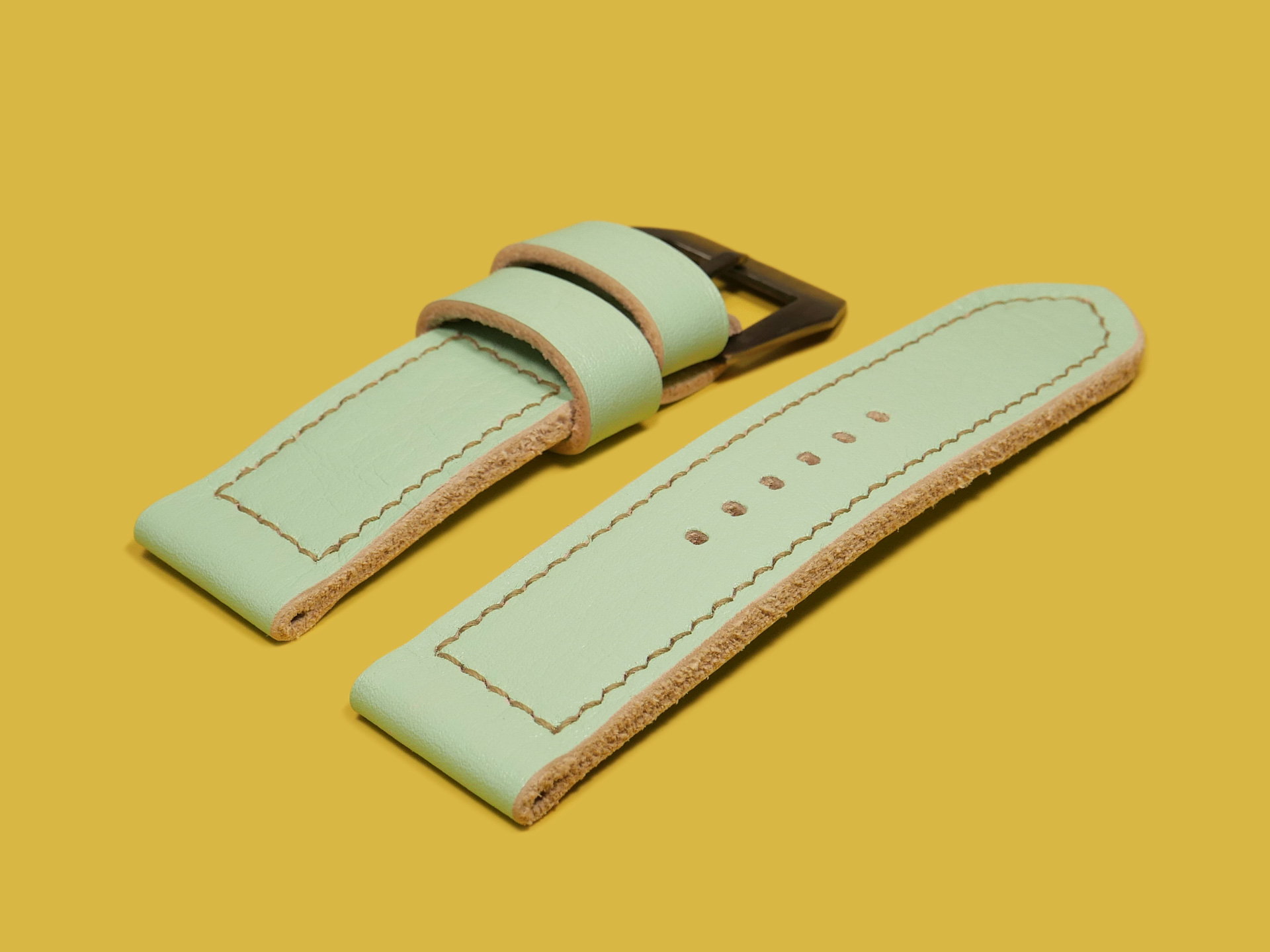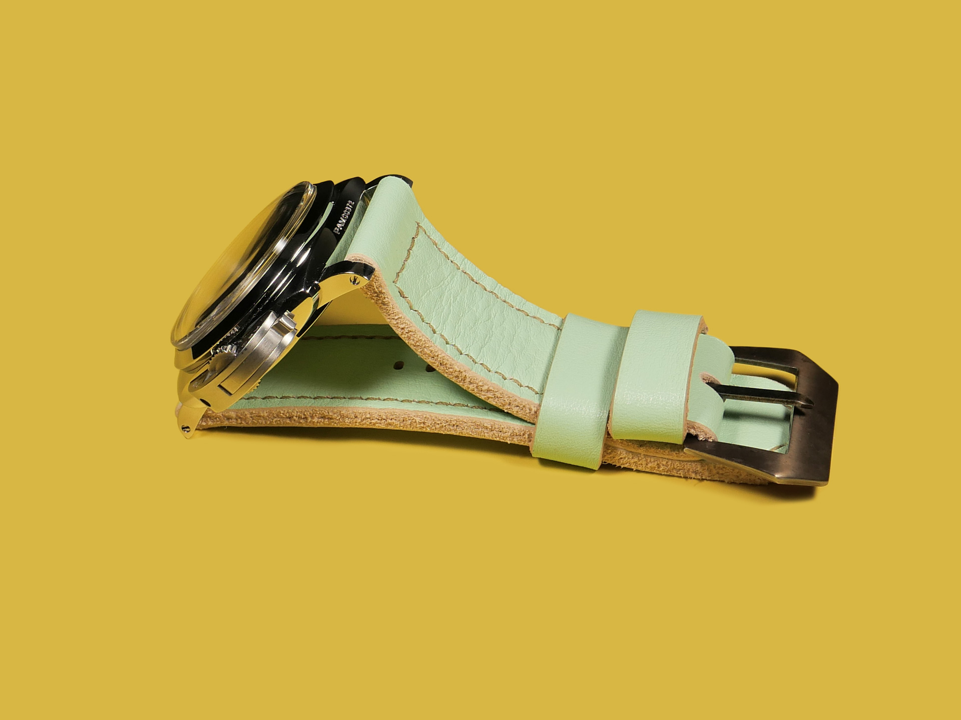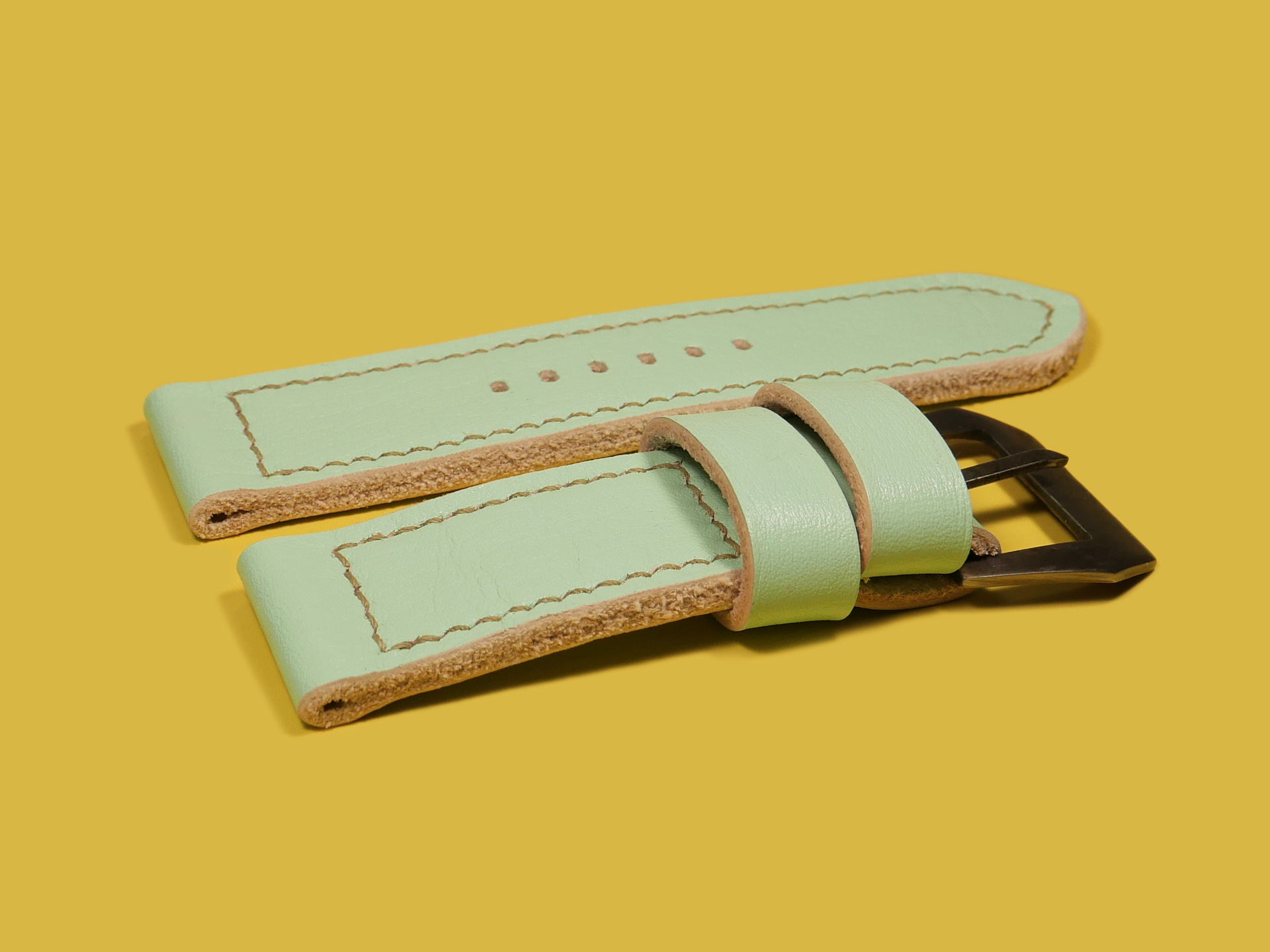 About the Leather:  I created this soft mint 47mm Panerai strap 100% by hand, and hand stitched it as with all of my straps. This is a chrome tanned leather with a very soft temper and a consistent finish. The exterior has been hand coated with pliable blue latex sealant. The latex coating is quite durable and will show minor signs of wear in key areas over time, lending the strap even more character. The inner side of the leather is cream tan in color.