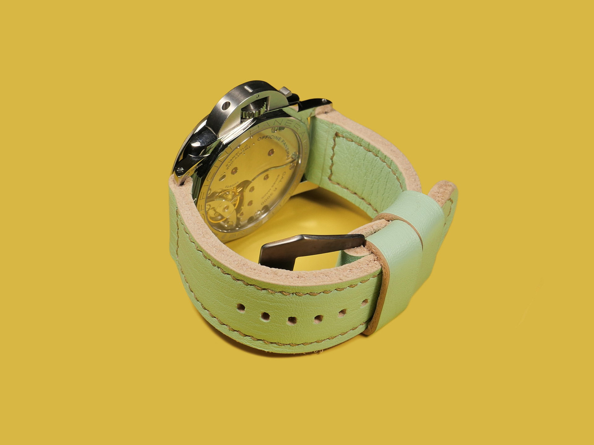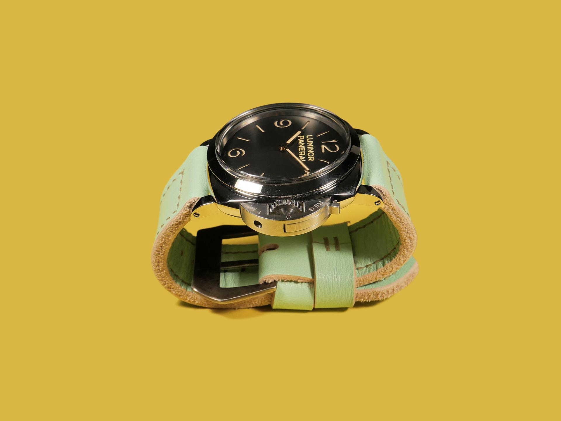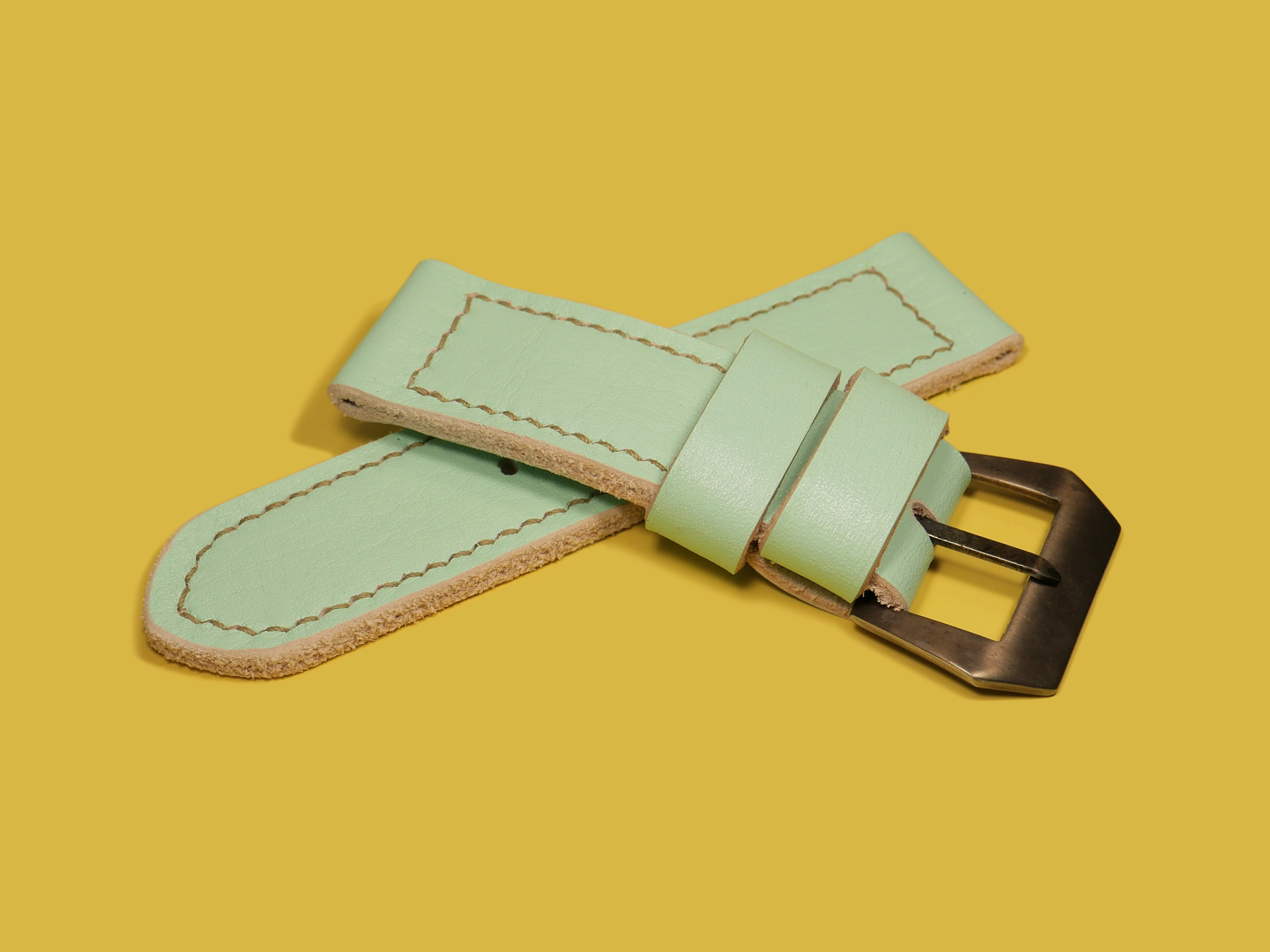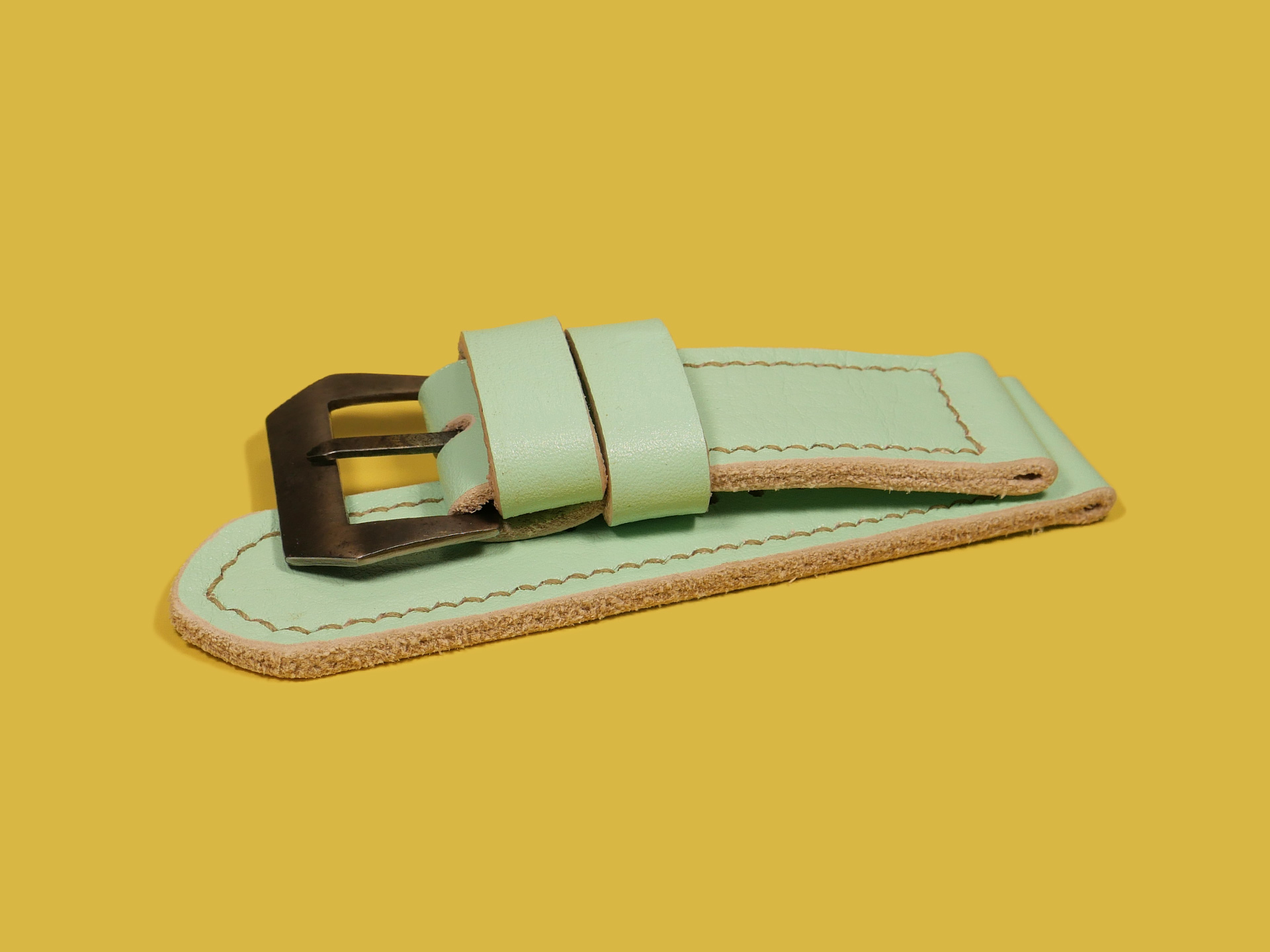 About the Leather:  I created this soft mint 47mm Panerai strap 100% by hand, and hand stitched it as with all of my straps. This is a chrome tanned leather with a very soft temper and a consistent finish. The exterior has been hand coated with pliable blue latex sealant. The latex coating is quite durable and will show minor signs of wear in key areas over time, lending the strap even more character. The inner side of the leather is cream tan in color.