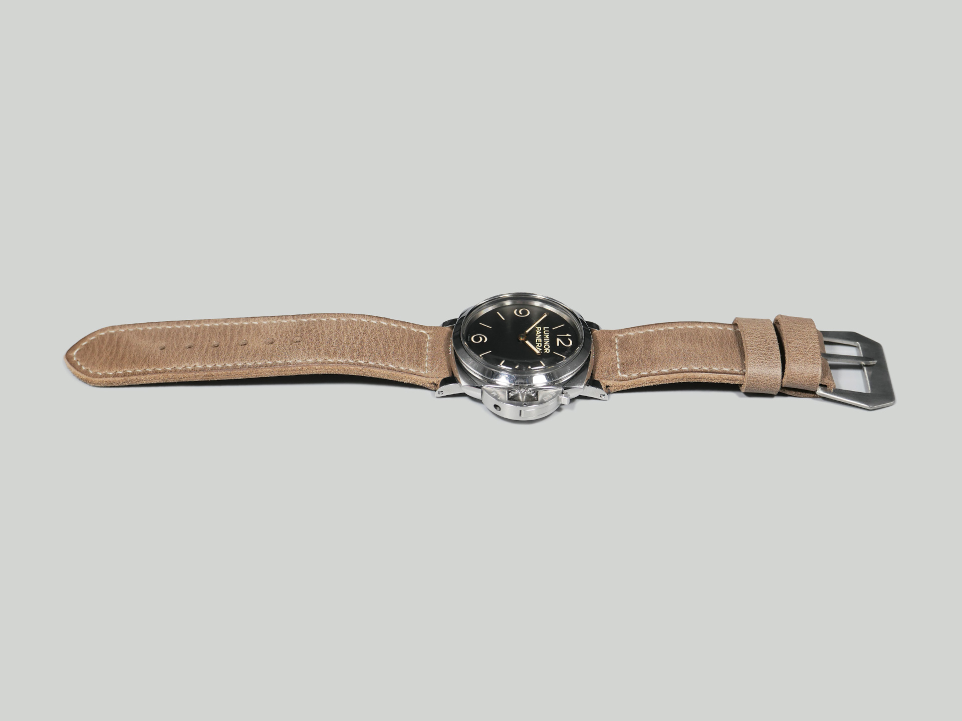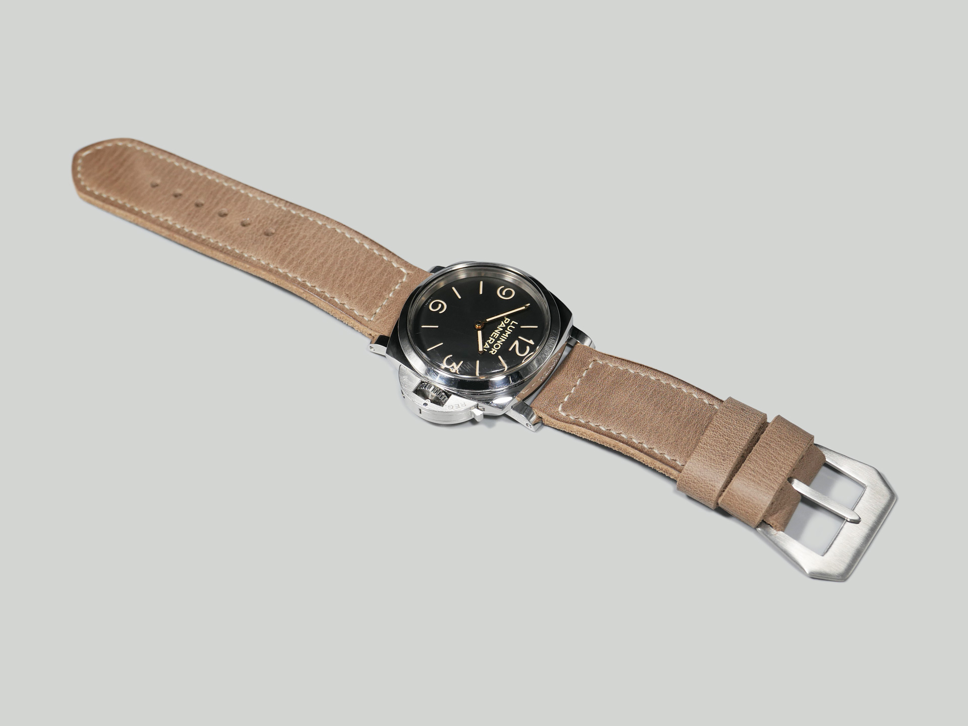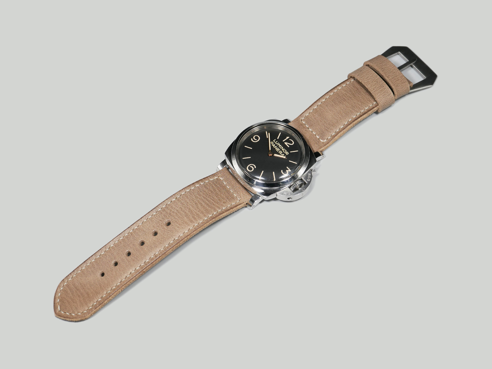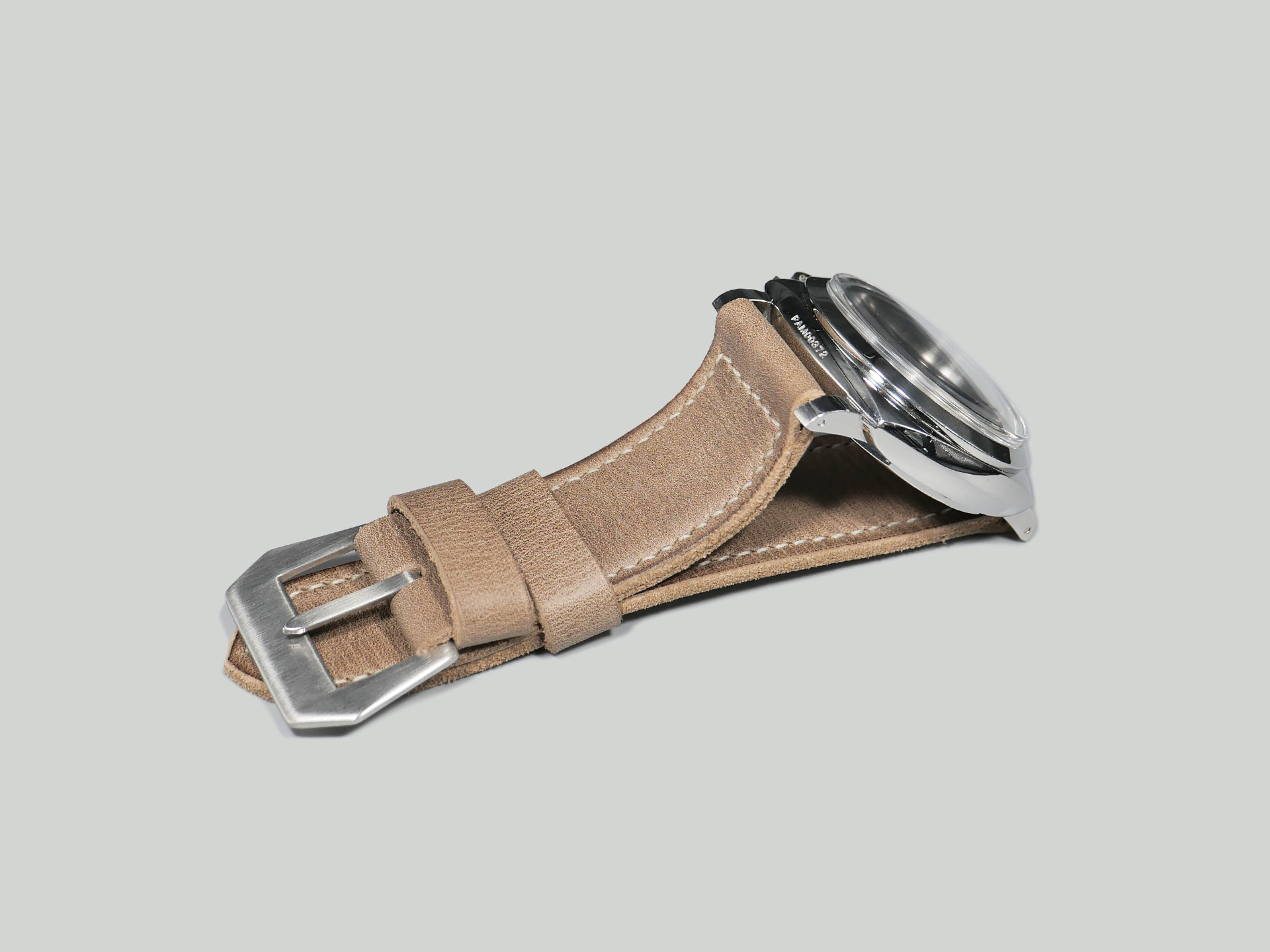 This strap comes with a brushed stainless steel vintage-style flat steel pin buckle sewn in place (pictured). Additional buckle options are available from the drop down menu. The strap shown in the photos measures 130/80, but additional sizes are available in the drop-down menu. In addition, each strap is meticulously punched by hand to create the pin buckle holes. Finally, the images display this handcrafted grey Panerai strap with the Panerai Luminor PAM00372. The strap in the sample photos measures 130/80 for your reference.