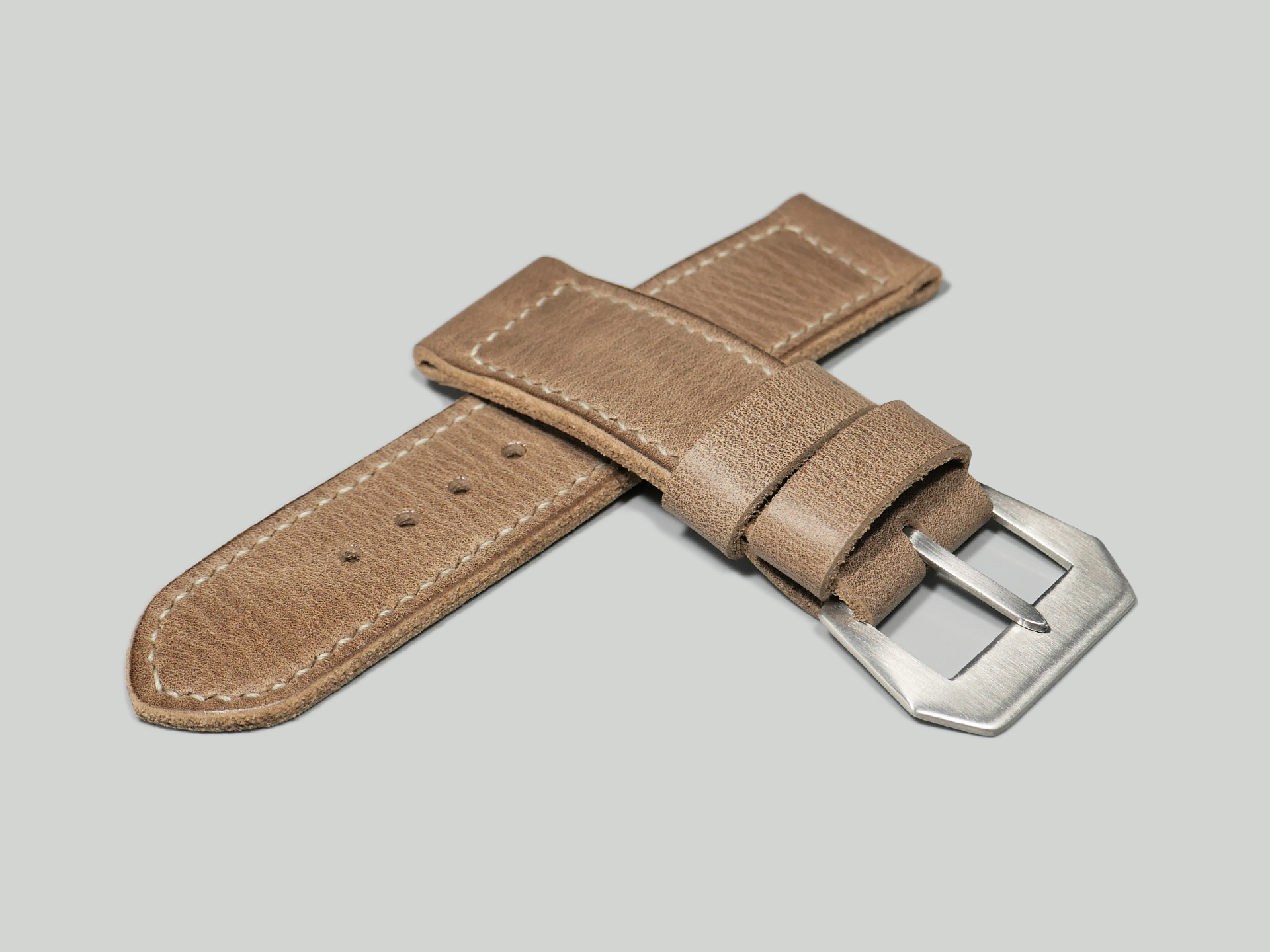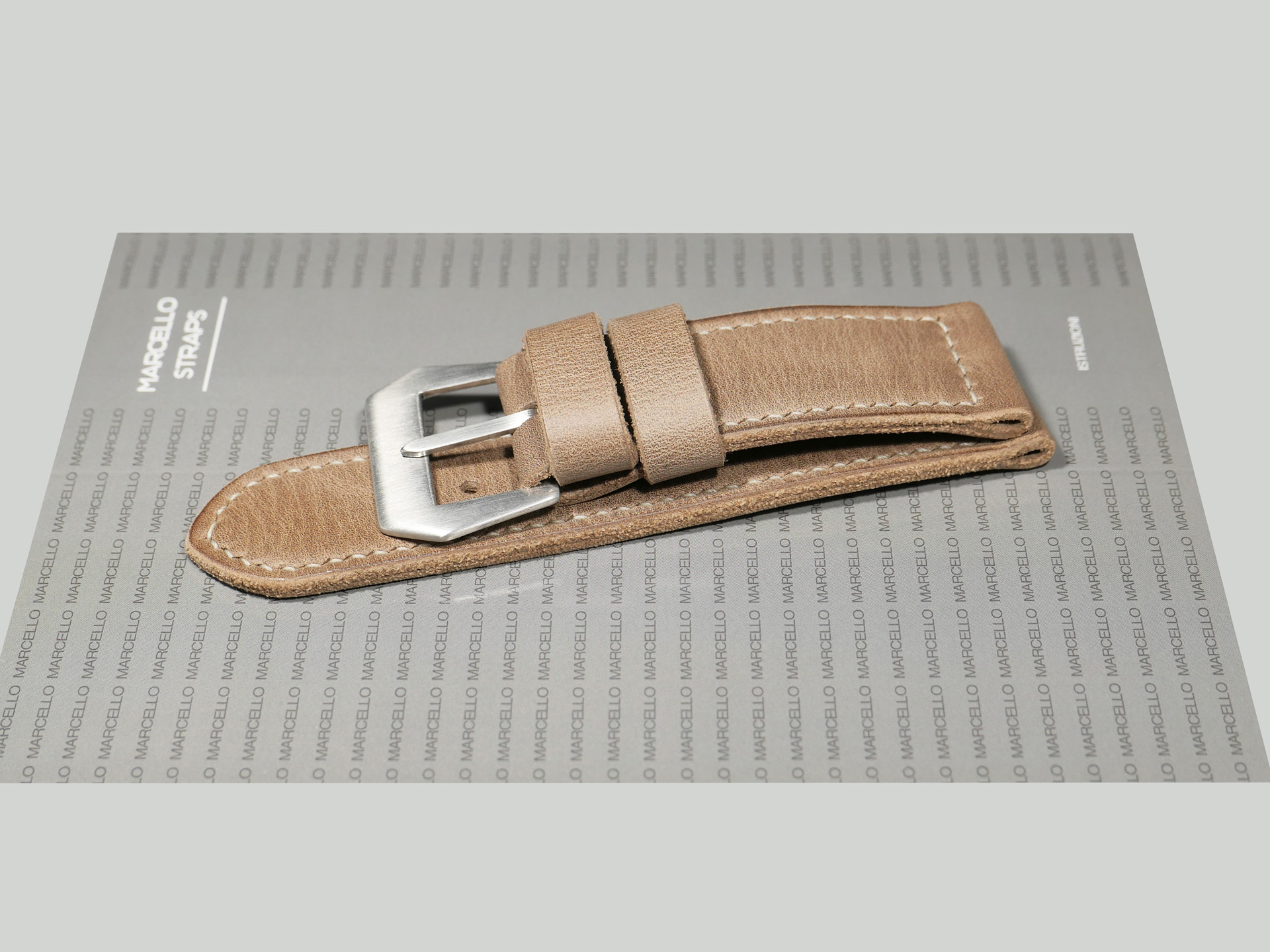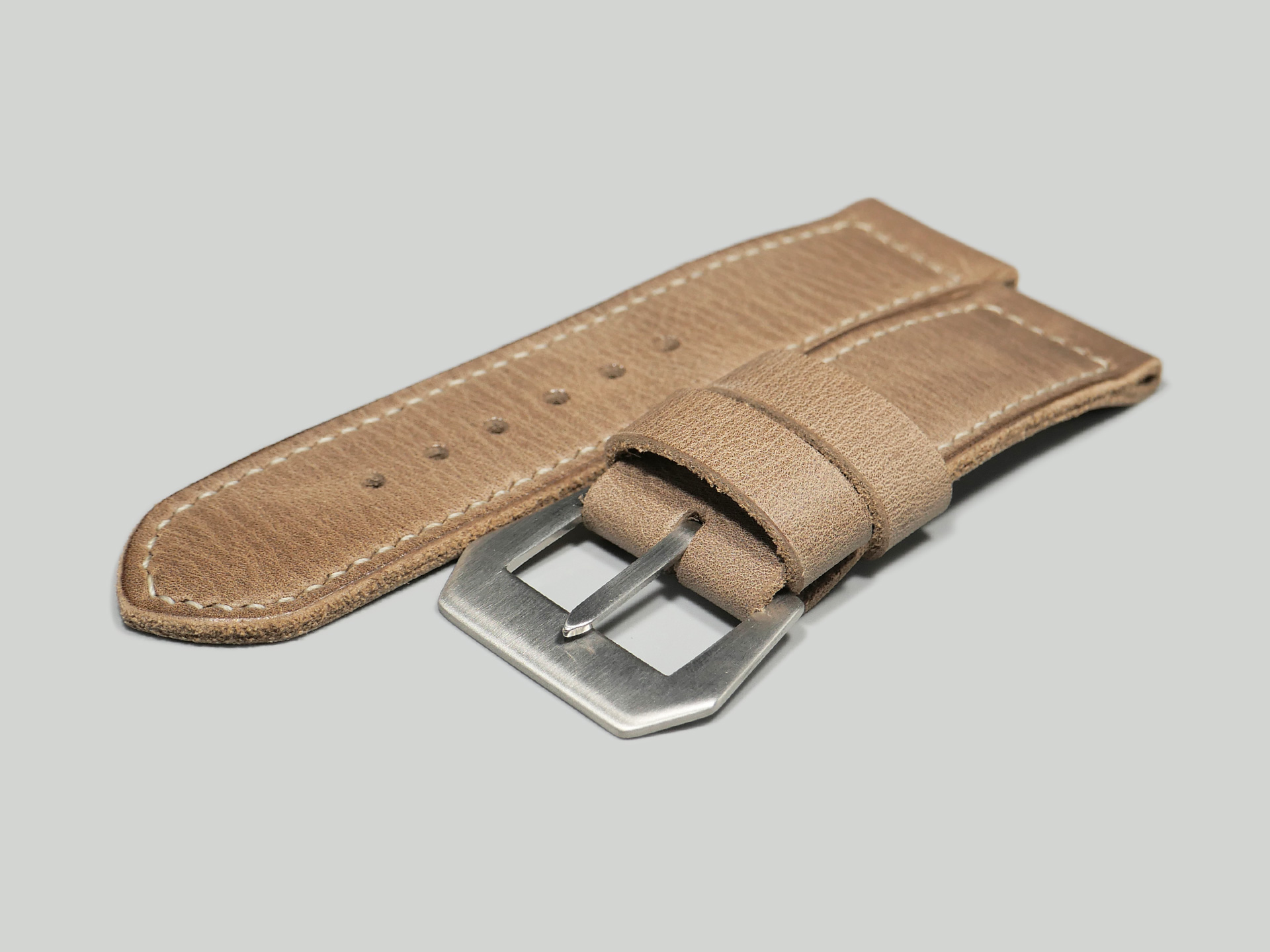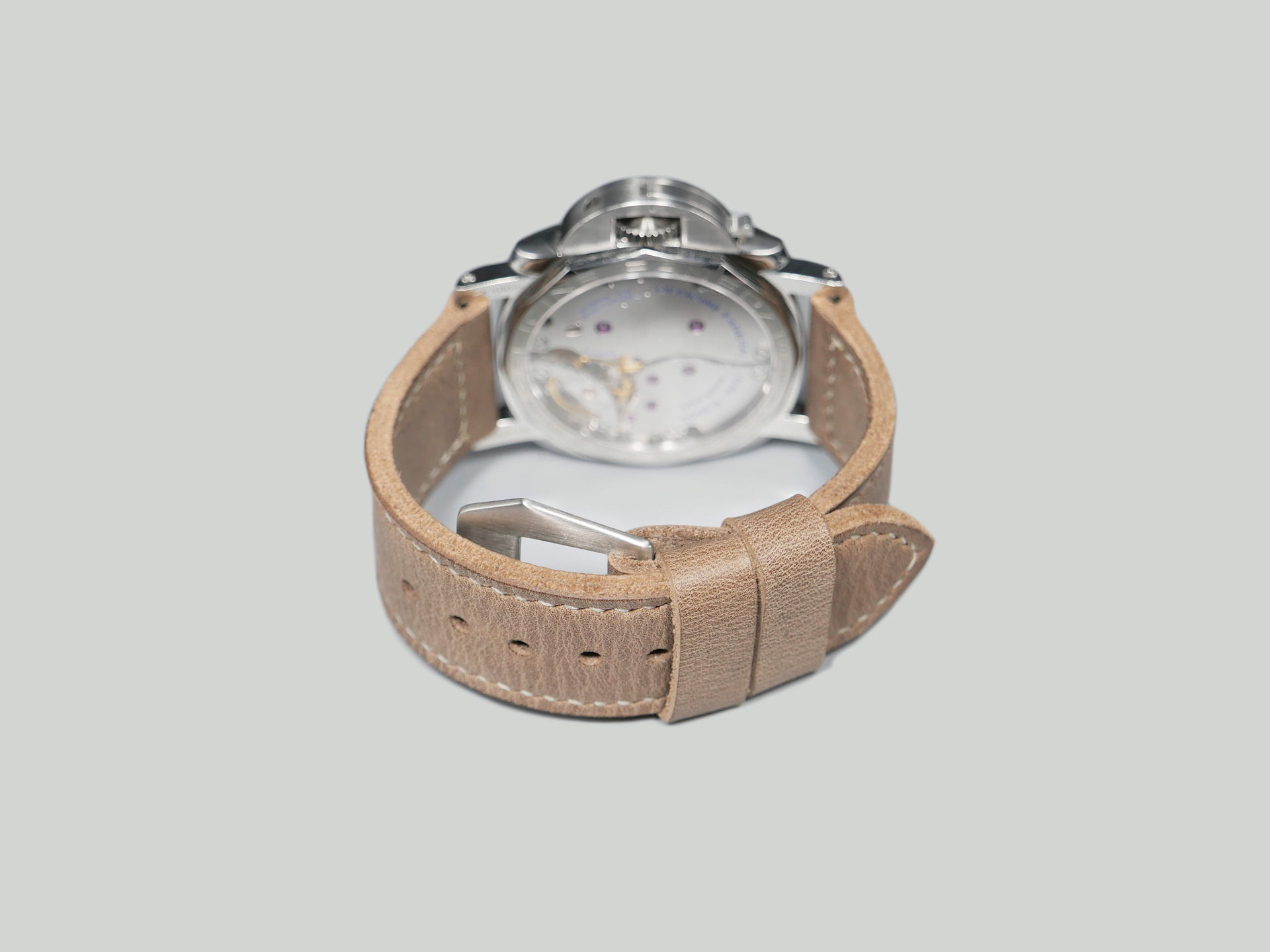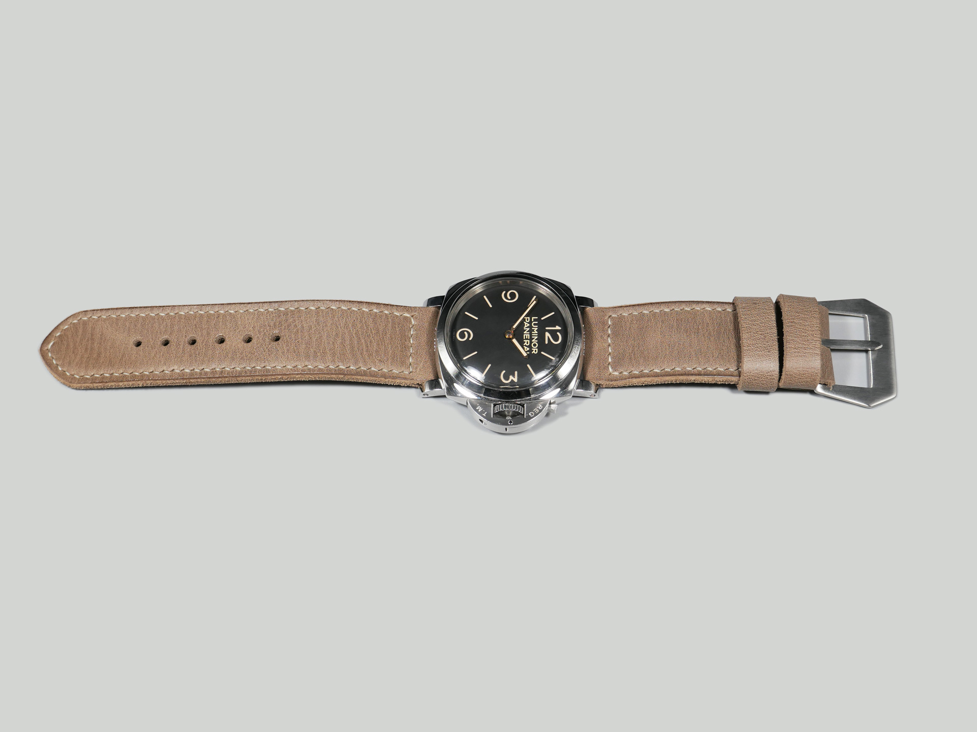 This strap comes with a brushed stainless steel vintage-style flat steel pin buckle sewn in place (pictured). Additional buckle options are available from the drop down menu. The strap shown in the photos measures 130/80, but additional sizes are available in the drop-down menu. In addition, each strap is meticulously punched by hand to create the pin buckle holes. Finally, the images display this handcrafted grey Panerai strap with the Panerai Luminor PAM00372. The strap in the sample photos measures 130/80 for your reference.