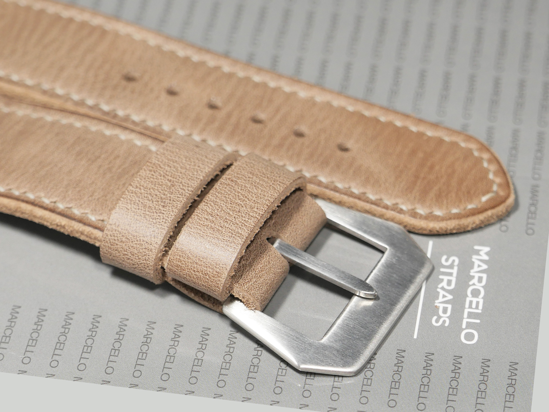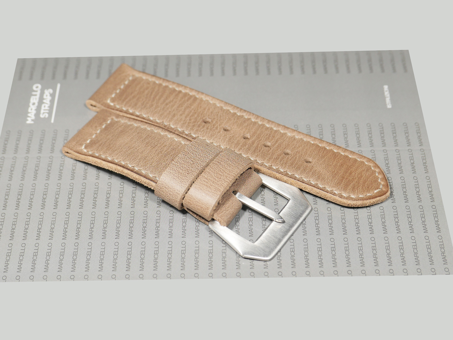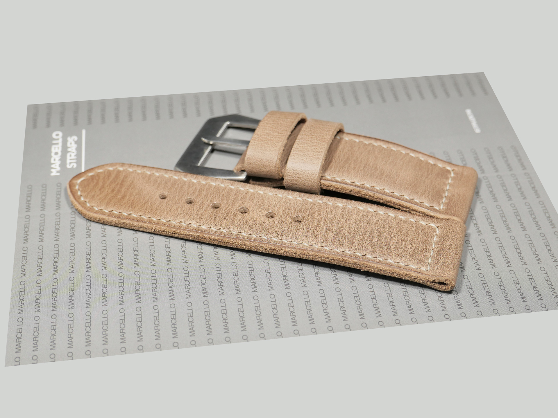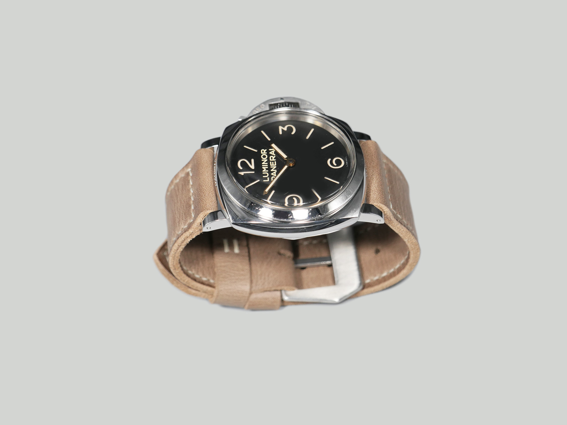 This strap comes with a brushed stainless steel vintage-style flat steel pin buckle sewn in place (pictured). Additional buckle options are available from the drop down menu. The strap shown in the photos measures 130/80, but additional sizes are available in the drop-down menu. In addition, each strap is meticulously punched by hand to create the pin buckle holes. Finally, the images display this handcrafted grey Panerai strap with the Panerai Luminor PAM00372. The strap in the sample photos measures 130/80 for your reference.