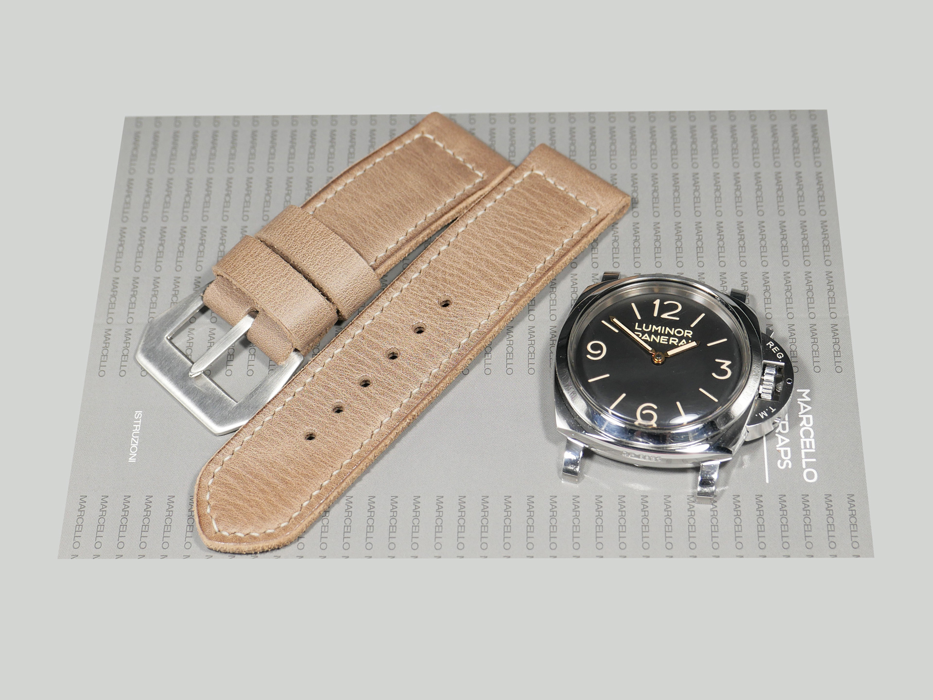 Additional Information: For each Panerai model, I have a different design philosophy regarding straps. For the 47mm Luminor series case, as well as the Radiomir 1940 and the Submersible, my concept revolves around thickness and symmetry. When I create unique straps for the 47mm series cases, I take into account the overall thickness and temper of the leather that I am working with; more so than with Radiomir or even 44mm Luminor cases.