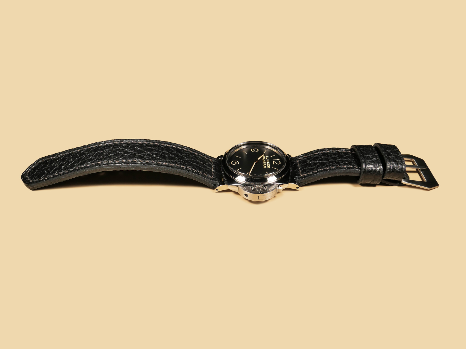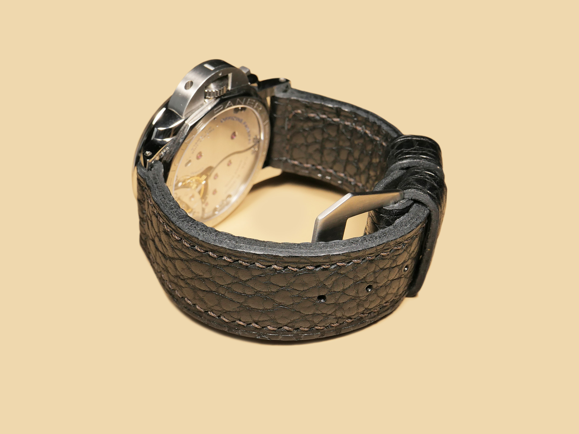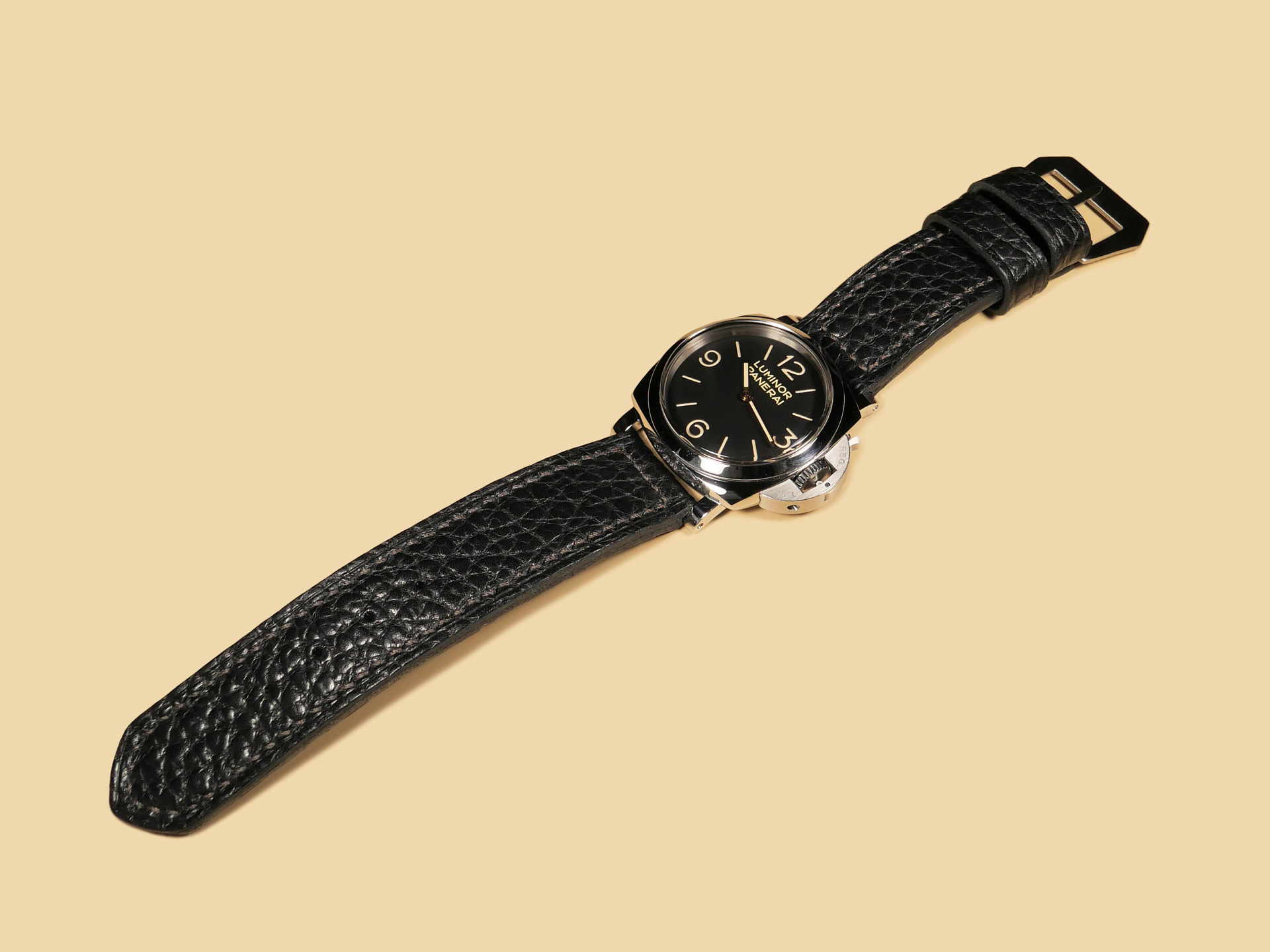 Pictured above, you may see this soft black Panerai strap on the Panerai PAM00372 Luminor 47mm. Finally, With black leather, the sky is the limit in terms of dial/case combinations. The strap in the photos above measures an extra long 140/80. *Buckles may also be customized with engravings on a consultation basis at no extra charge.
