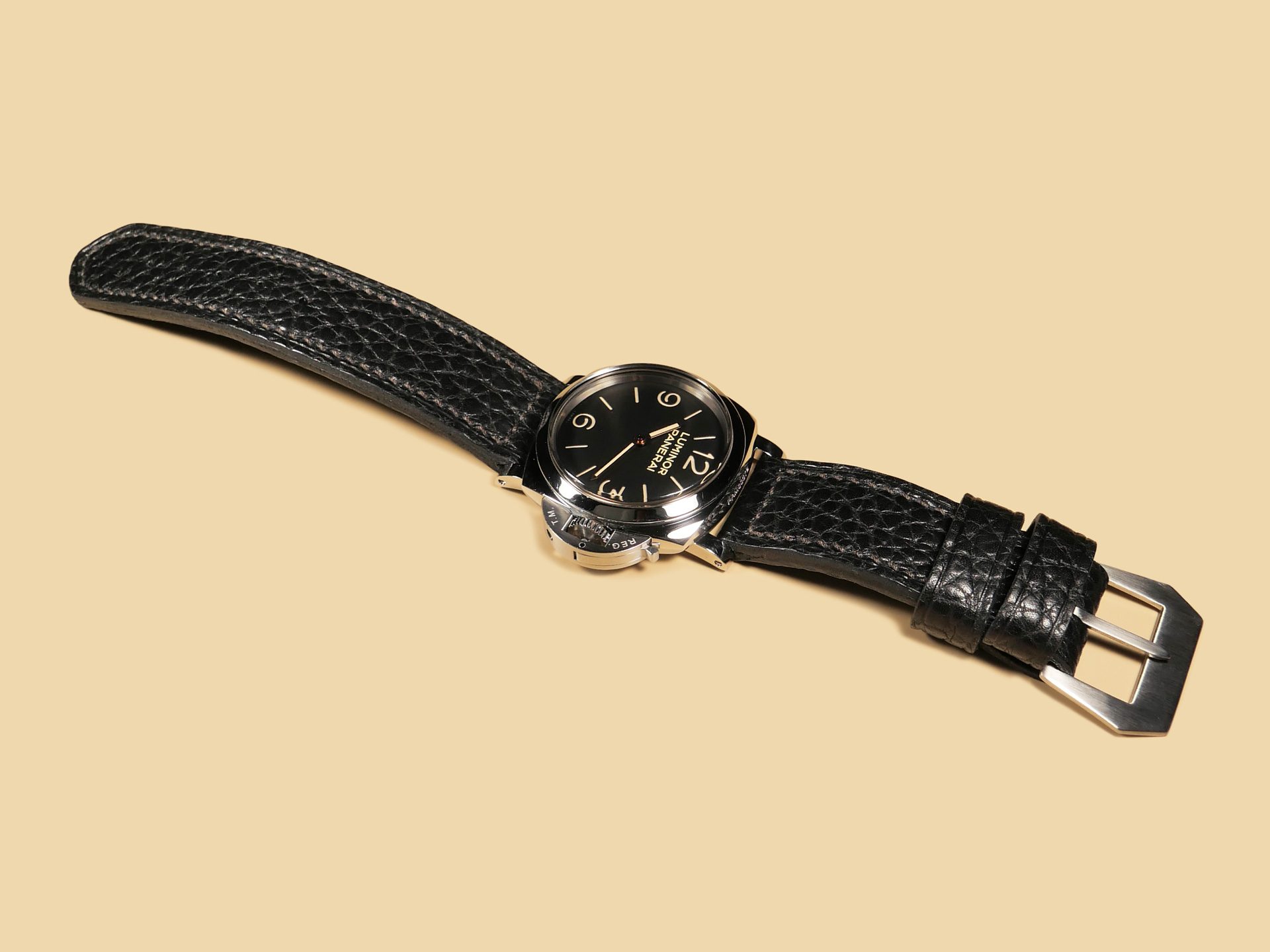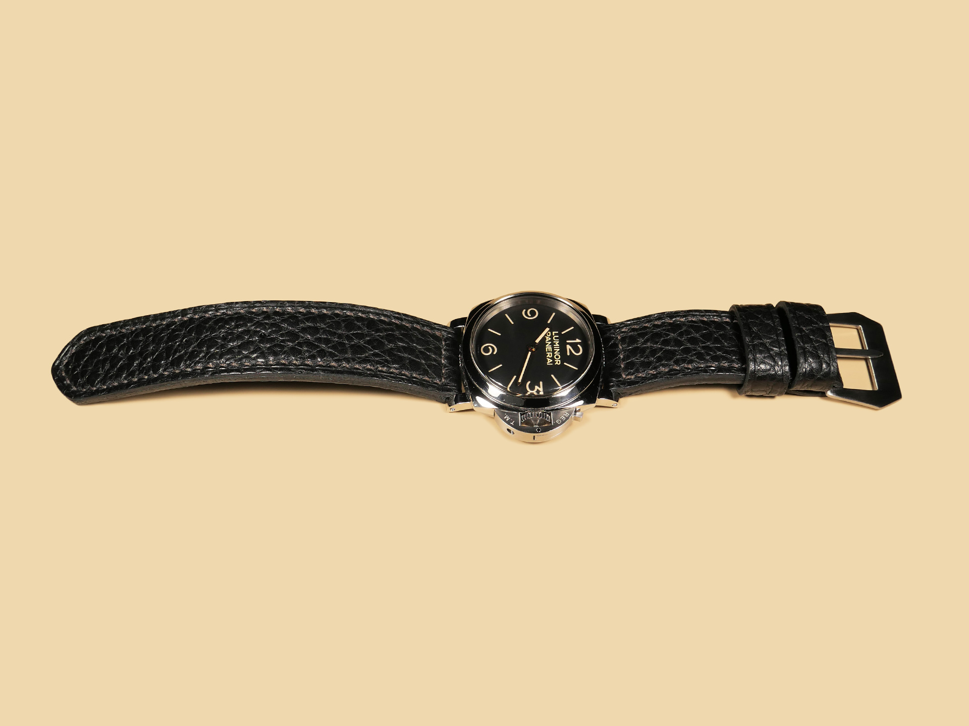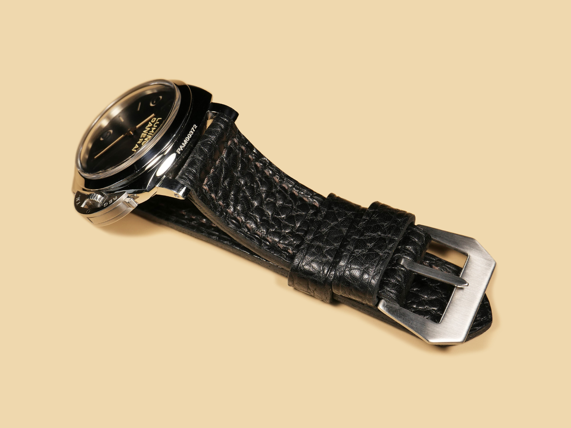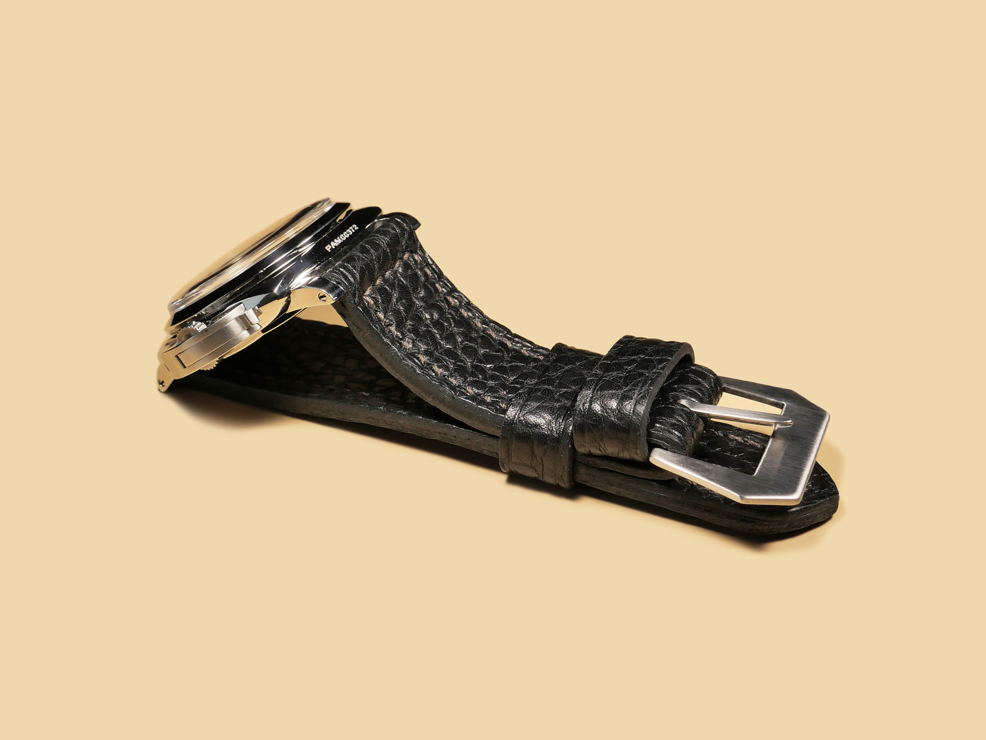 Pictured above, you may see this soft black Panerai strap on the Panerai PAM00372 Luminor 47mm. Finally, With black leather, the sky is the limit in terms of dial/case combinations. The strap in the photos above measures an extra long 140/80. *Buckles may also be customized with engravings on a consultation basis at no extra charge.