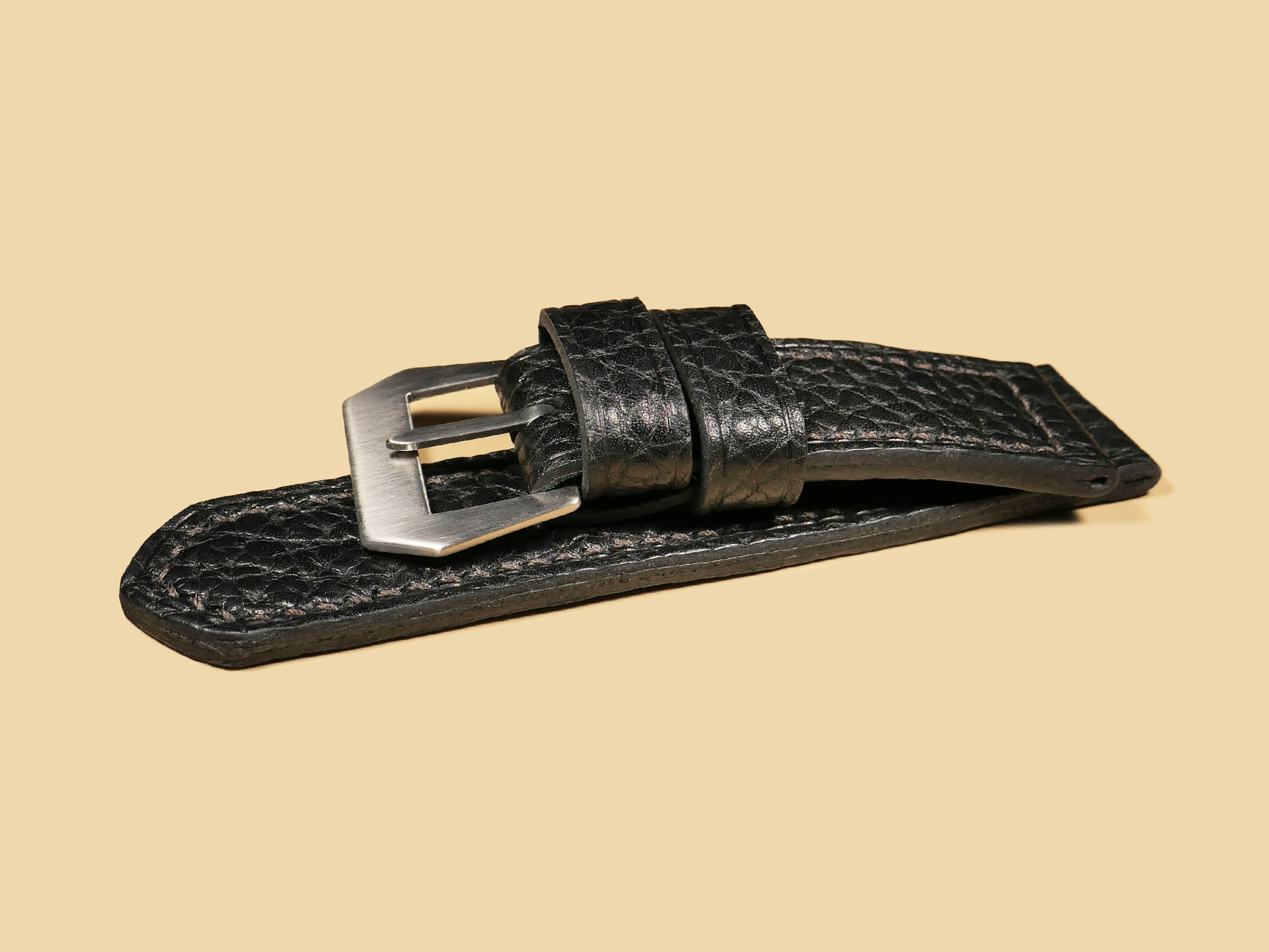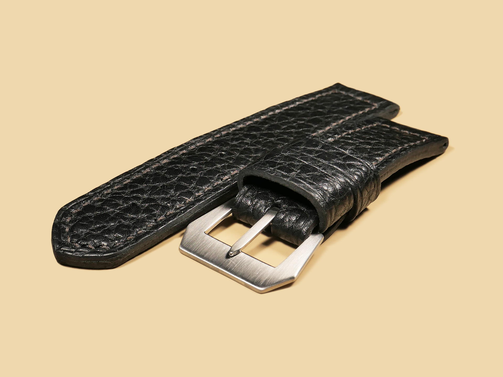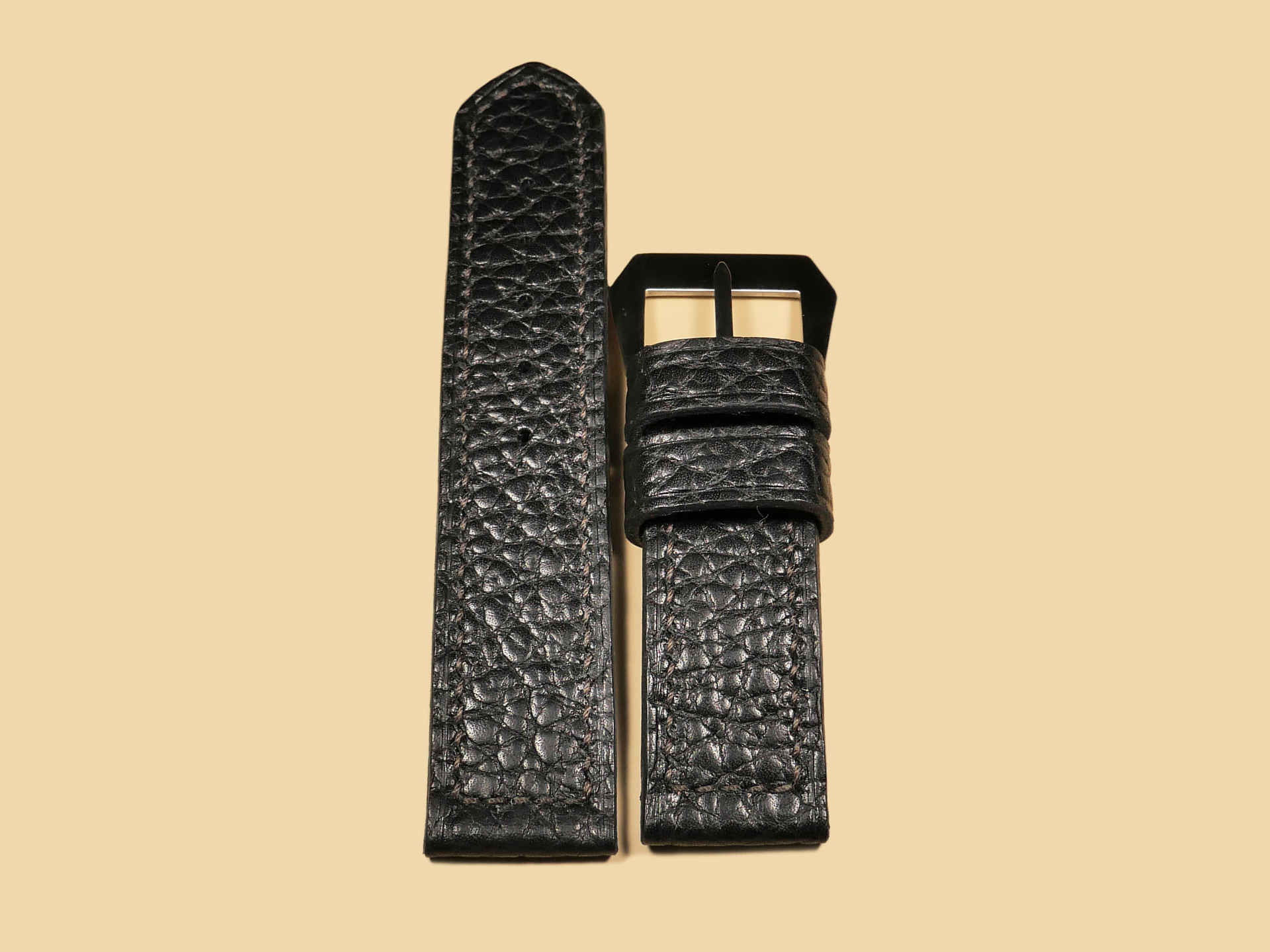 About the Leather: Another epic release for 47mm Panerai cases. I created this soft black Panerai strap 100% by hand as with all of the straps you see listed on my site. For this project, I selected a chrome tanned leather with a pebbled texture. This is a thick and soft leather that you can wear comfortable all day long. The unique texture gives this leather an appearance similar to shark leather. For stitching, I selected a medium brown thread and did the stitching in a boxed pattern. The edges feature a slight crease and burnishing. This strap features one floating keeper and one fixed.