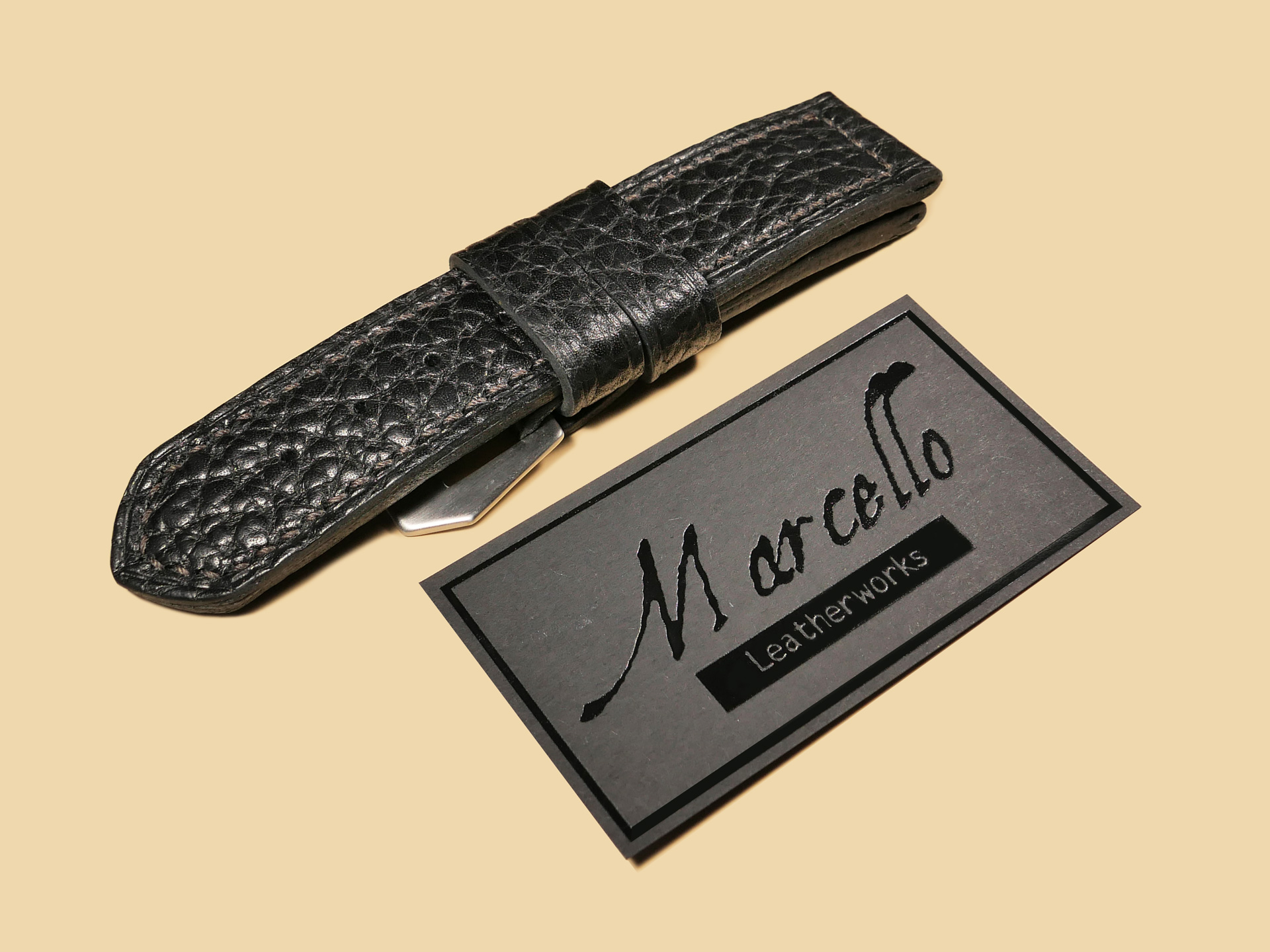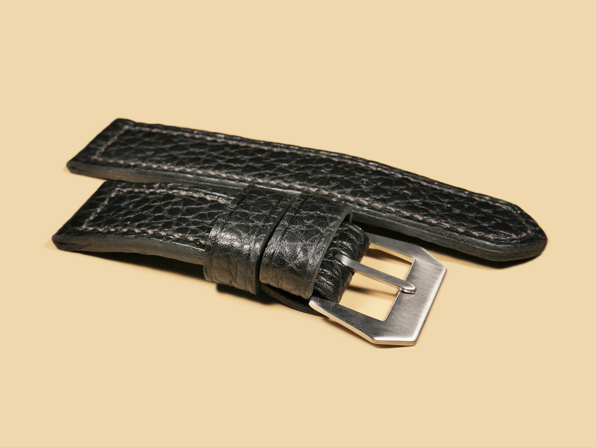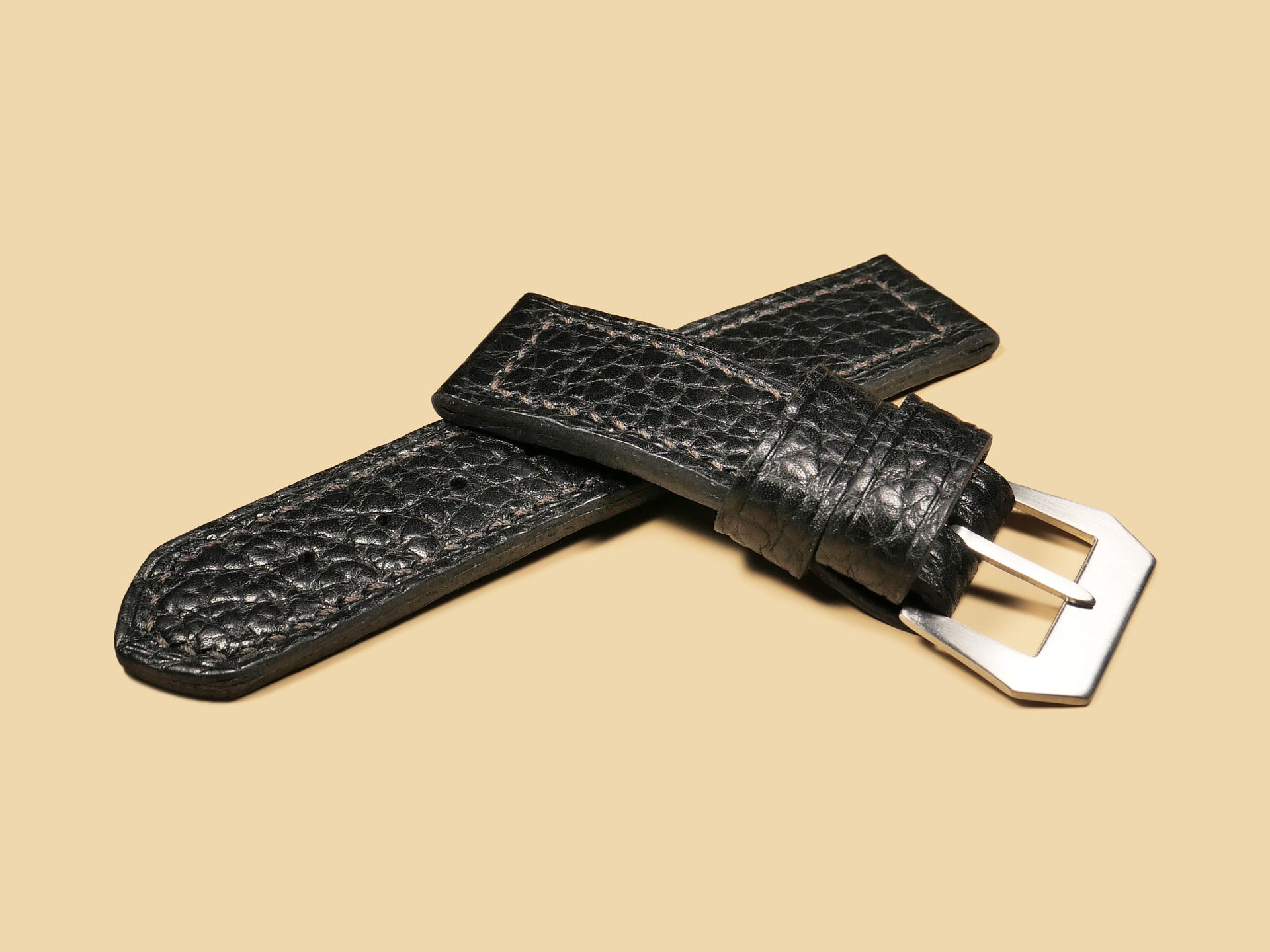 About the Leather: Another epic release for 47mm Panerai cases. I created this soft black Panerai strap 100% by hand as with all of the straps you see listed on my site. For this project, I selected a chrome tanned leather with a pebbled texture. This is a thick and soft leather that you can wear comfortable all day long. The unique texture gives this leather an appearance similar to shark leather. For stitching, I selected a medium brown thread and did the stitching in a boxed pattern. The edges feature a slight crease and burnishing. This strap features one floating keeper and one fixed.