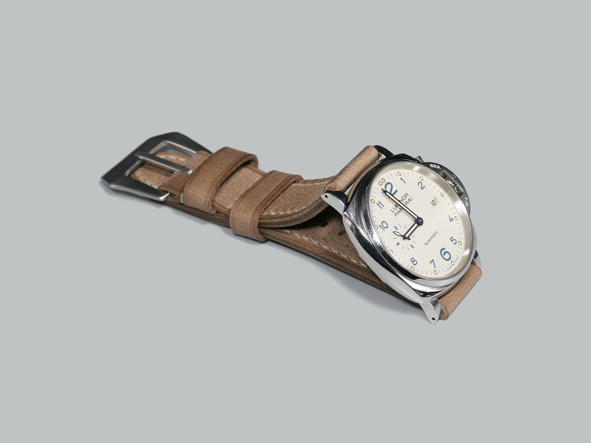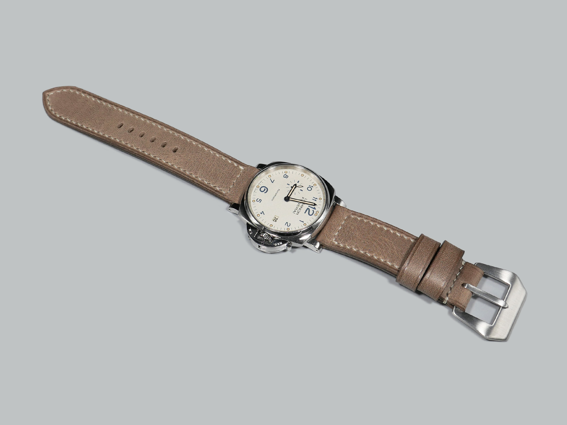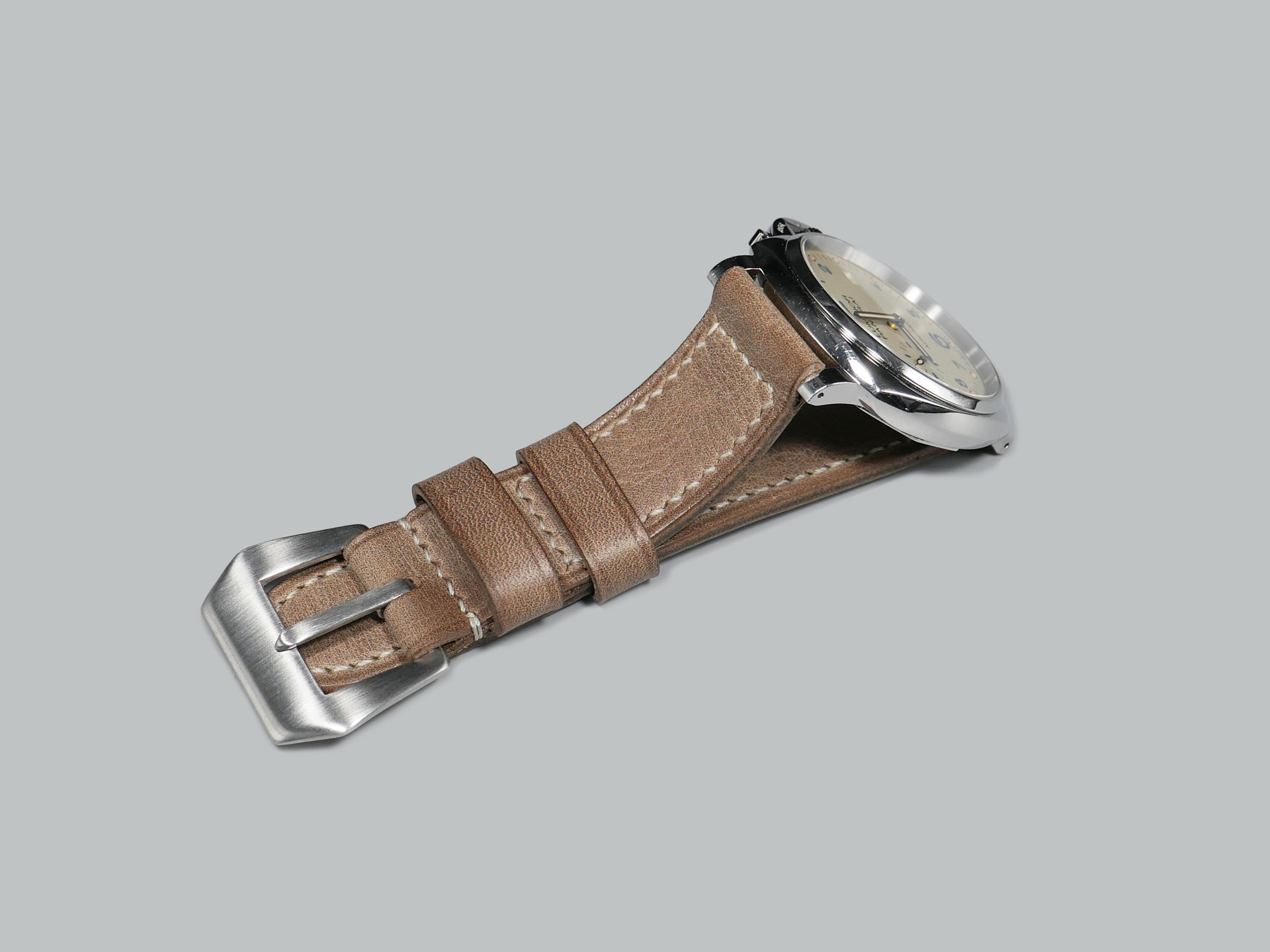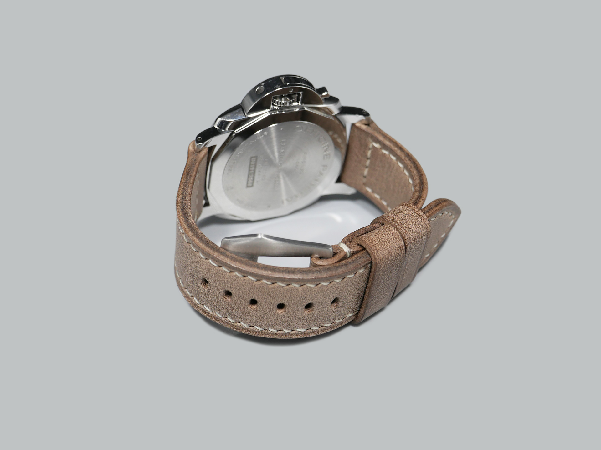 This strap comes with a stainless steel vintage-style brushed pin buckle sewn in place (pictured). Additional buckle options are available from the drop down menu. The strap shown in the photos measures 125/75, but additional sizes are available in the drop-down menu. In addition, each strap is meticulously punched by hand to create the pin buckle holes. Finally, the images display this handcrafted grey Panerai strap with the Panerai Luminor PAM00906.