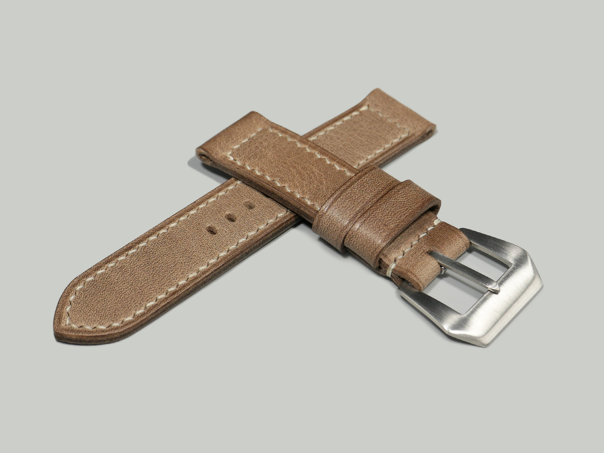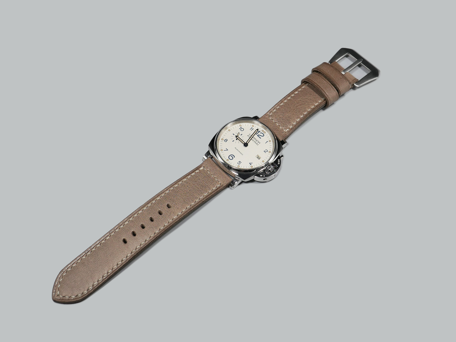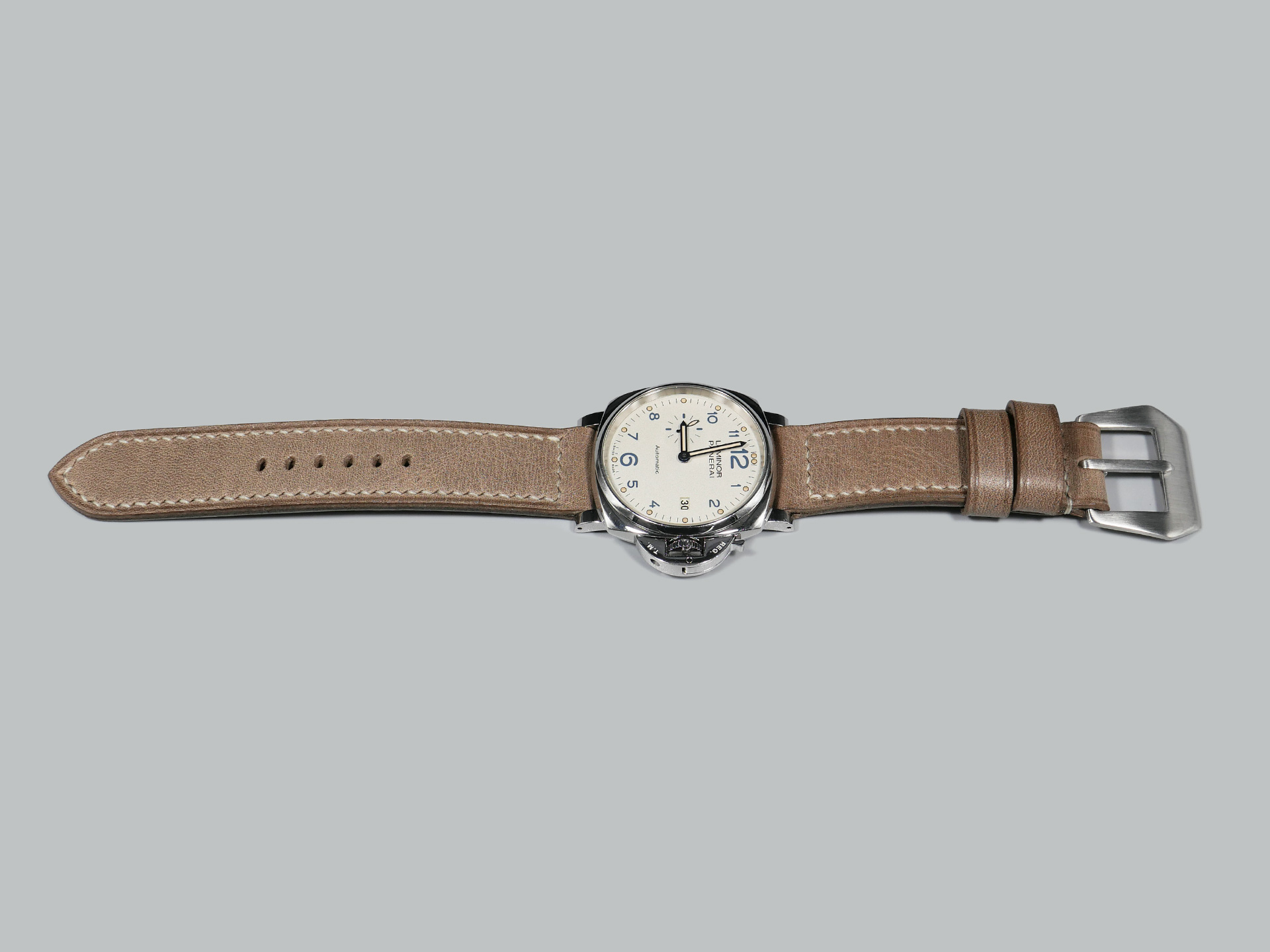 This strap comes with a stainless steel vintage-style brushed pin buckle sewn in place (pictured). Additional buckle options are available from the drop down menu. The strap shown in the photos measures 125/75, but additional sizes are available in the drop-down menu. In addition, each strap is meticulously punched by hand to create the pin buckle holes. Finally, the images display this handcrafted grey Panerai strap with the Panerai Luminor PAM00906.
