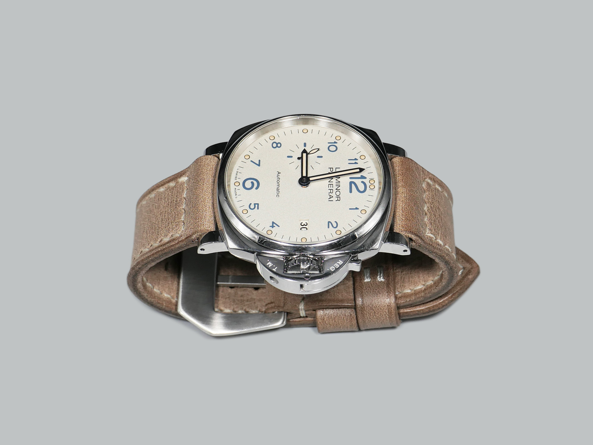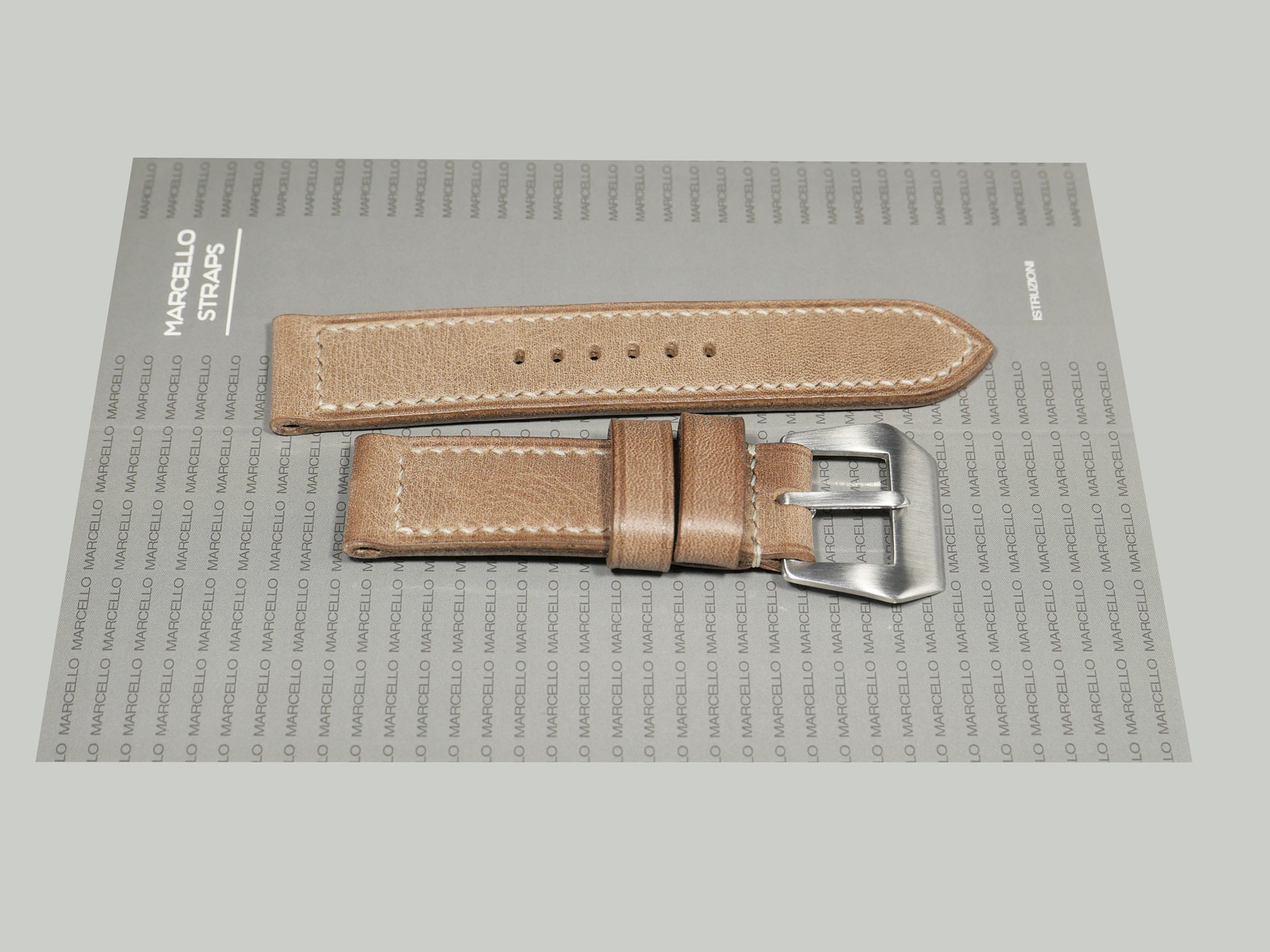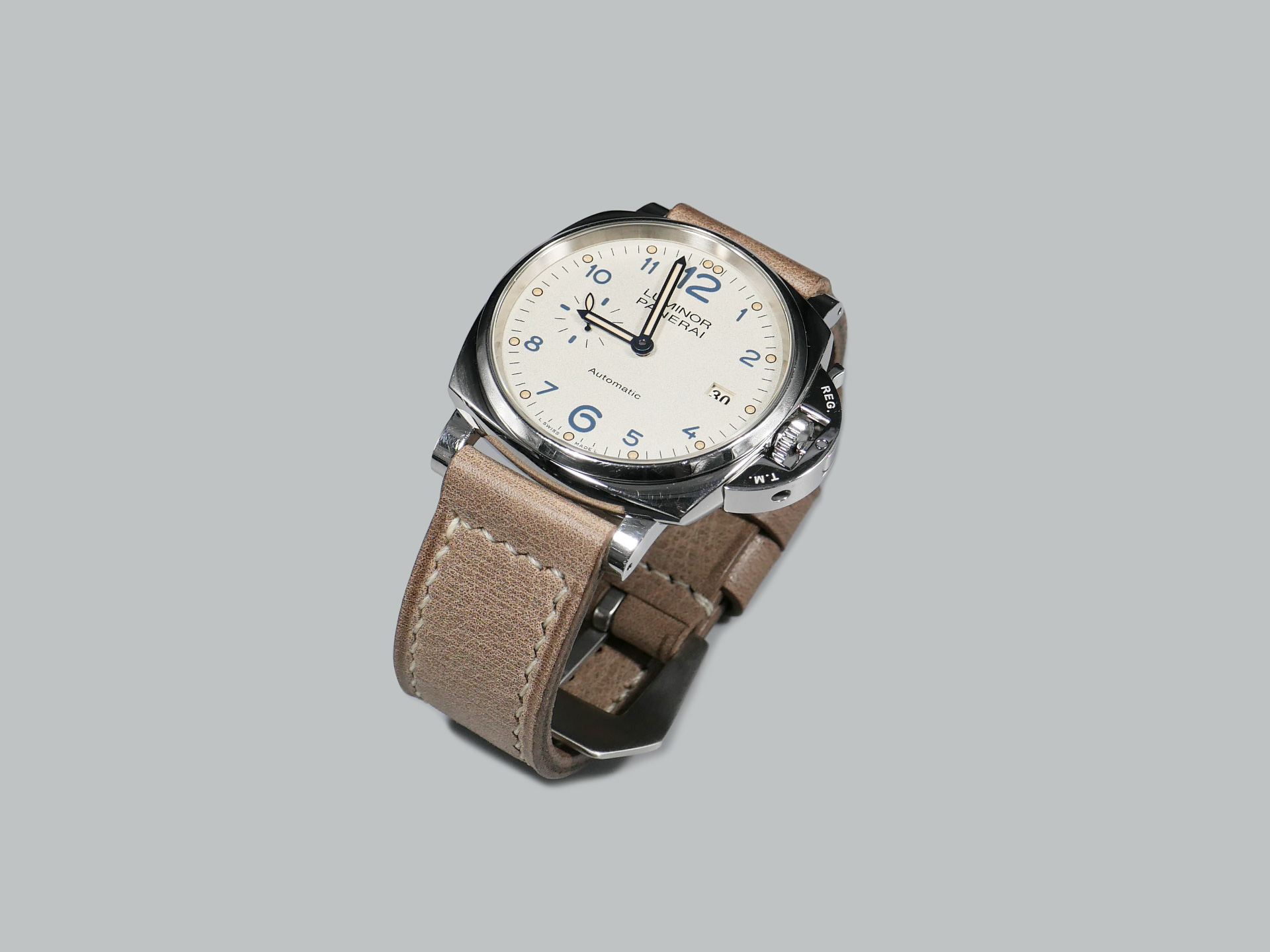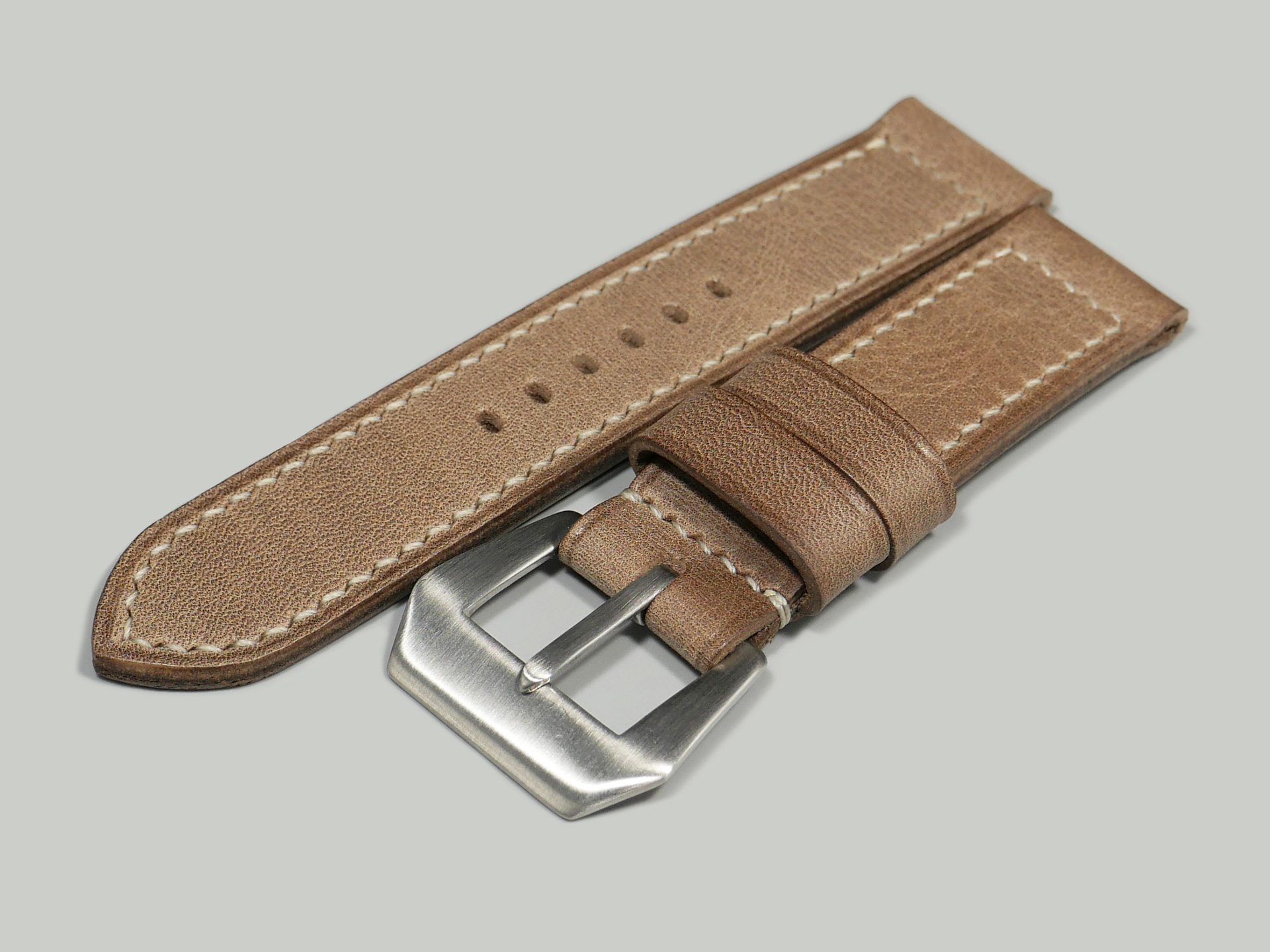 This strap comes with a stainless steel vintage-style brushed pin buckle sewn in place (pictured). Additional buckle options are available from the drop down menu. The strap shown in the photos measures 125/75, but additional sizes are available in the drop-down menu. In addition, each strap is meticulously punched by hand to create the pin buckle holes. Finally, the images display this handcrafted grey Panerai strap with the Panerai Luminor PAM00906.