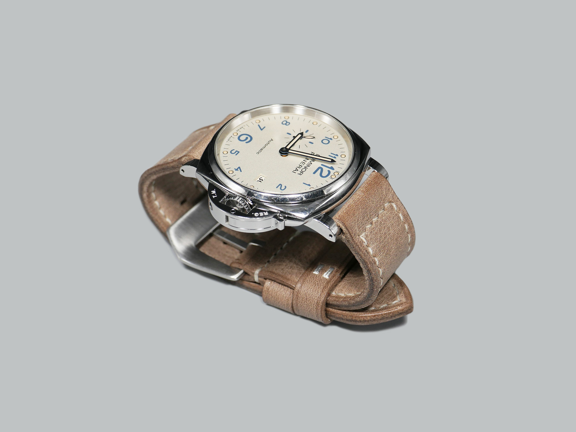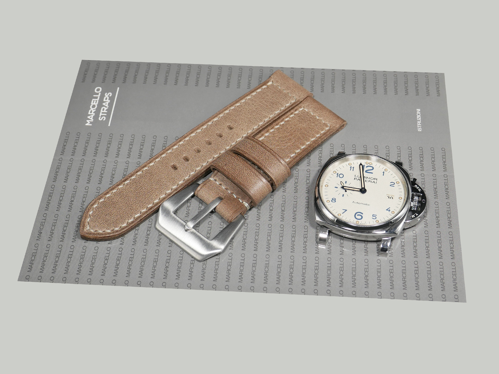 If you have a 45mm Luminor Due model, please check the 24mm strap section. When I make straps for the Luminor Due series, I take into consideration the much thinner case, and utilize leather of a lower thickness. This thinner leather sometimes allows for straps of a more rigid temper.