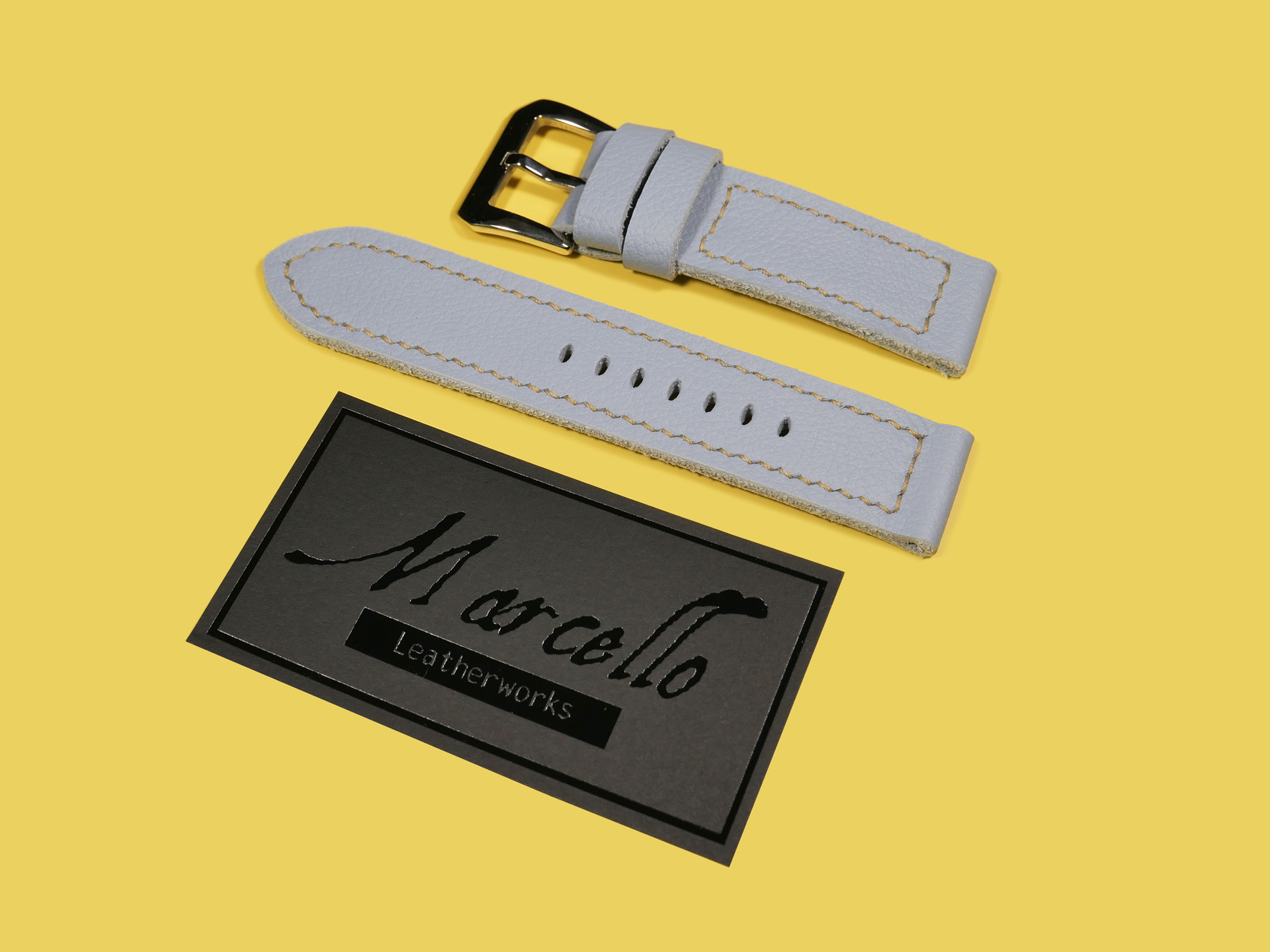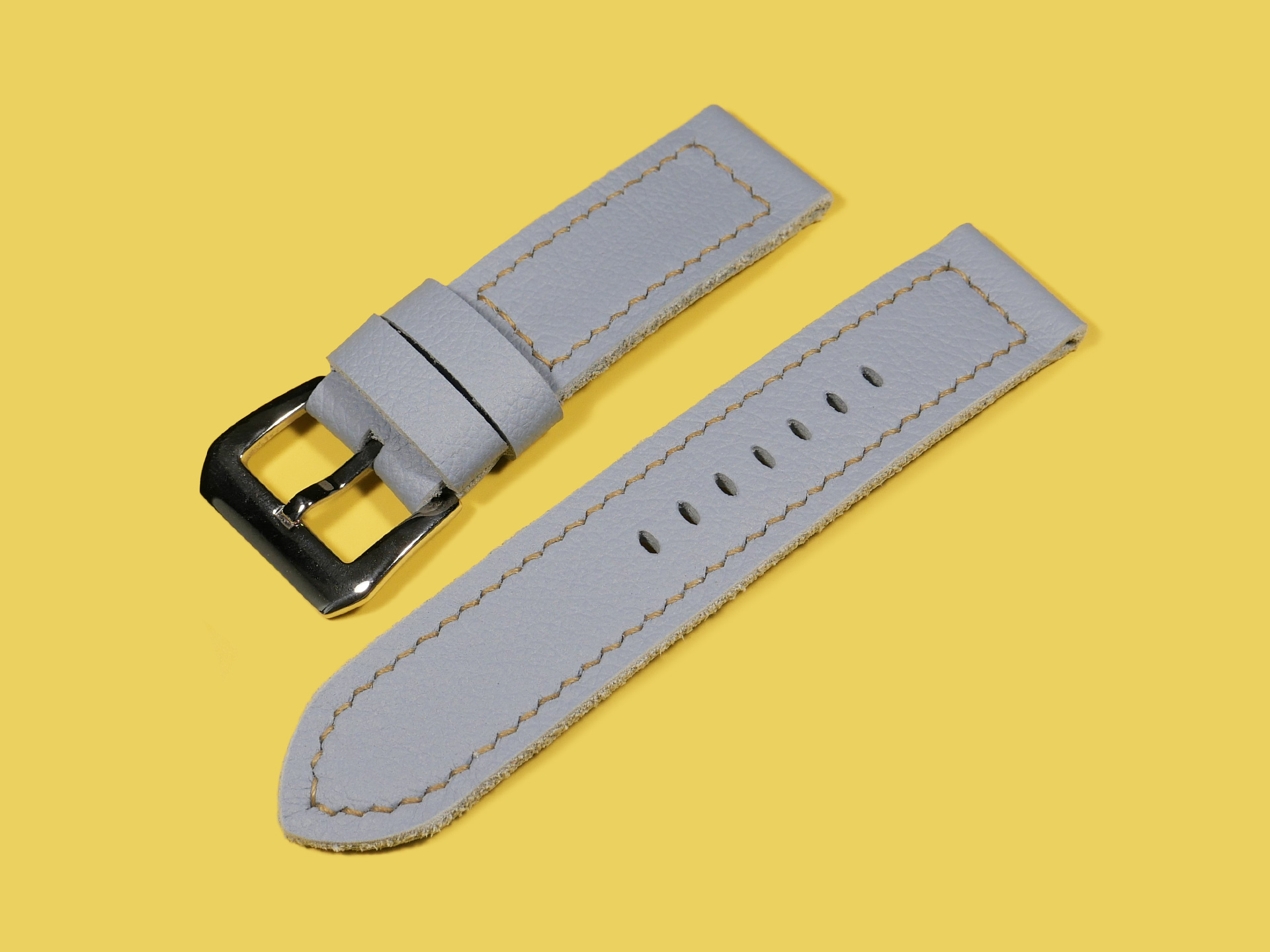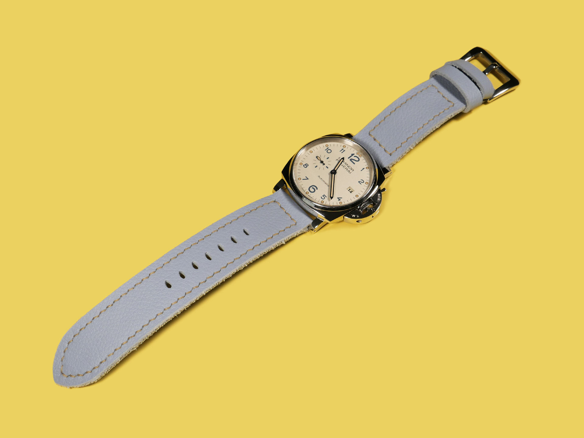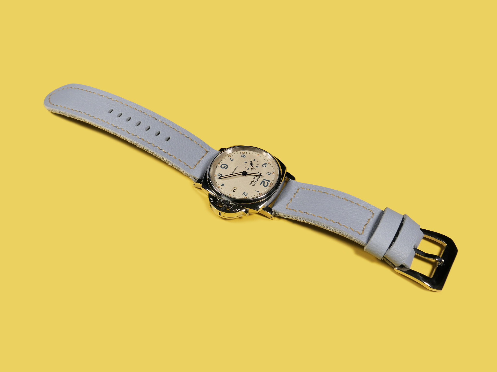 About the Leather:  I crafted this powder blue Panerai Due strap 100% by hand and hand stitched it as with all of my straps. This leather is the perfect thickness and temper for a 42mm Panerai Luminor Due model.  This strap features a uniform powder blue color with a milled finish.  For the stitching, I specifically utilized beige thread to match the indications on the PAM00906 sample watch.  Feel free to request any color stitching at no additional cost when ordering.  I performed the stitching on this strap in a boxed pattern.  I designed this Luminor Due strap with one floating keeper and one fixed.  This strap features a soft temper that hugs the wrist and is comfortable to wear all day long.