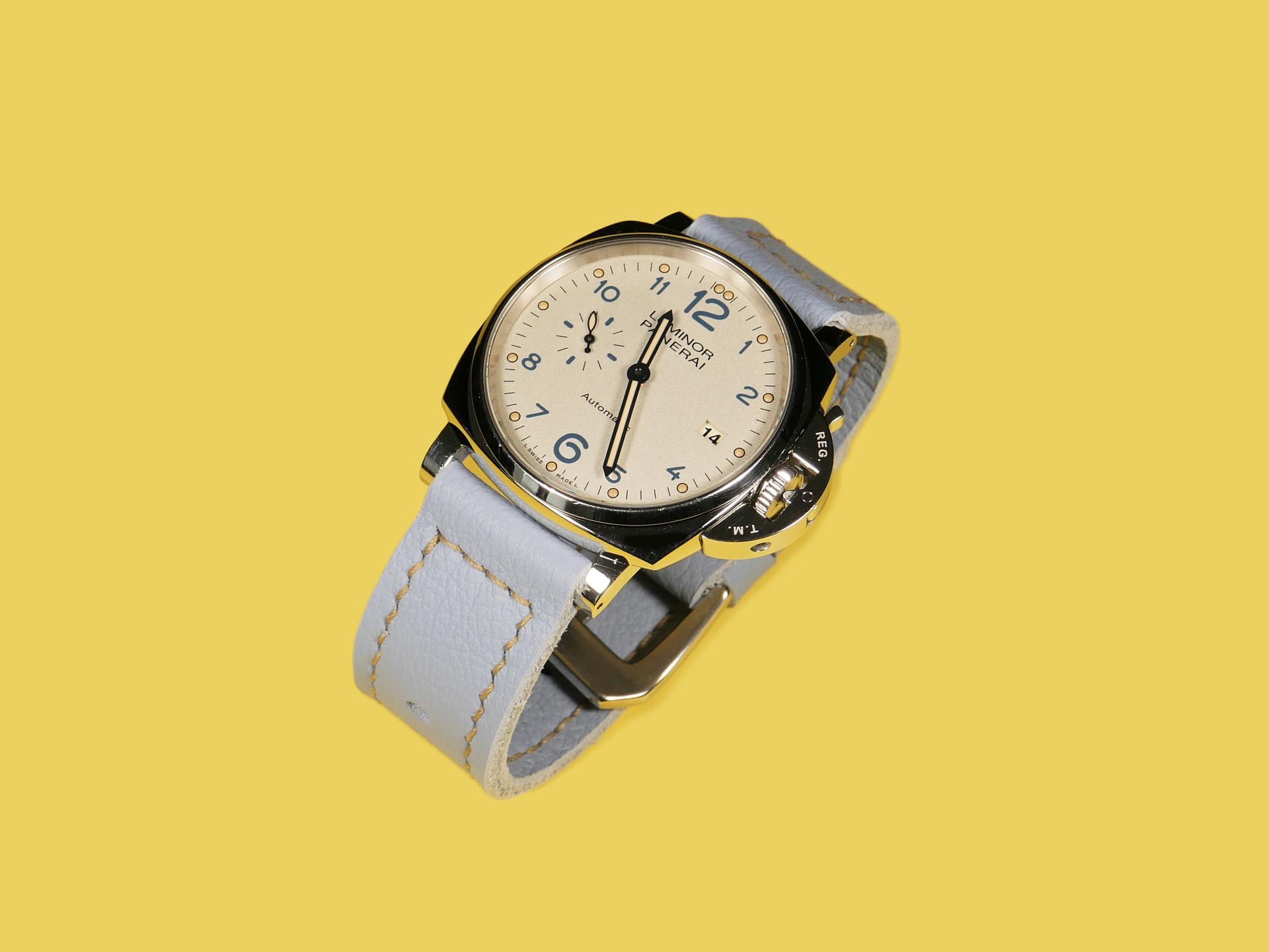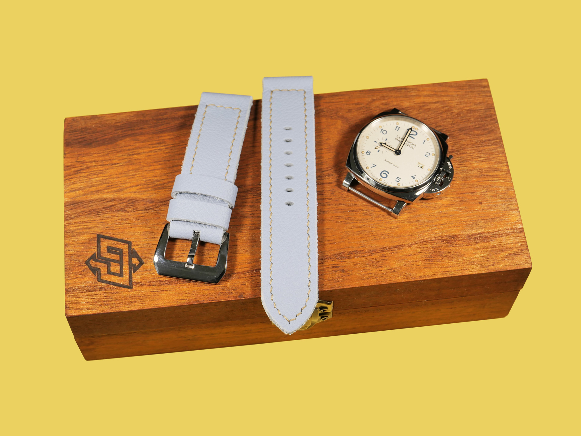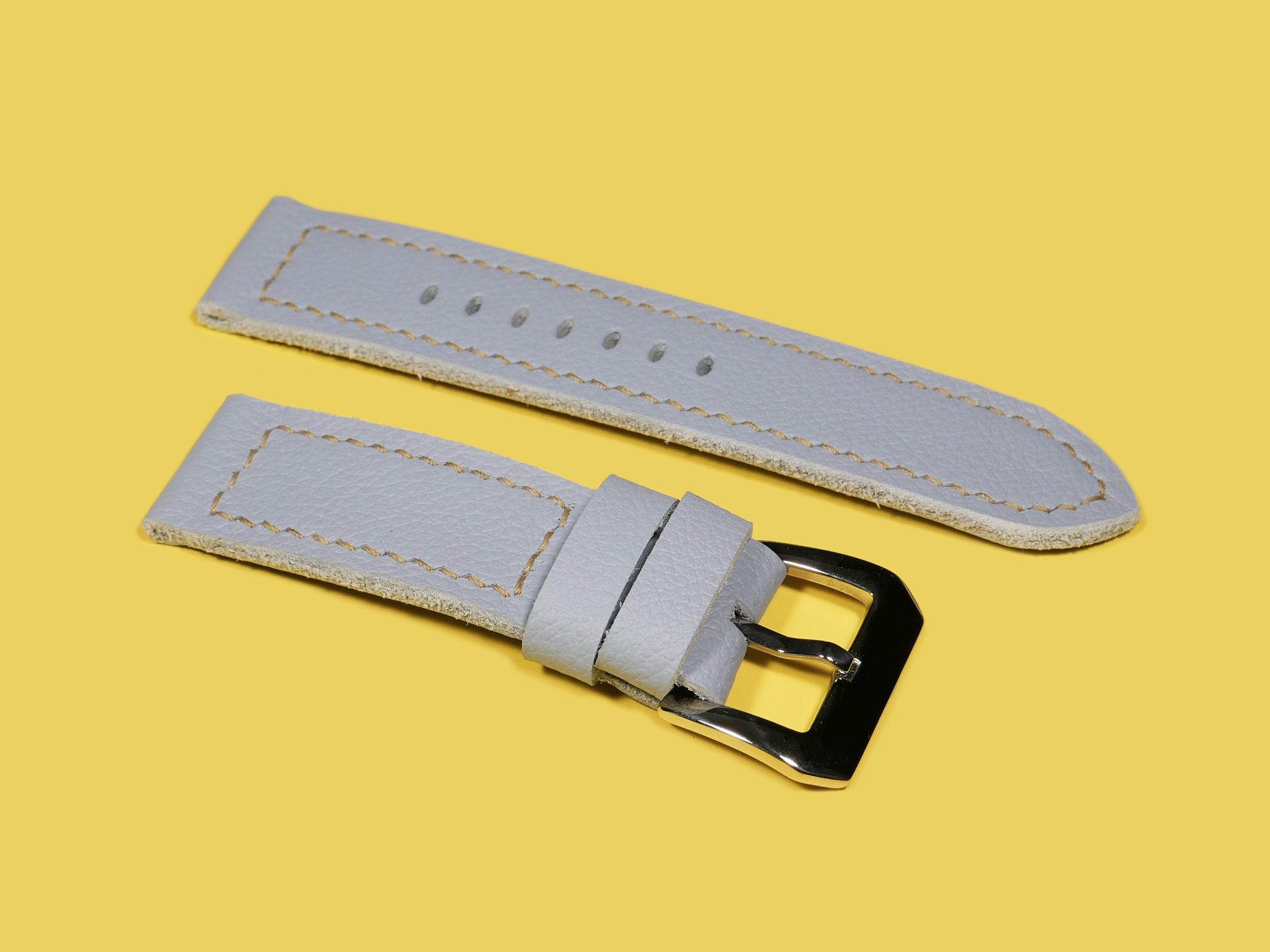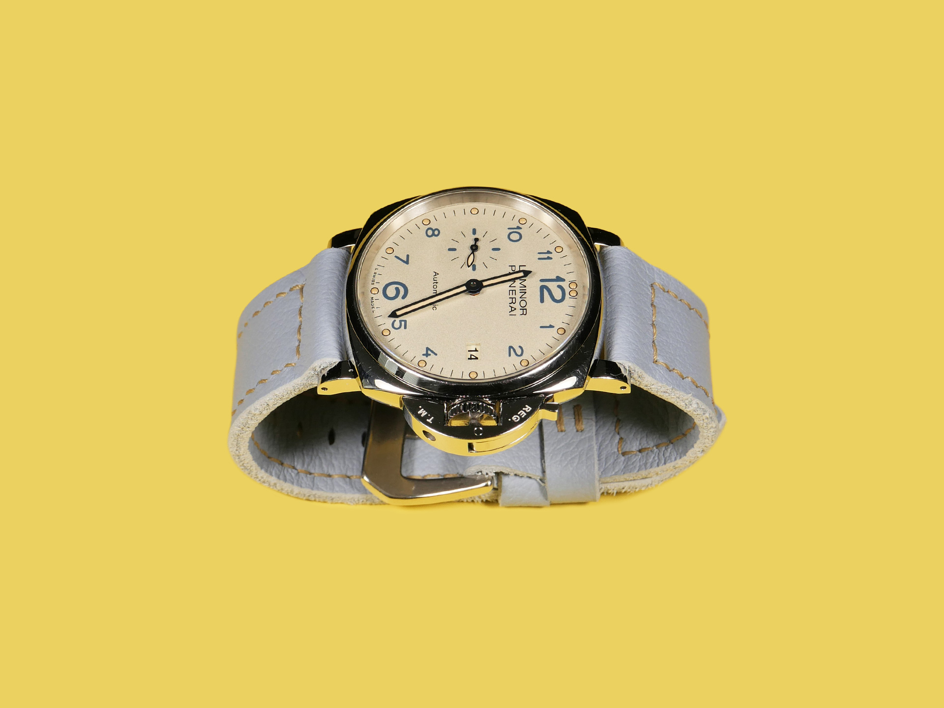 About the Leather:  I crafted this powder blue Panerai Due strap 100% by hand and hand stitched it as with all of my straps. This leather is the perfect thickness and temper for a 42mm Panerai Luminor Due model.  This strap features a uniform powder blue color with a milled finish.  For the stitching, I specifically utilized beige thread to match the indications on the PAM00906 sample watch.  Feel free to request any color stitching at no additional cost when ordering.  I performed the stitching on this strap in a boxed pattern.  I designed this Luminor Due strap with one floating keeper and one fixed.  This strap features a soft temper that hugs the wrist and is comfortable to wear all day long.