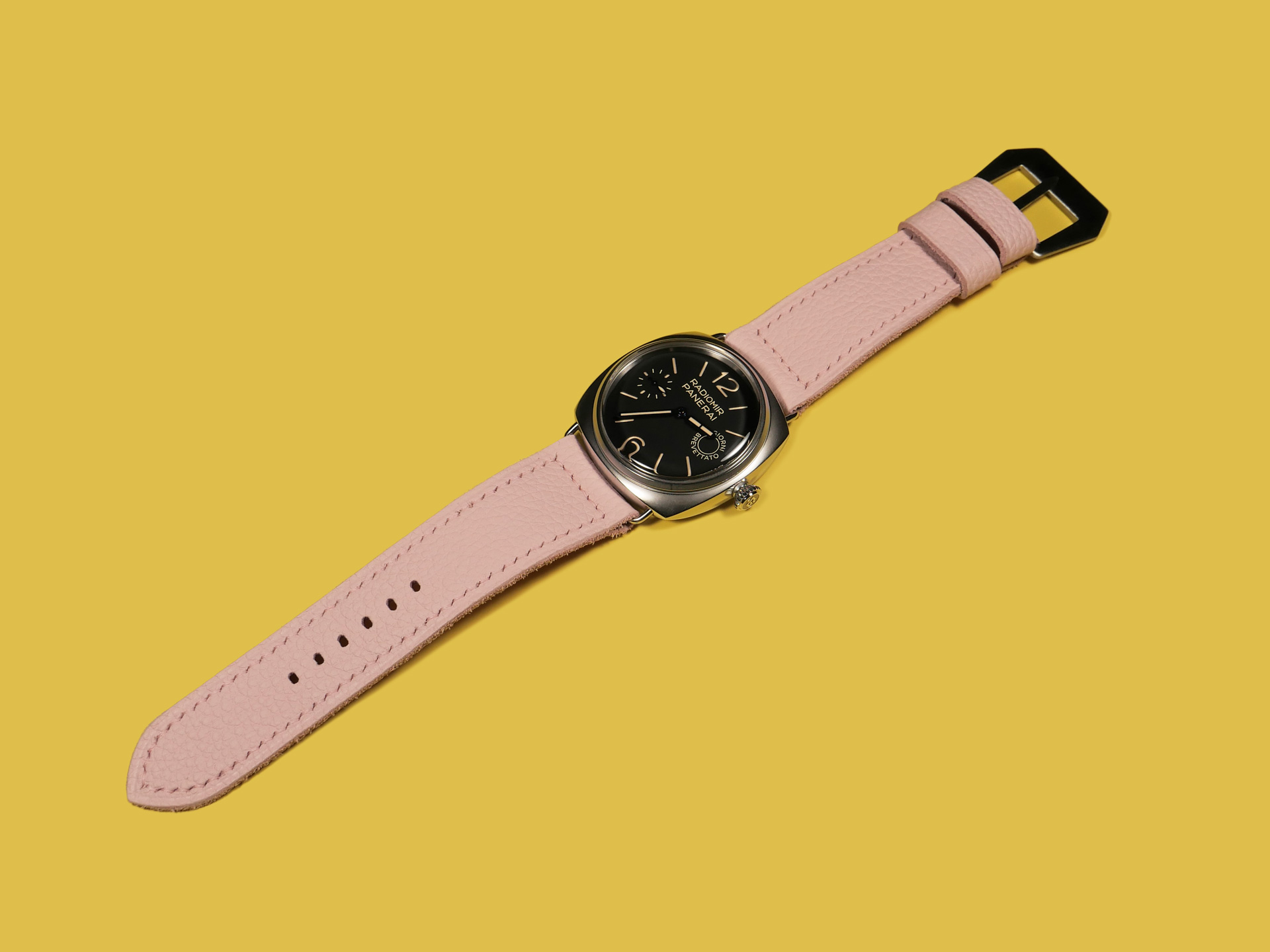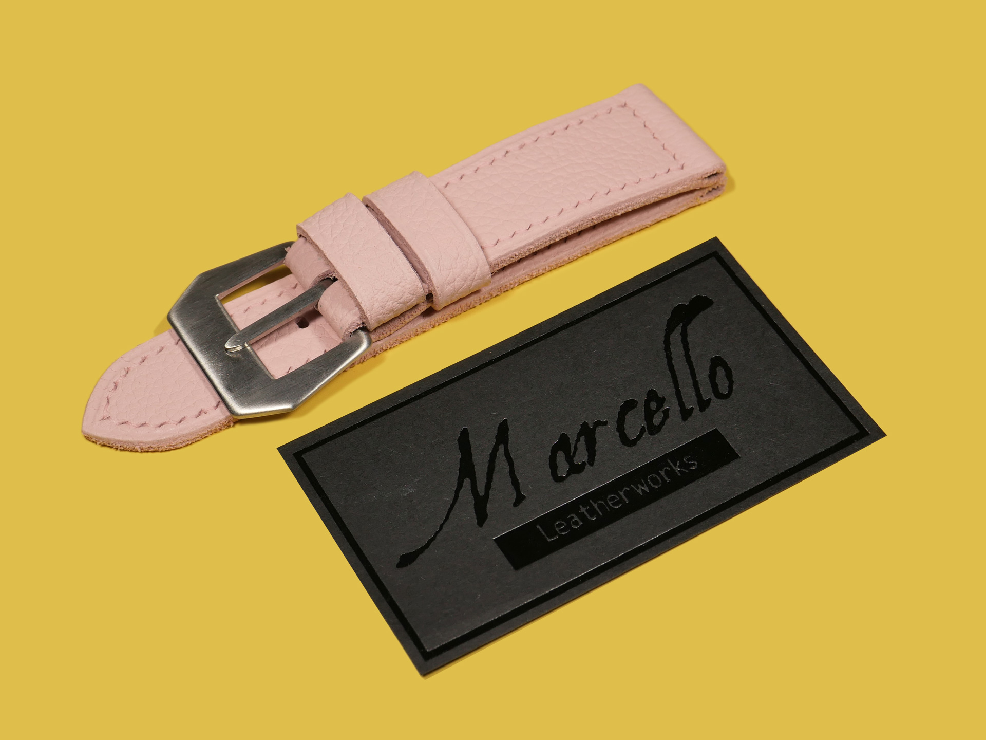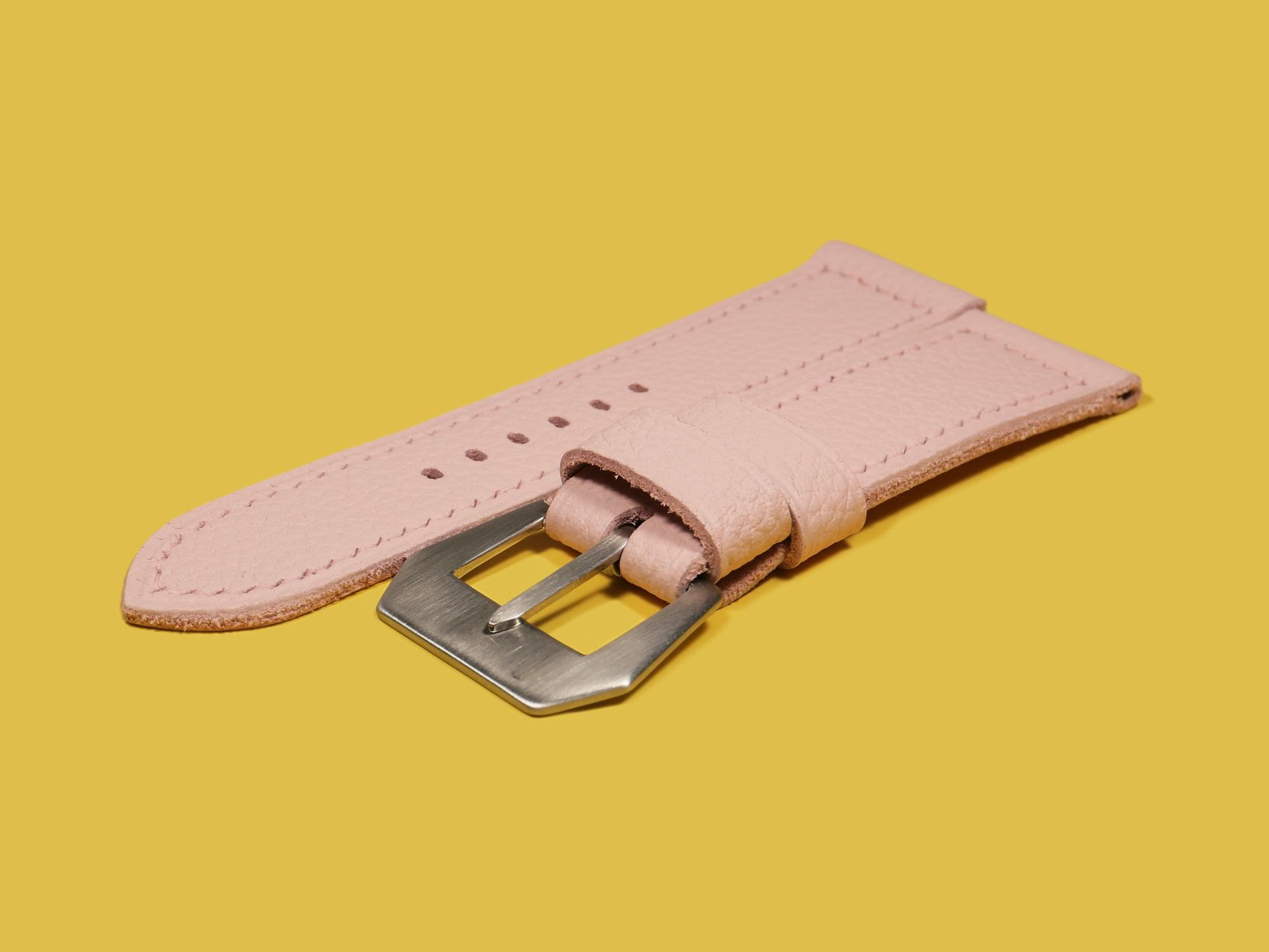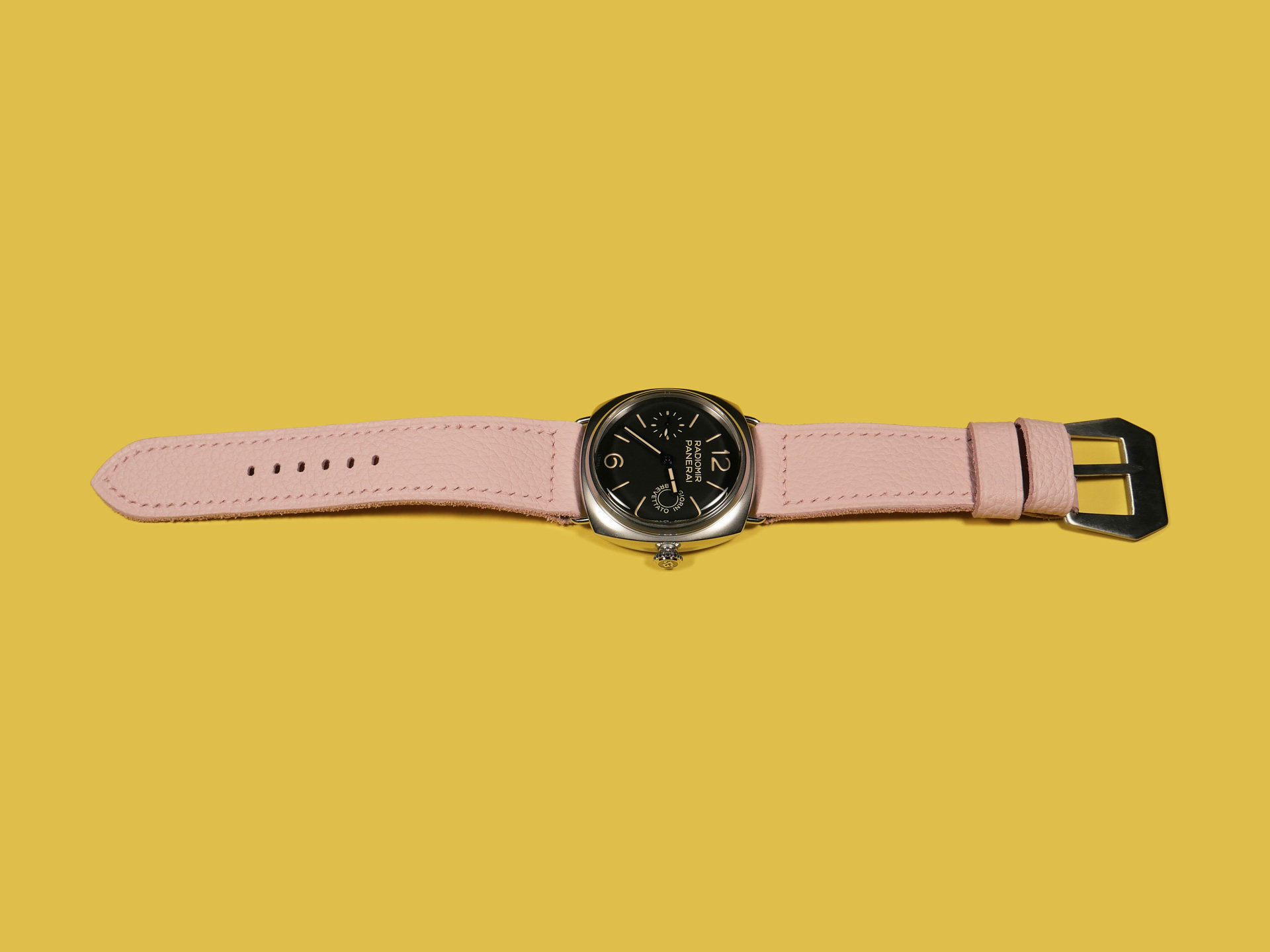 About the Leather: This pink Radiomir strap is 100% handcrafted, as with all of my straps. To start with this project, I selected a matte pink chrome tanned leather. This leather has a milled surface, giving it a nice soft texture. As with all Radiomir straps that I make, the taper is 26-22 (sometimes 27mm at the base). This means that the strap can also fit your favorite 47mm Luminor models as well. I selected a color matched thread for the stitching.
