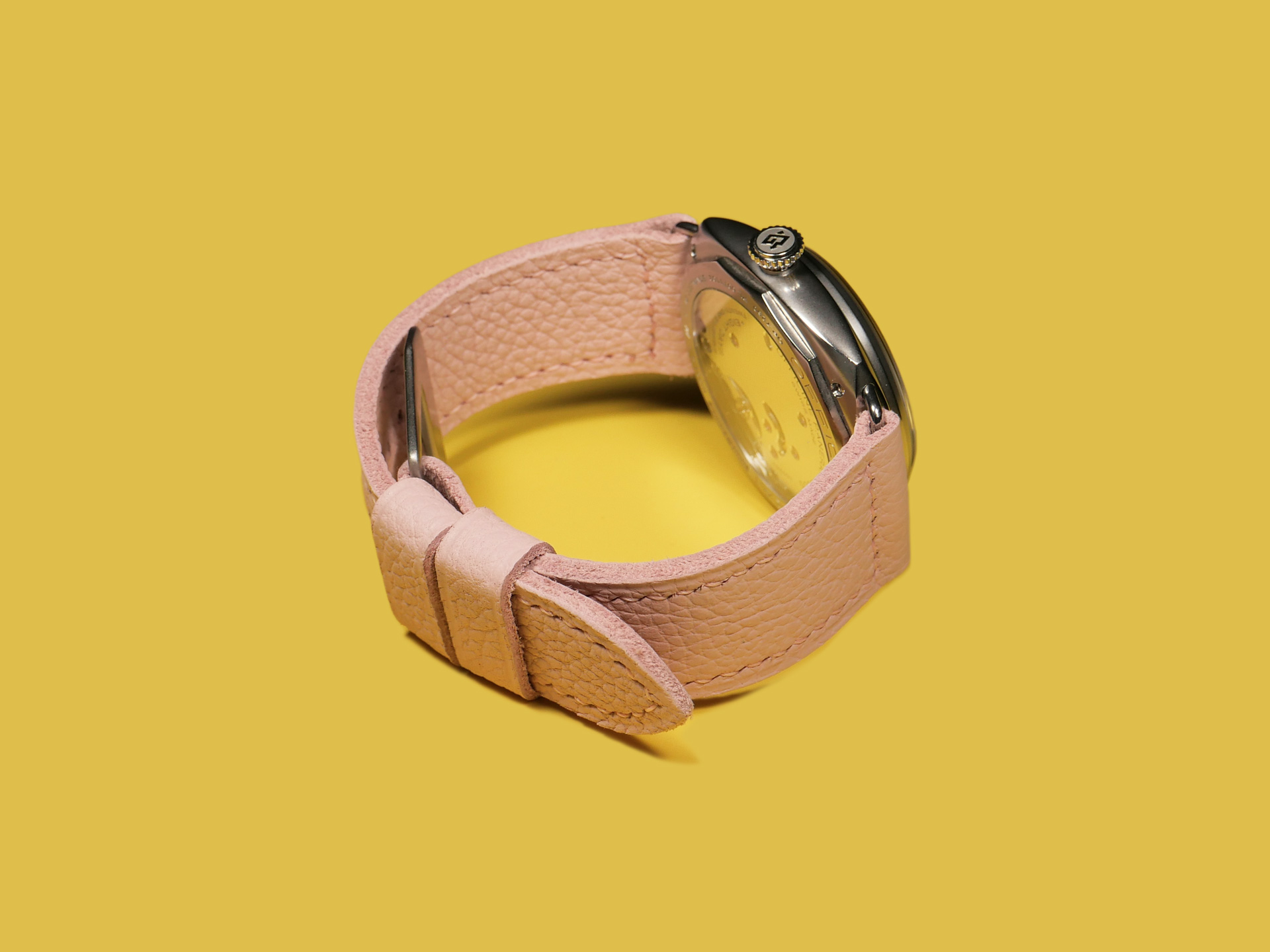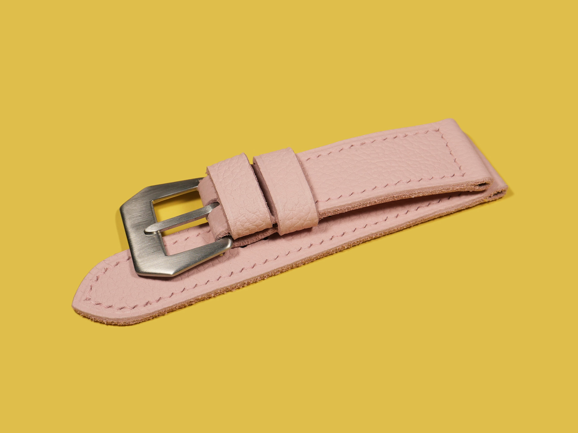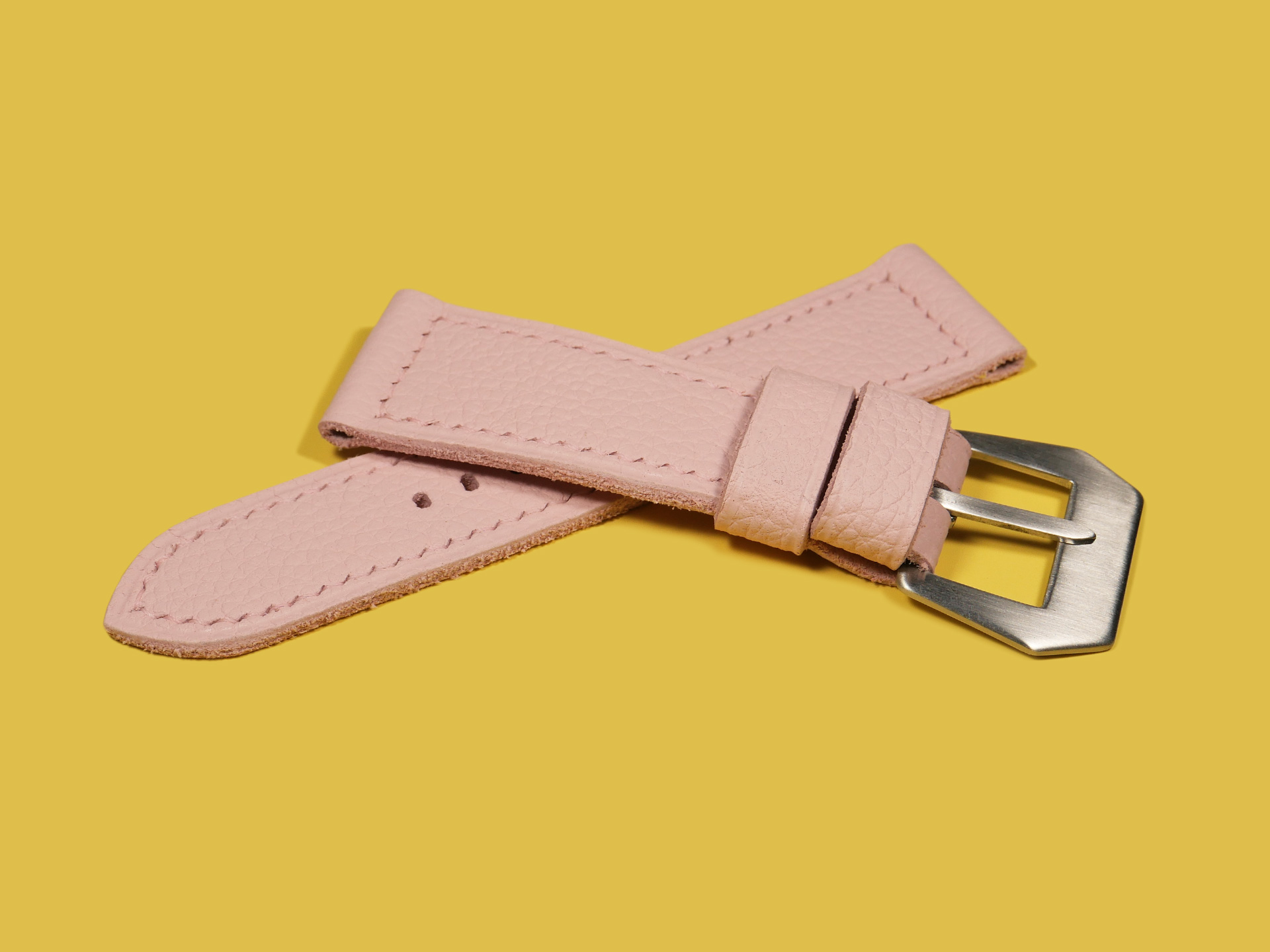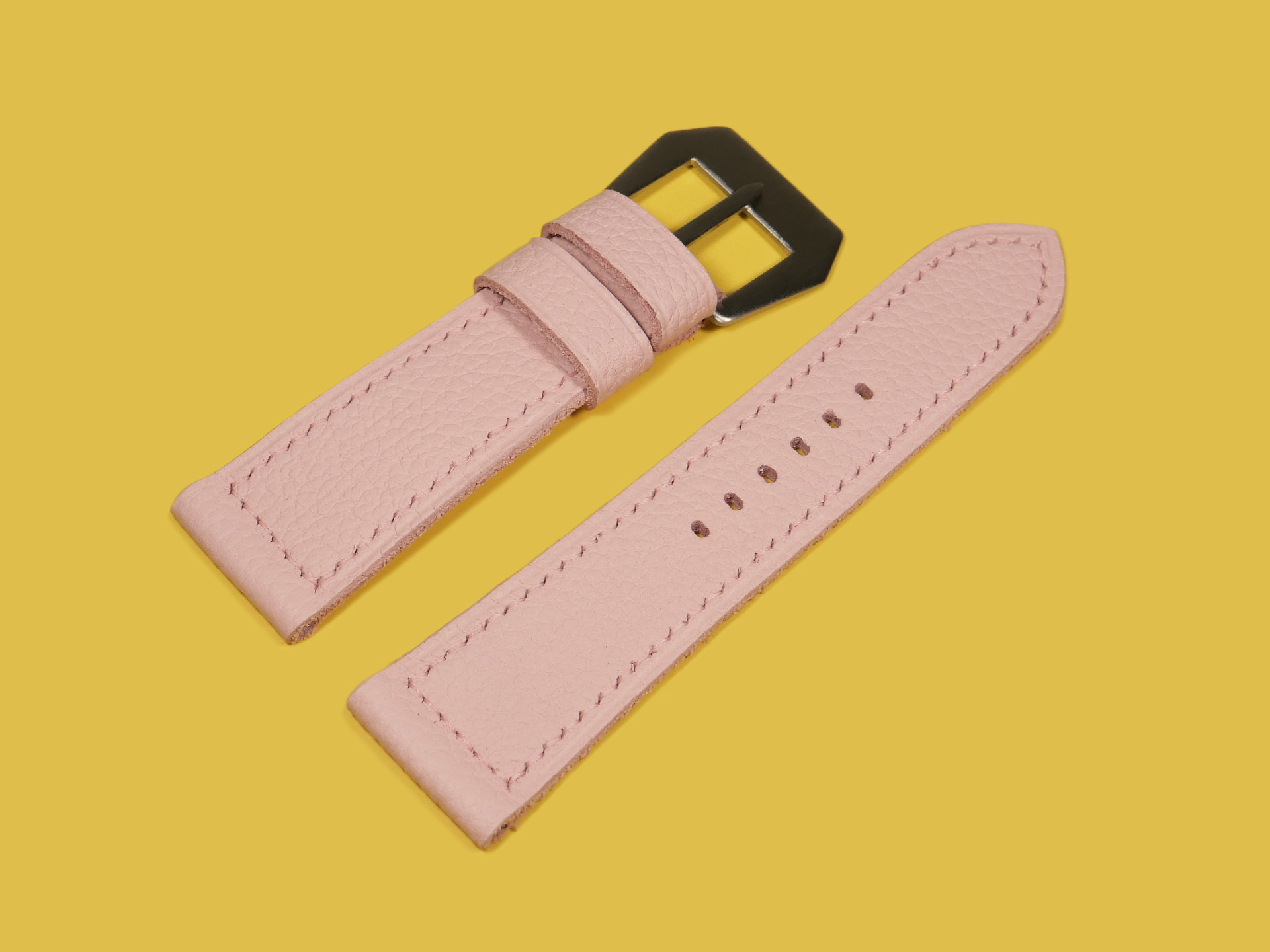 About the Leather: This pink Radiomir strap is 100% handcrafted, as with all of my straps. To start with this project, I selected a matte pink chrome tanned leather. This leather has a milled surface, giving it a nice soft texture. As with all Radiomir straps that I make, the taper is 26-22 (sometimes 27mm at the base). This means that the strap can also fit your favorite 47mm Luminor models as well. I selected a color matched thread for the stitching.