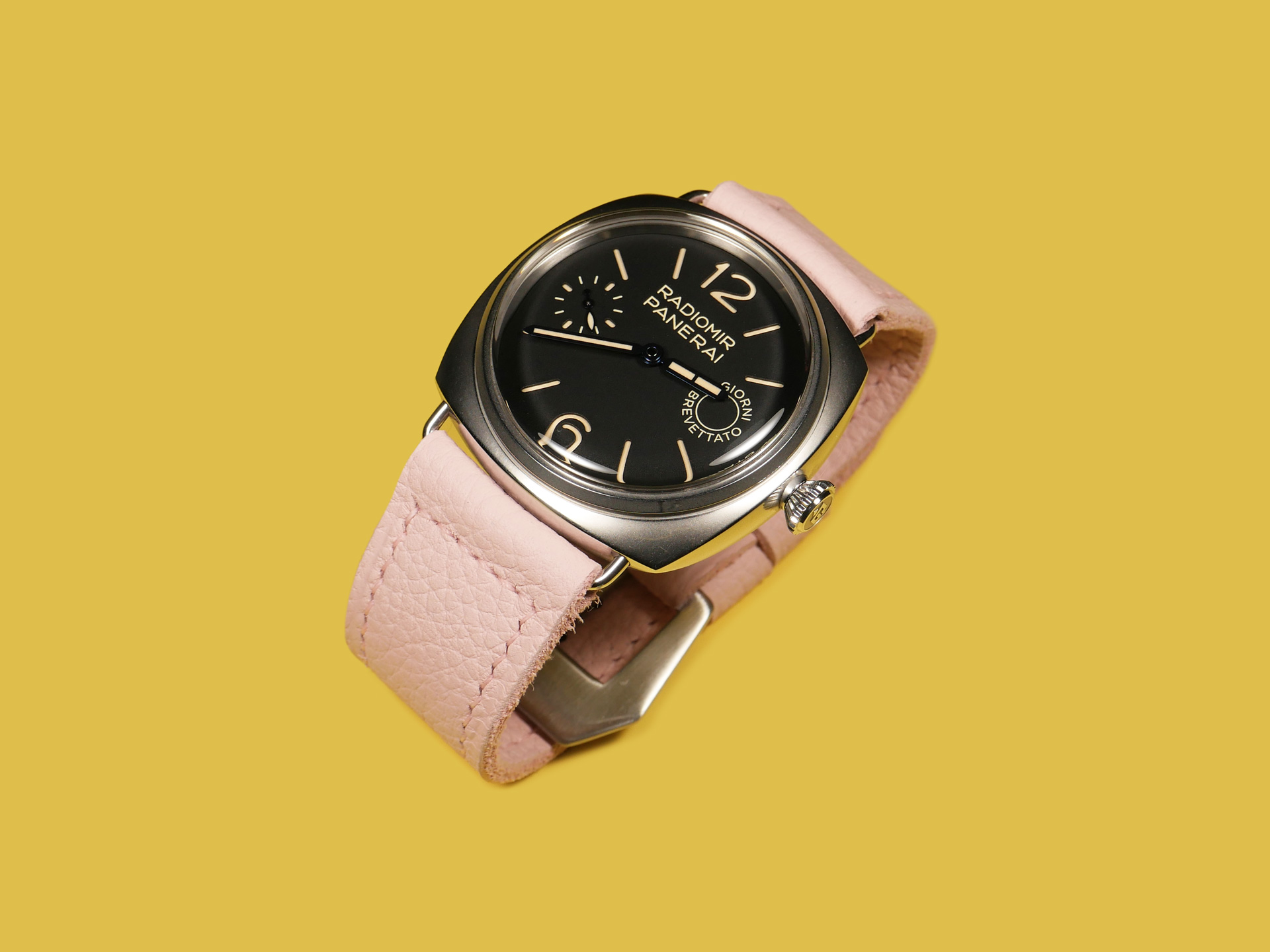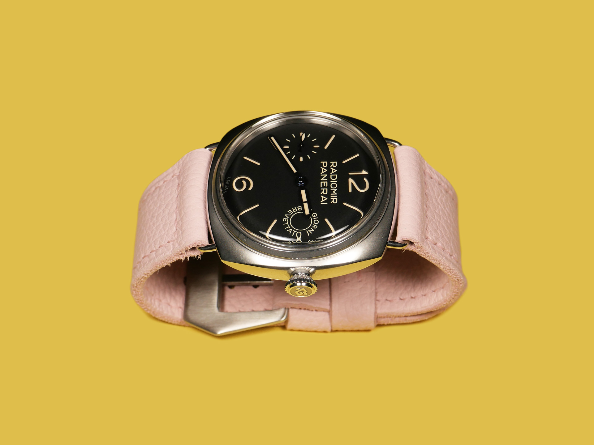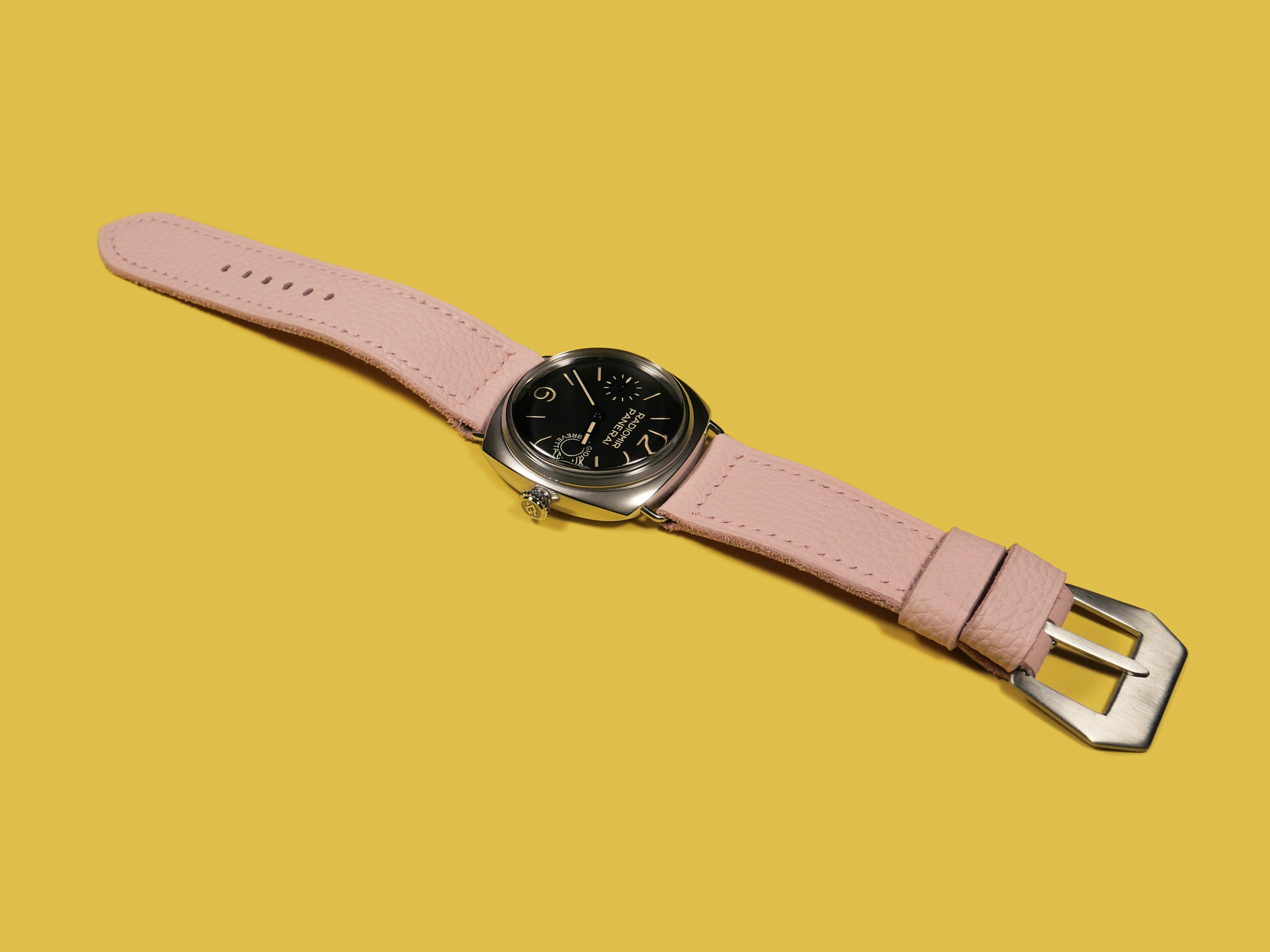 I designed this strap with one floating keeper and one fixed. The edges of this strap feature a soft crease. Though designed for a vintage style pin buckle (as pictured), you may select from a variety of different buckles from the drop down menu. As with all of my straps, nearly any aspect can be customized for you. Pictured above, you may see this pink Radiomir strap on the Panerai Radiomir 8 Days PAM00992. *For reference, the strap in the photos measures 125-80.